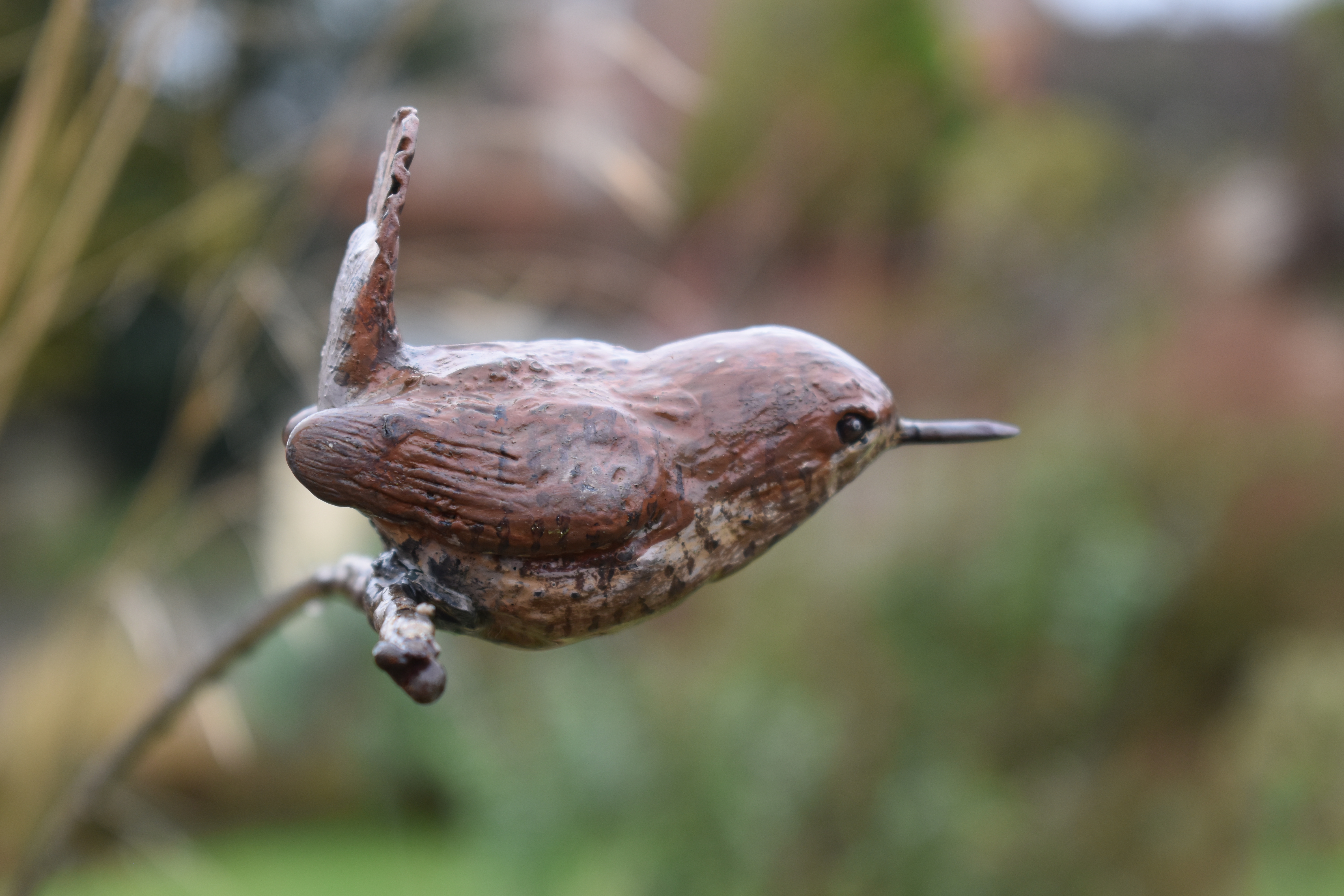 A much smaller sculpture is a life sized wren which moves constantly on its gently moving bent metal stem allowing the wren to sway at our head height with the slightest breeze. He is very popular with our garden visitors. After rain he sports a water droplet right at the tip of his beak! Such a charmer!