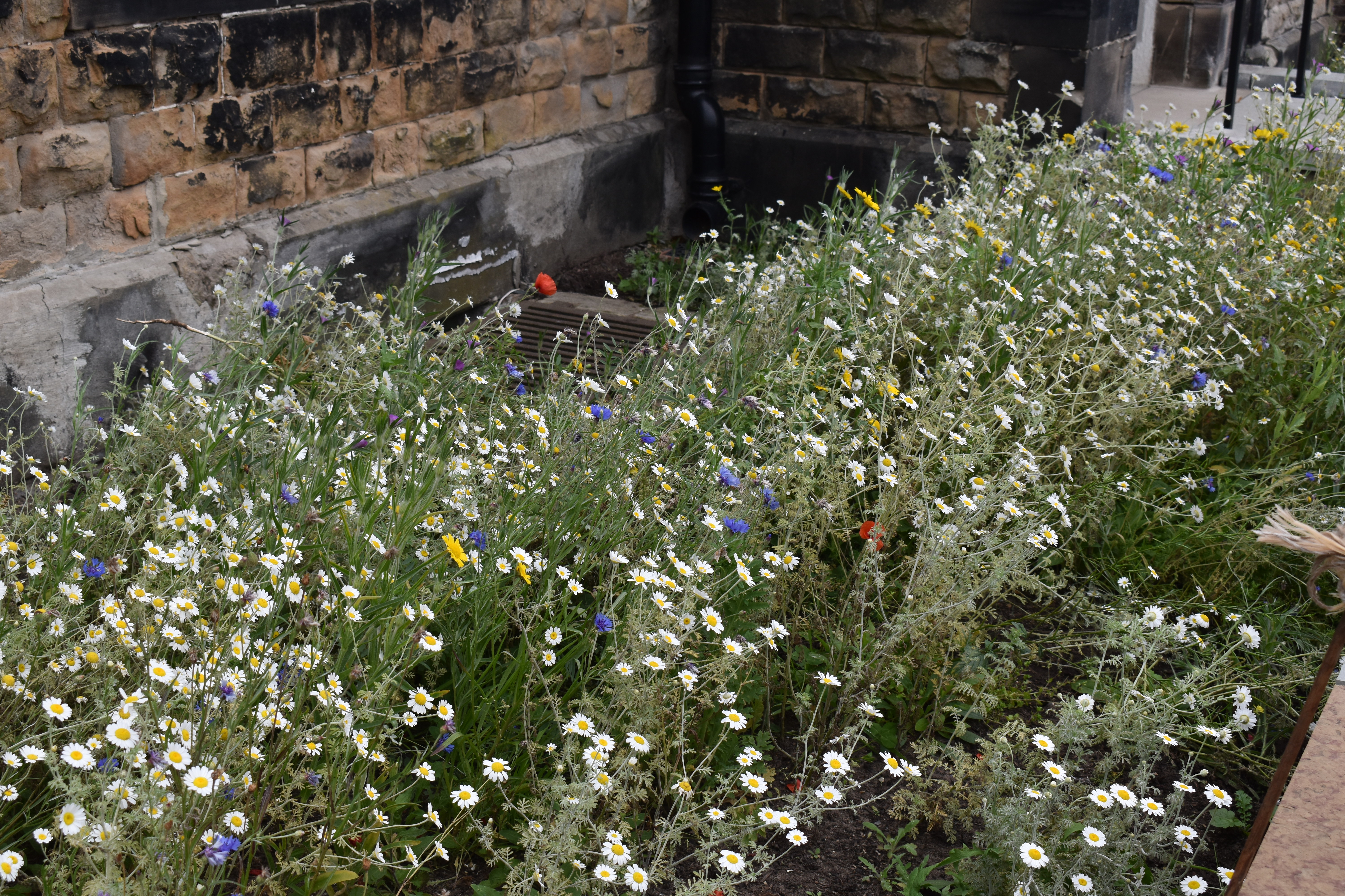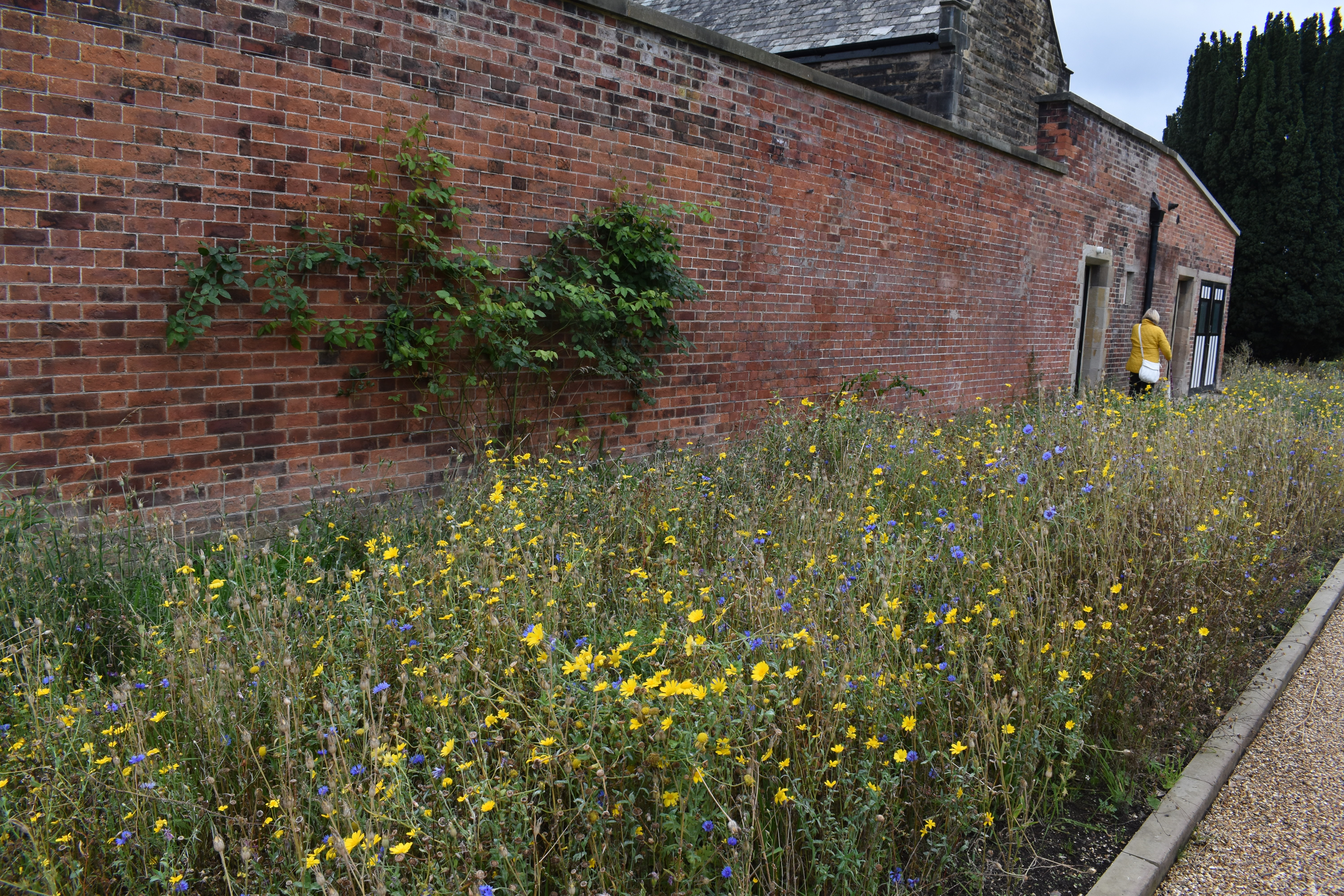 We left the education community area wandered through what would become an orchard and arrived at a large stone built house badly blackened by pollution from the past. The planting around it included perennials and wildflower meadows.