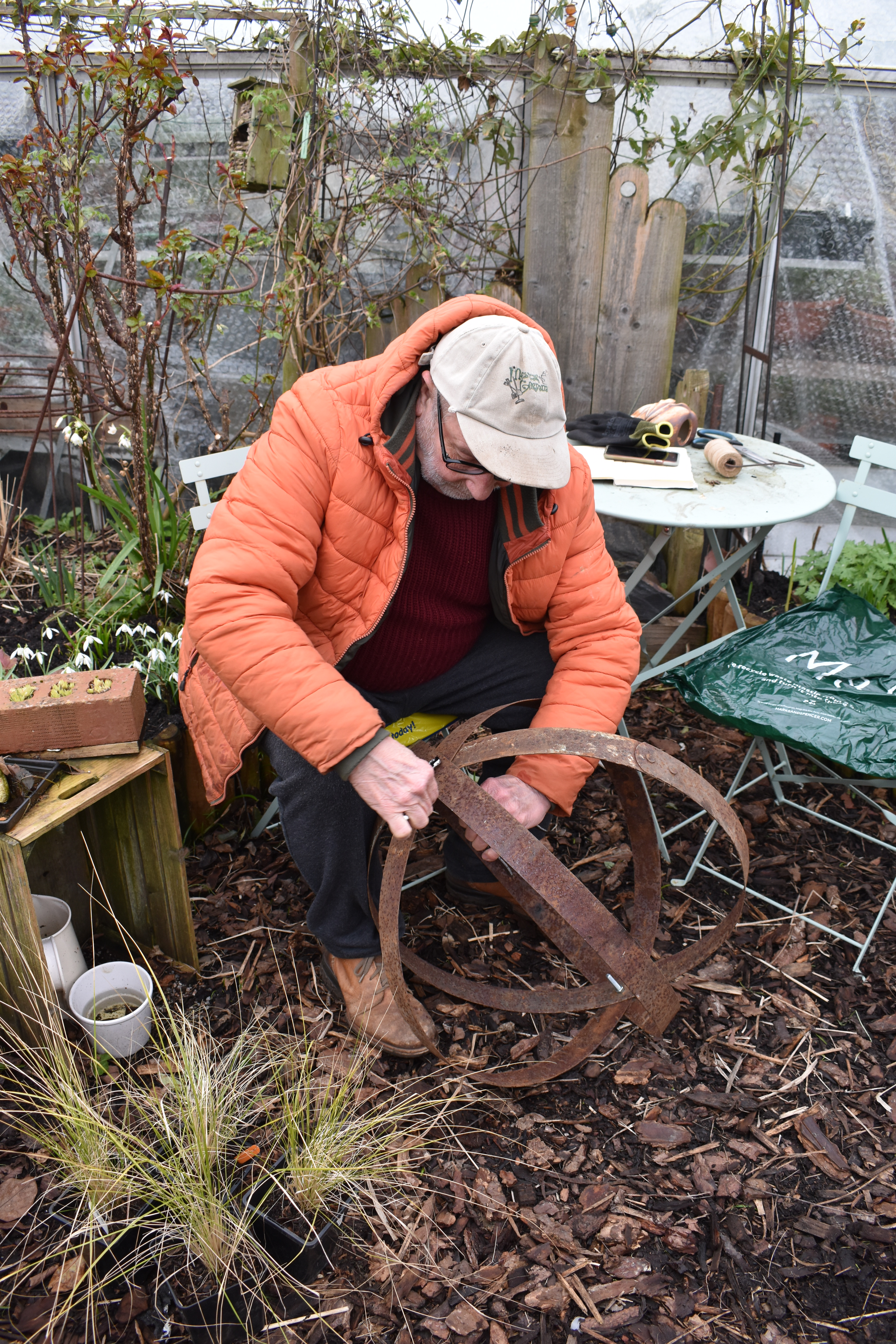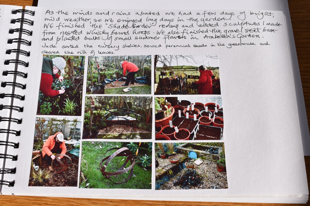 On the opposite page I looked at the garden tasks were worked on early in March. I noted, “As the winds and rains abated we had a few days of bright, mild weather, so we enjoyed long days in the garden. We finished the ‘Shade Border’ revamp and added sculptures I had made from rusted whisky barrel hoops. We also finished gravel seat base and planted bulbs of small summer flowers in ‘Arabella’s Garden’. Jude sorted out the nursery shelves, sowed seeds of herbaceous perennials in the greenhouse and cleared the rill of dead leaves.”