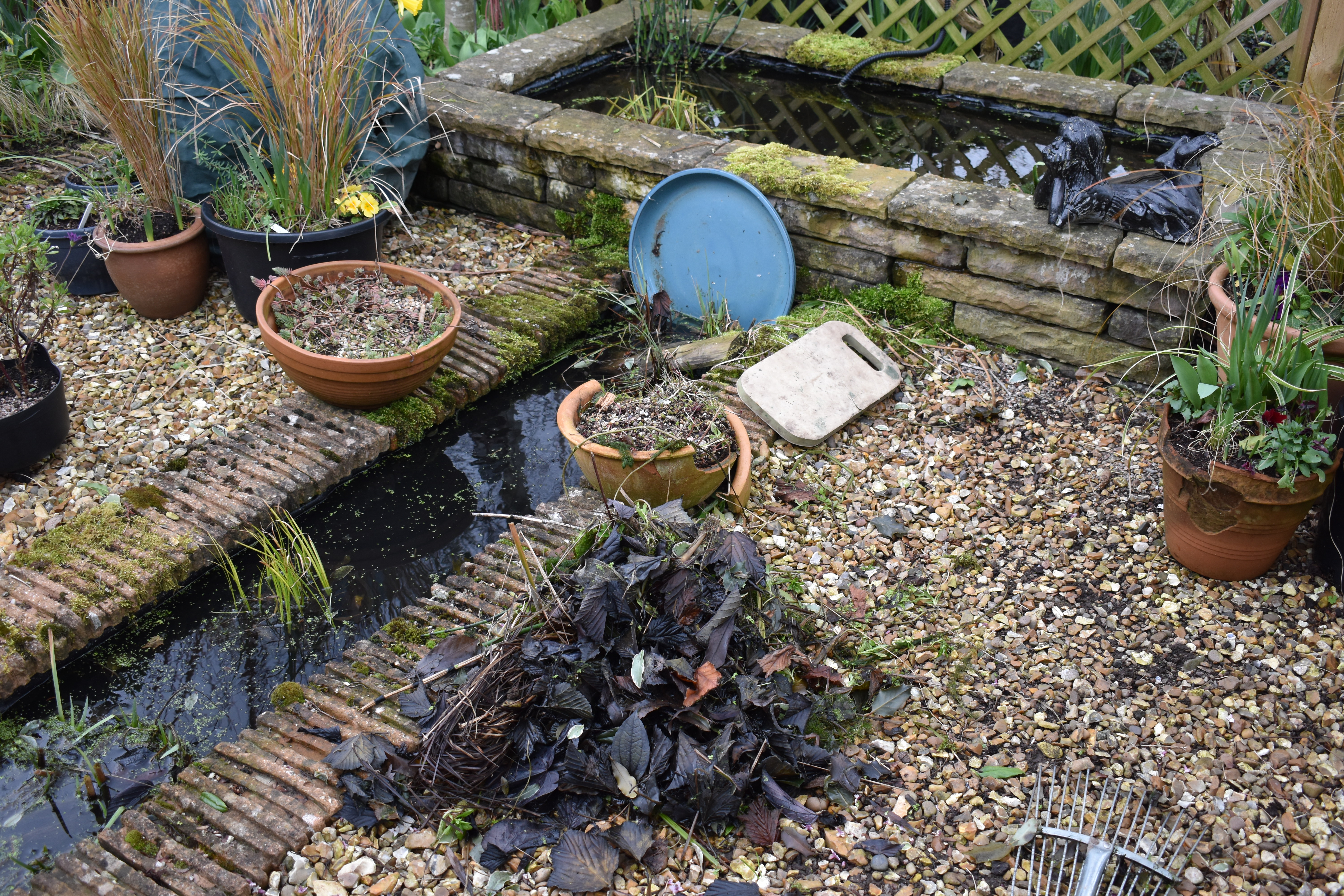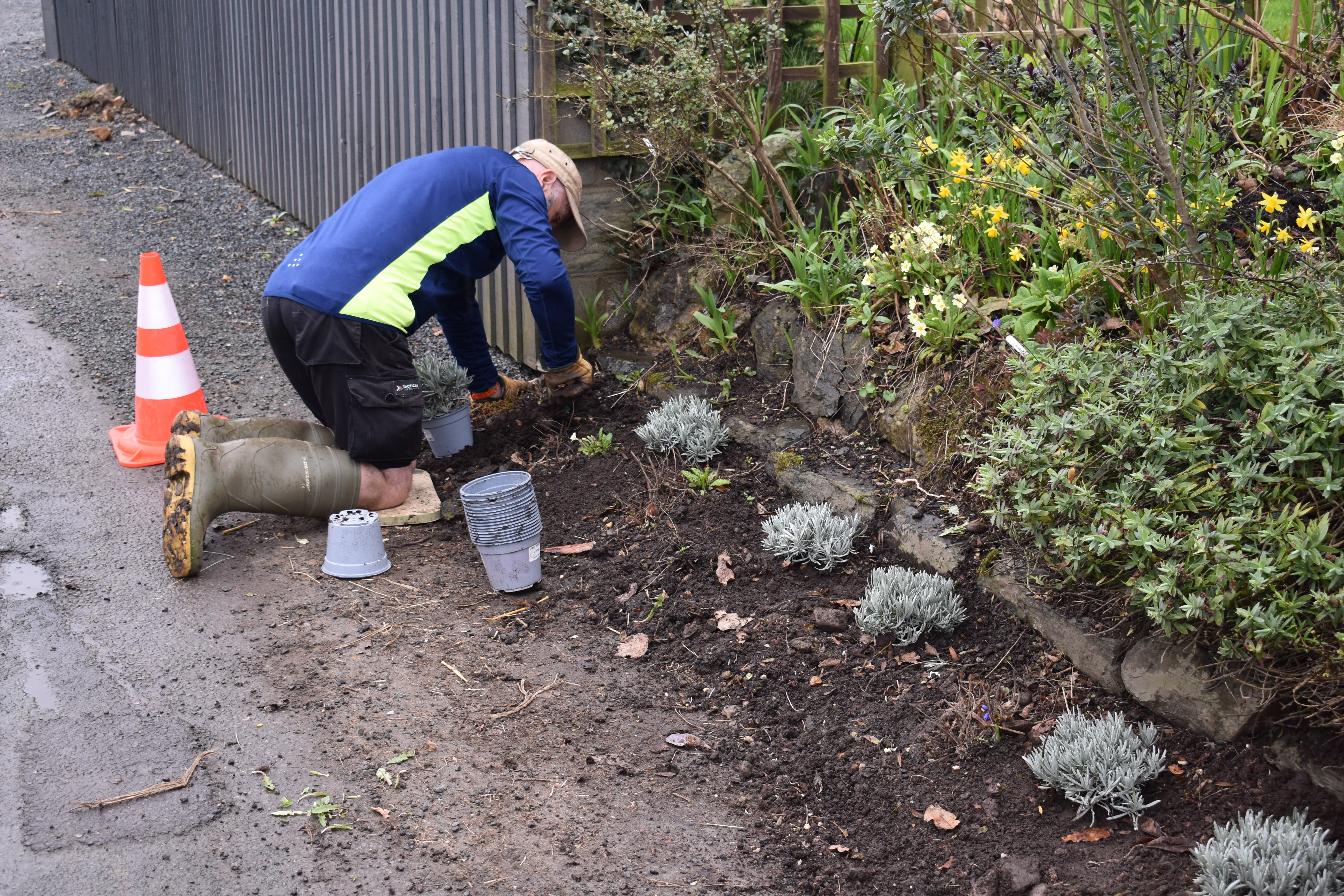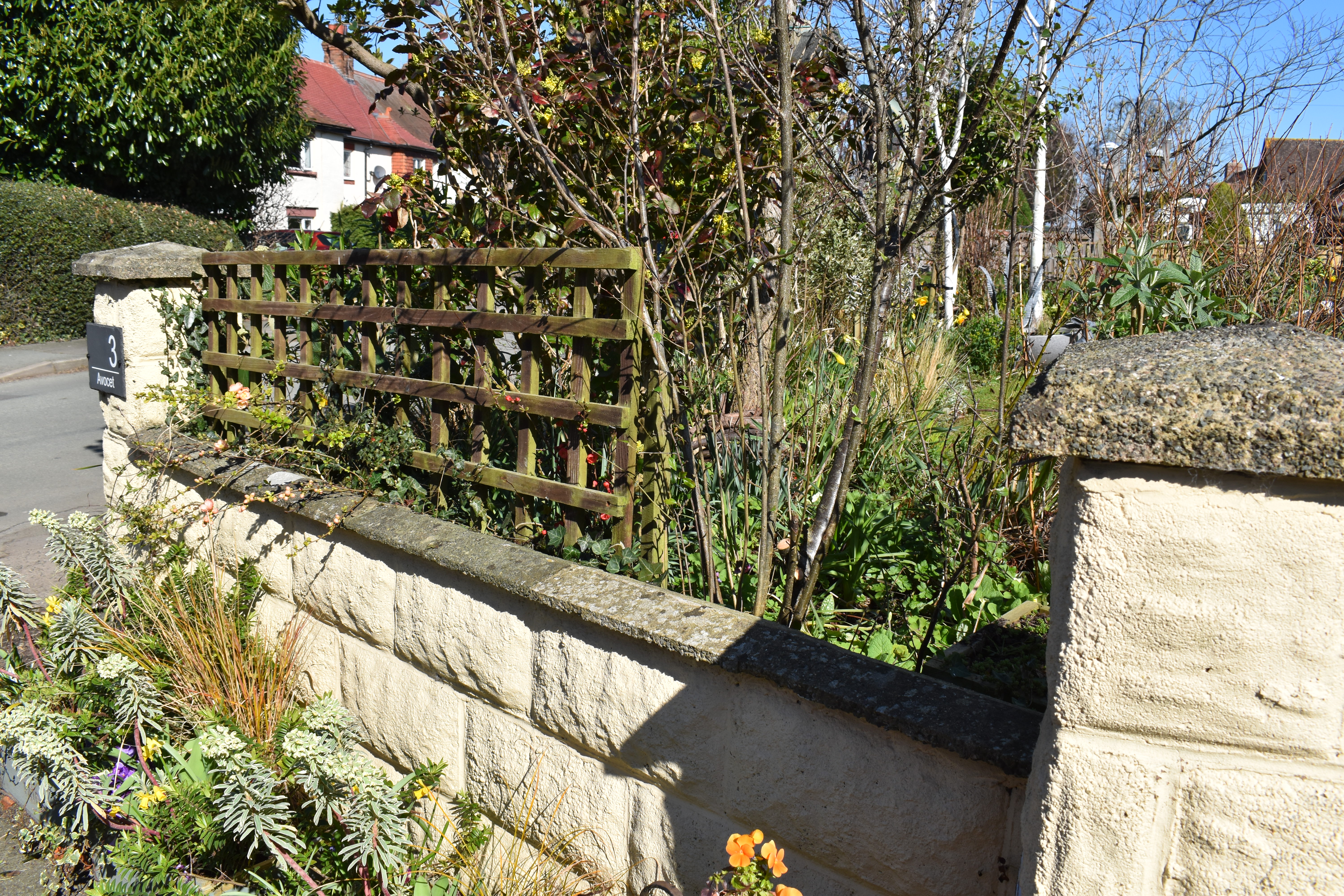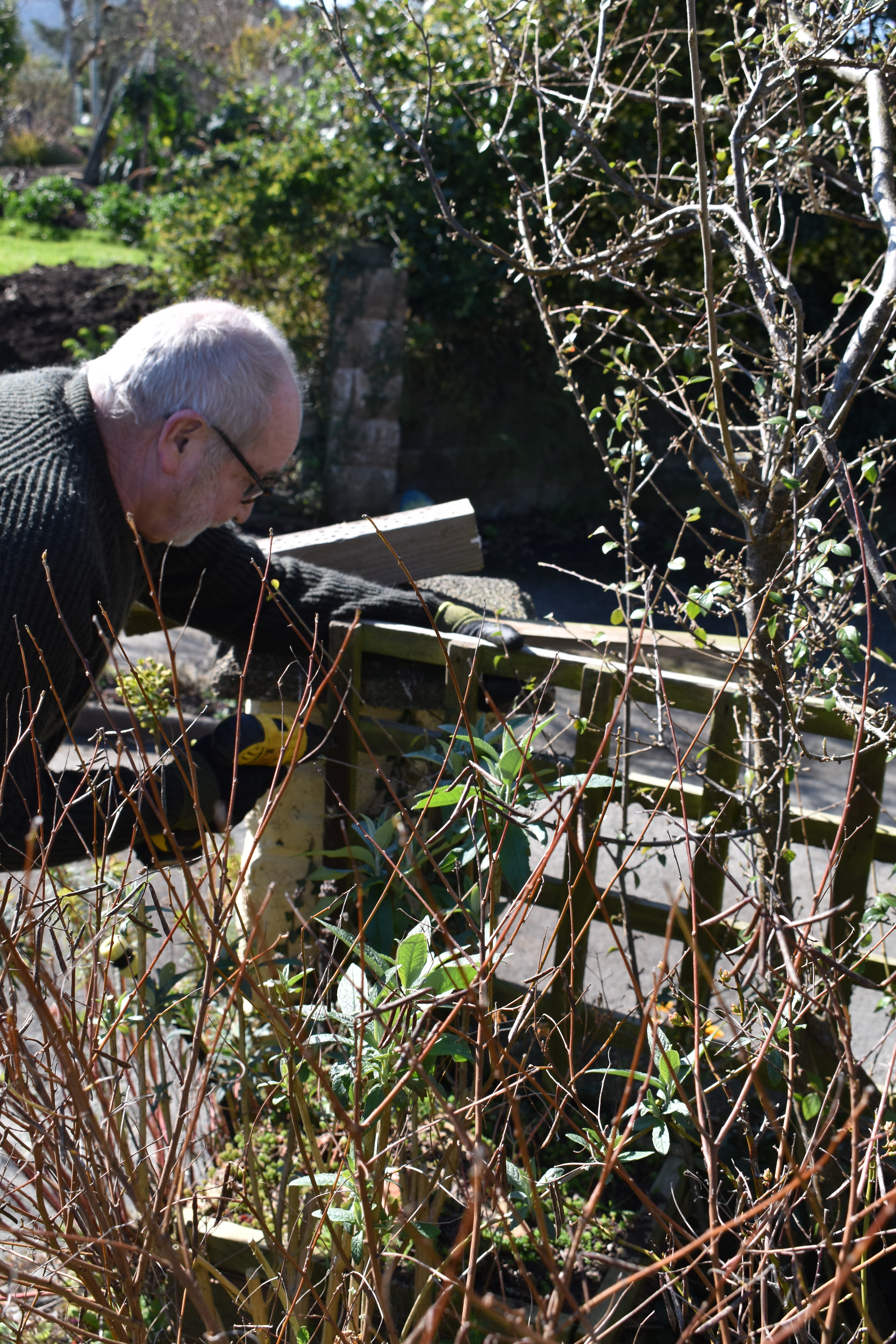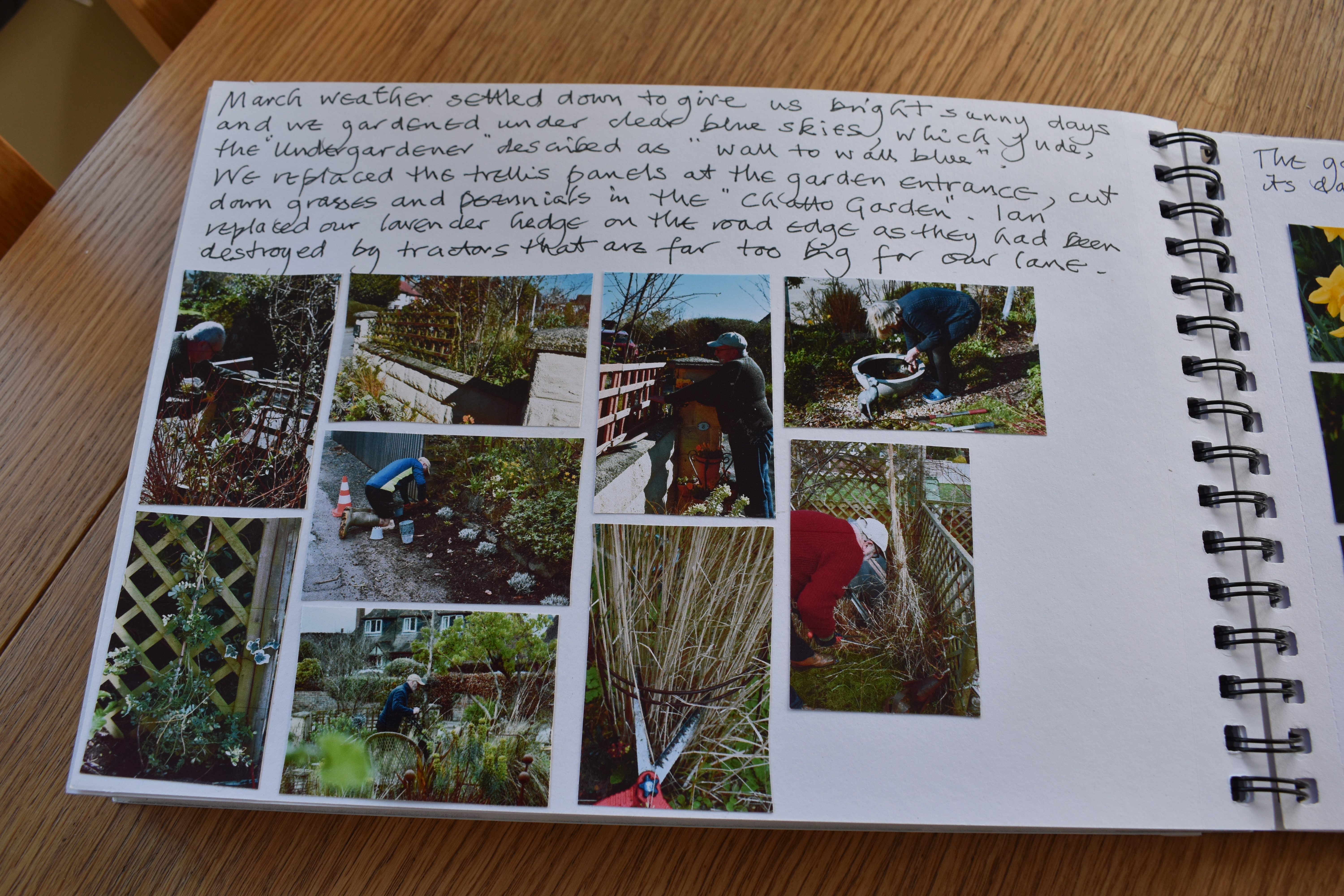 Concerning our tasks I wrote,“March weather settled down to give us bright sunny days and we gardened under clear blue skies, which Jude described as ‘wall to wall blue’. We replaced the trellis at the entrance to the garden, cut down grasses and perennials in the ‘Chatto Garden’ while Ian replaced our lavender hedge on the road edge as the plants had been destroyed by tractors that are far too big for our lane.”
