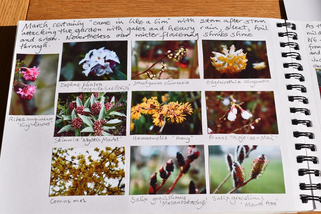 On the first page I welcomed in the new month by considering our flowering shrubs that gave us colour at the beginning of March, and wrote,“March certainly “came in like a lion” with storm after storm attacking the garden with gales and heavy rain, sleet, hail and snow. Nevertheless our winter-flowering shrubs shone through.”