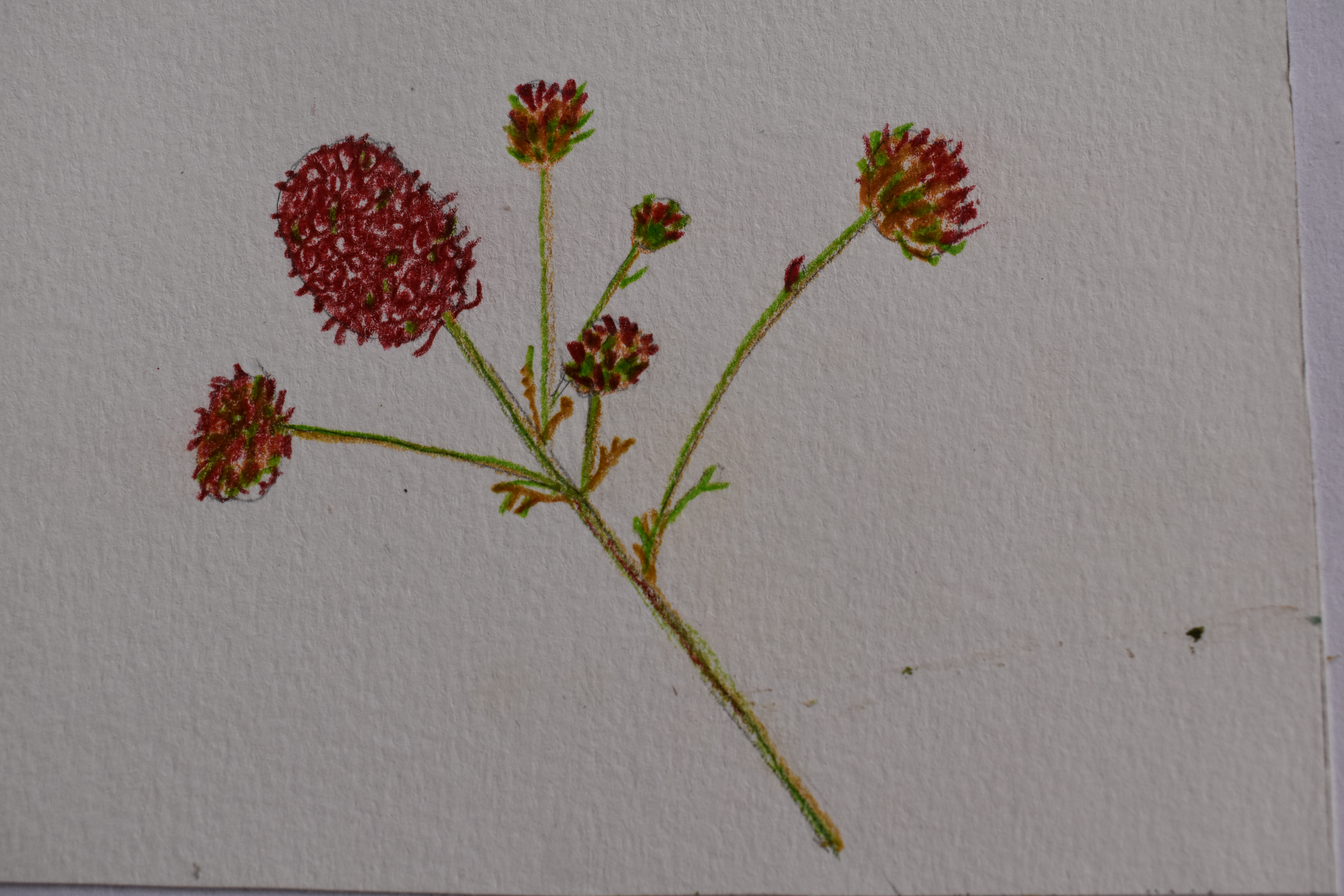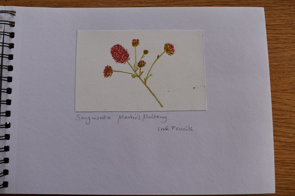 Over the page from the irises I shared a sketch I did using ink colouring pencils of a Sanguisorba called ‘Martin’s Mulberry’.