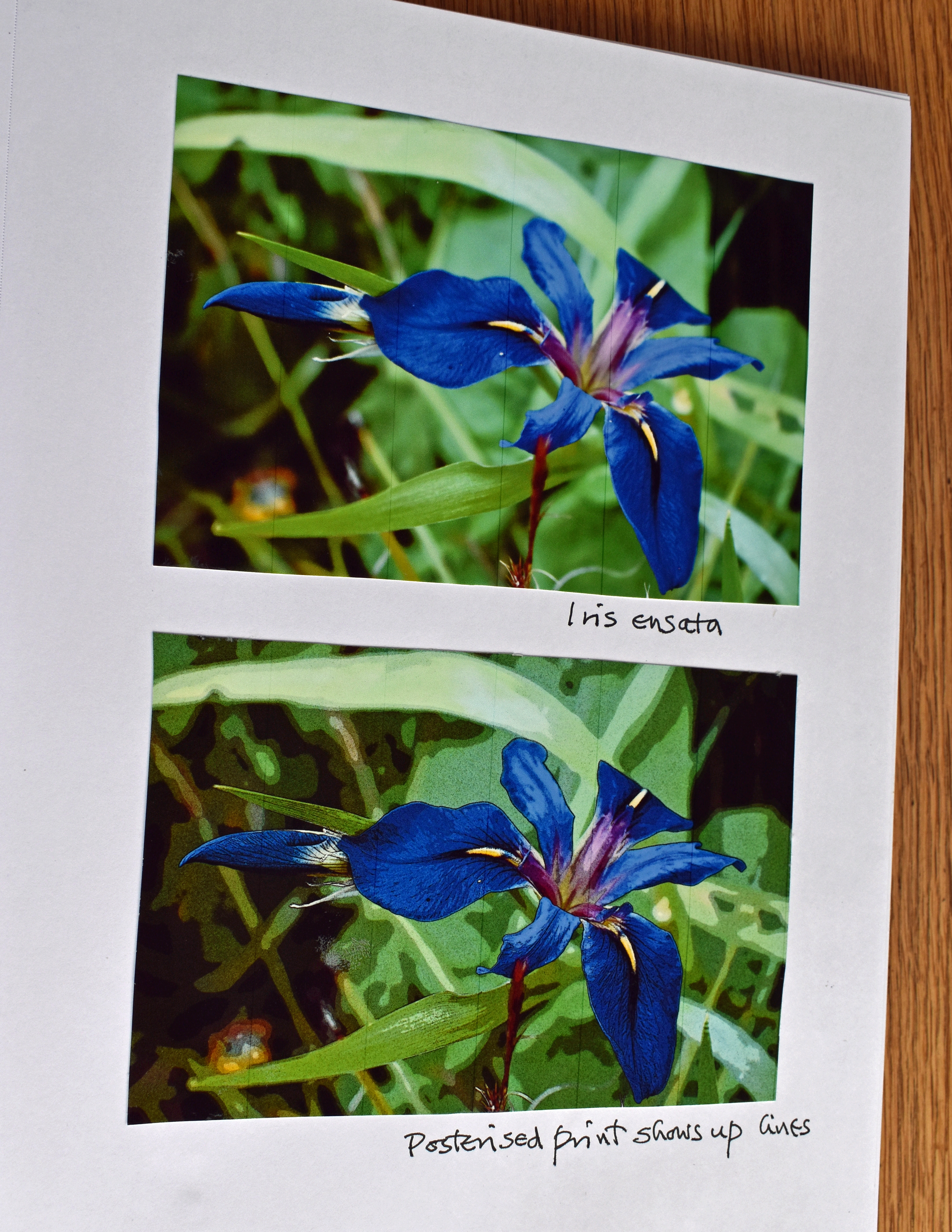 On the opposite page I shared two photos of our “Iris ensata” which has come into its own this year, flowering profusely. In close up the detail is stunningly beautiful. The top photo is a straight print and the bottom one a poster print to show more details especially the lines on each petal.