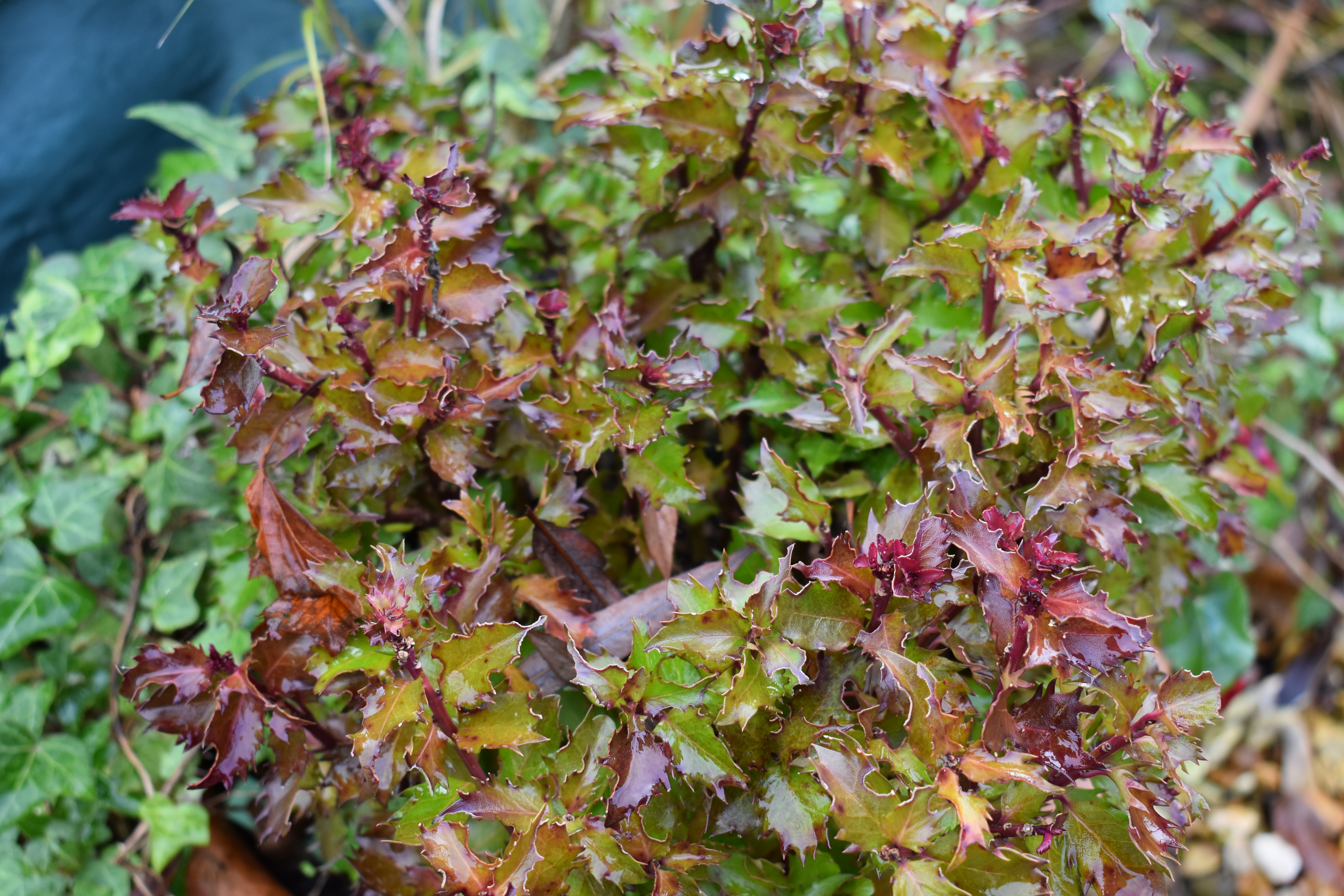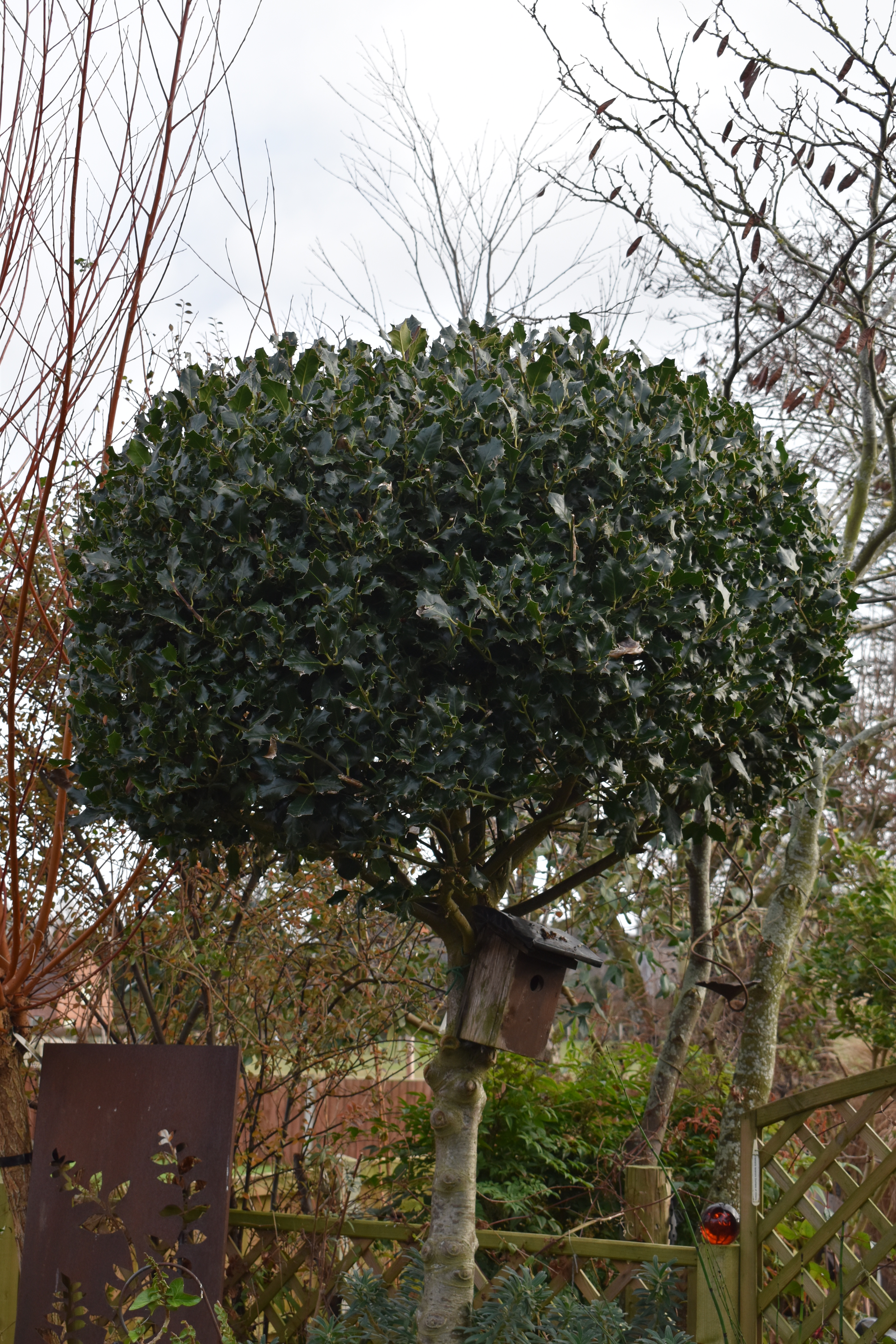 The hollies below are very different to each other. The lollipop trained holly is one of a pair either side of the raised pond and rill. The second one is our native holly which grows in our native hedge. The third is very different as it grows as a sphere and only reach 18 inches or so tall. Its foliage is multi-coloured and changes with the seasons.