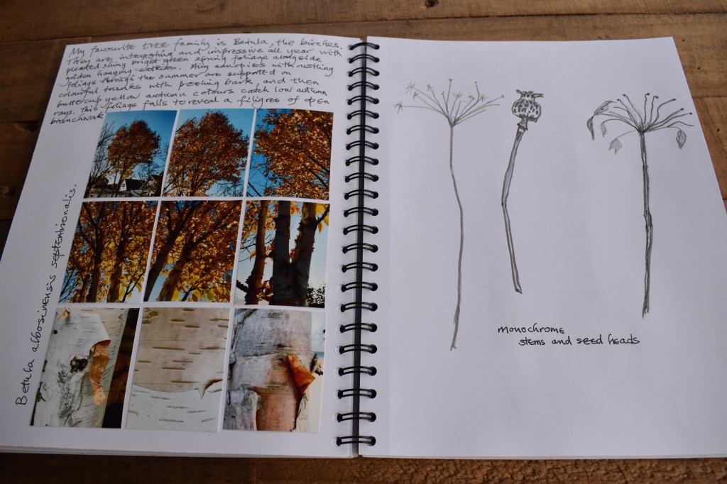 Over onto the next pair of pages and on the left I considered birches and opposite more seed heads and dried stems.