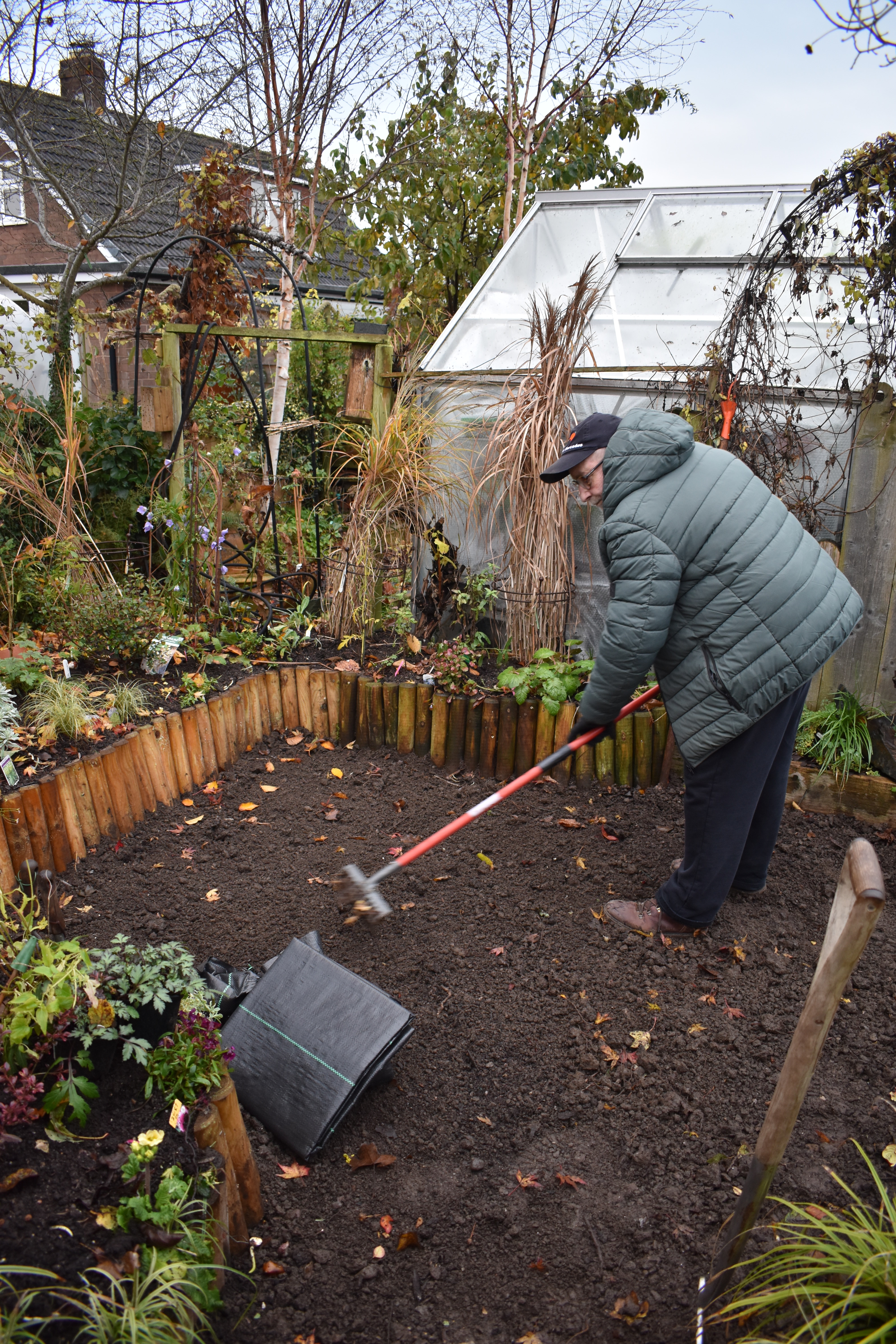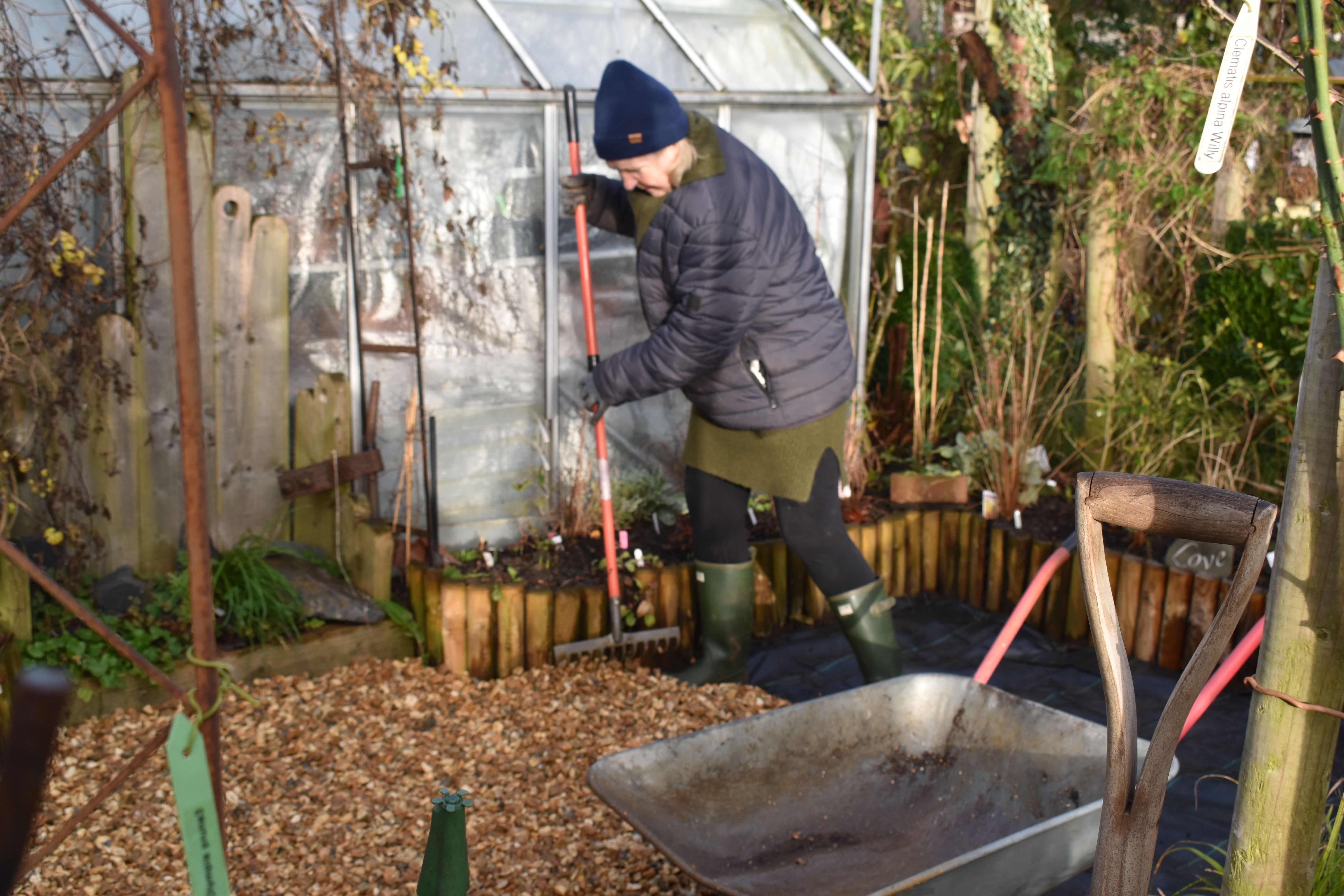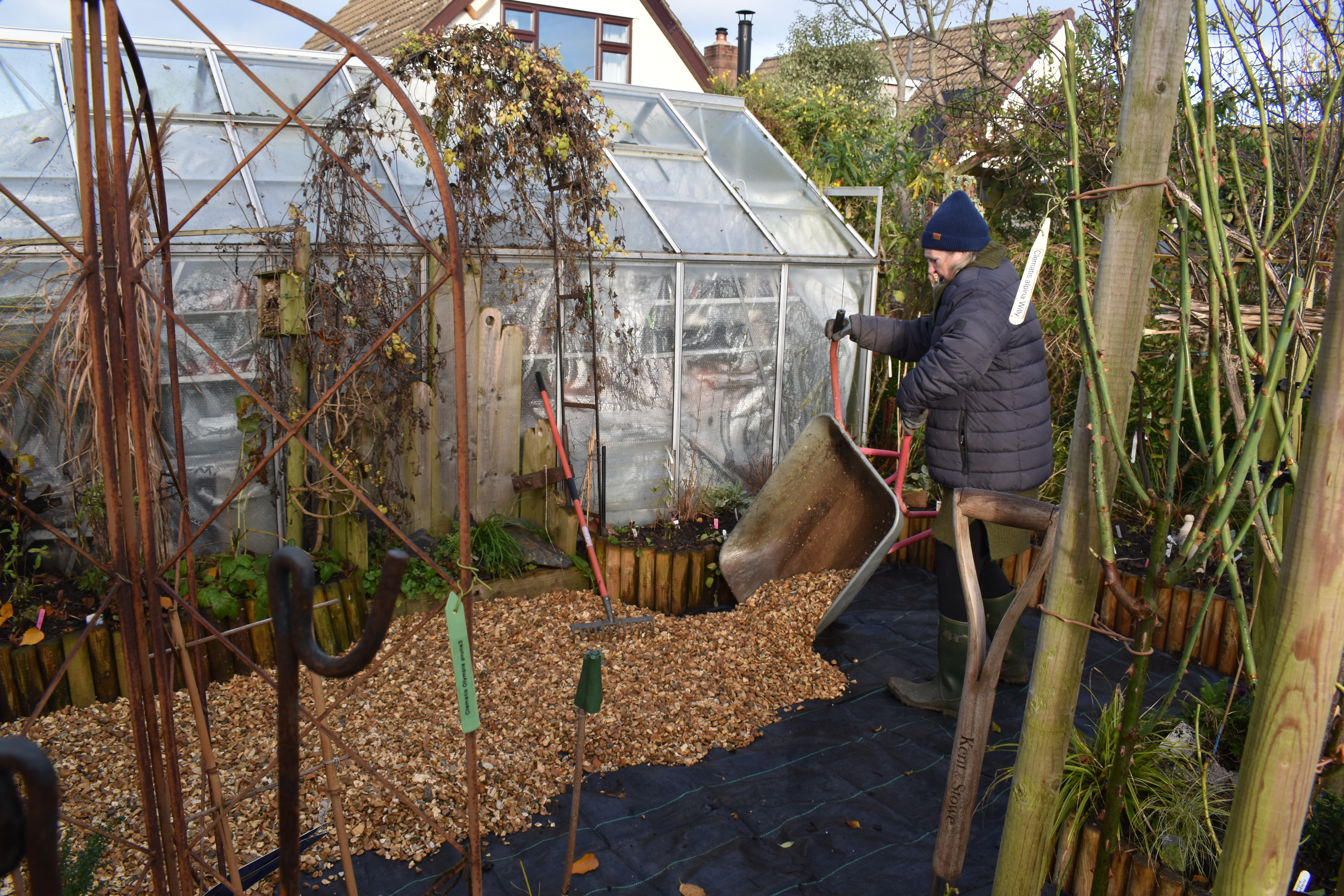 Concerning the month’s tasks I wrote, “Throughout December we completely re-developed our ‘Secret Garden’, removing all the plants around the borders and enlarging the central bark chip area. The borders were made much narrower and log roll edging re-fitted. We replaced bark as a surface and moved over to golden flint chippings. It will become a social area with a large scaffold board table and benches.”