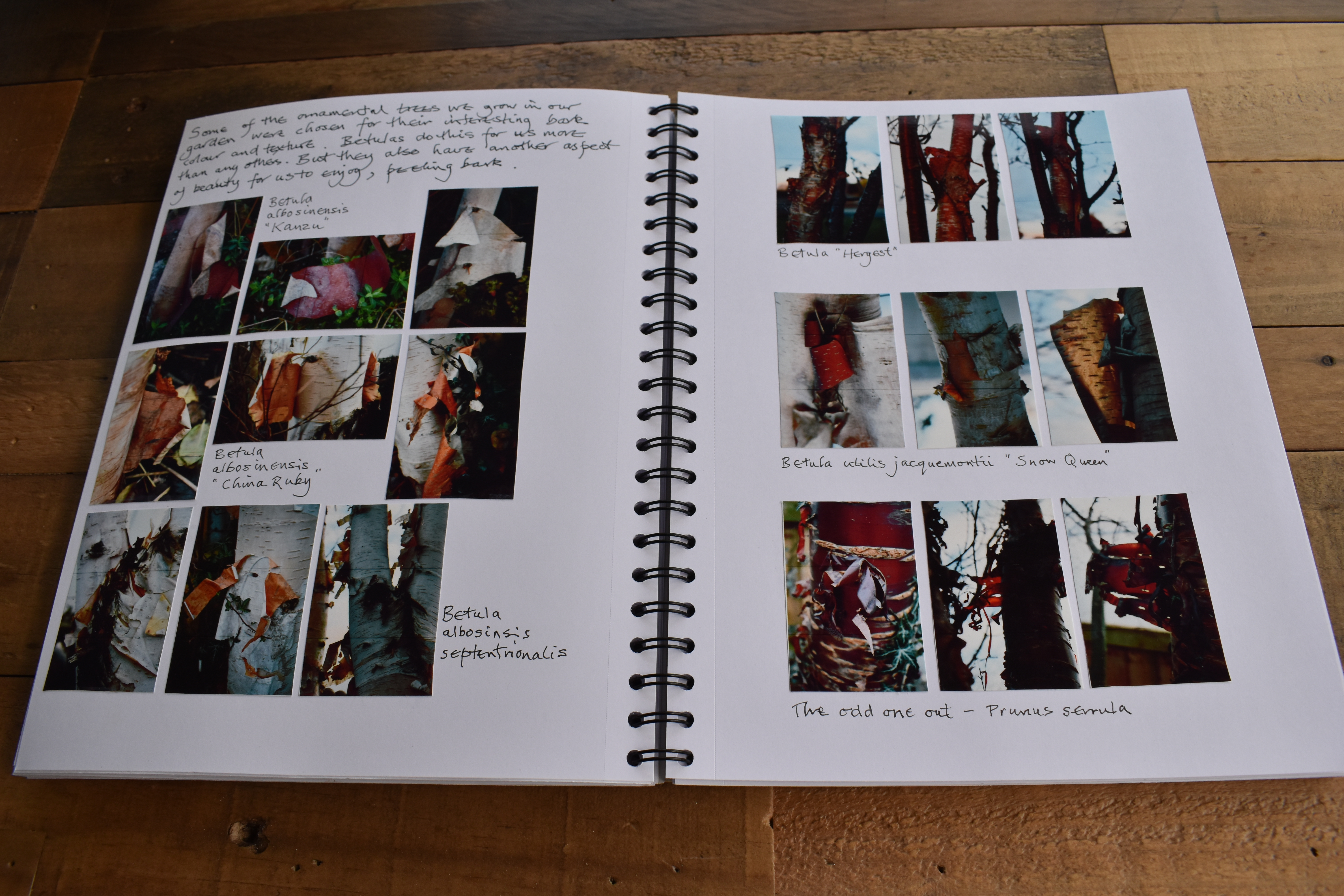 We can now turn over to two pages featuring trees with peeling bark, the first page being all betulas. I noted that, “Some of the ornamental trees we grow in our garden were chosen for their interesting bark, colour and texture. Betulas do this for us more than any other. But they also have another aspect of beauty for us to enjoy, peeling bark.”