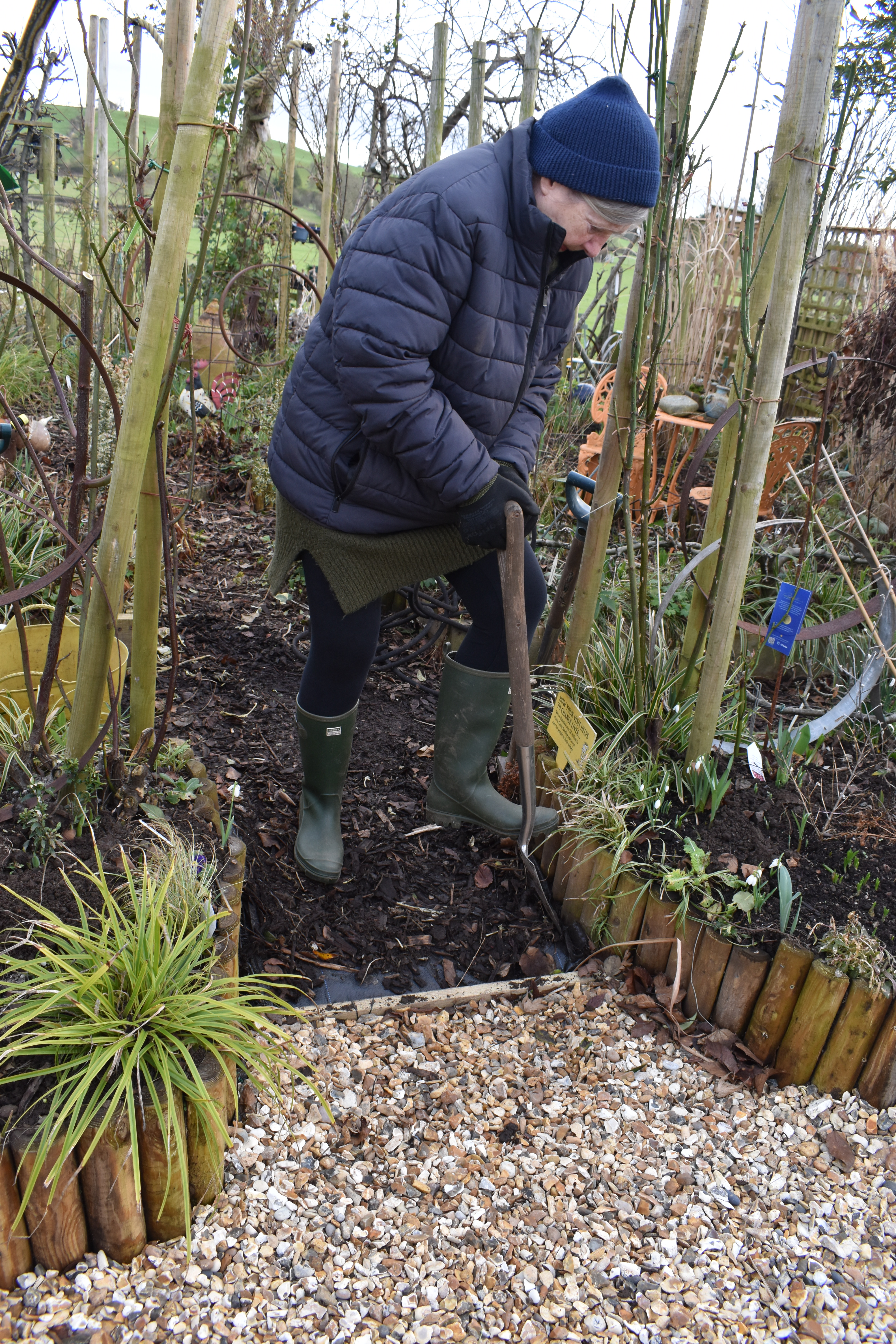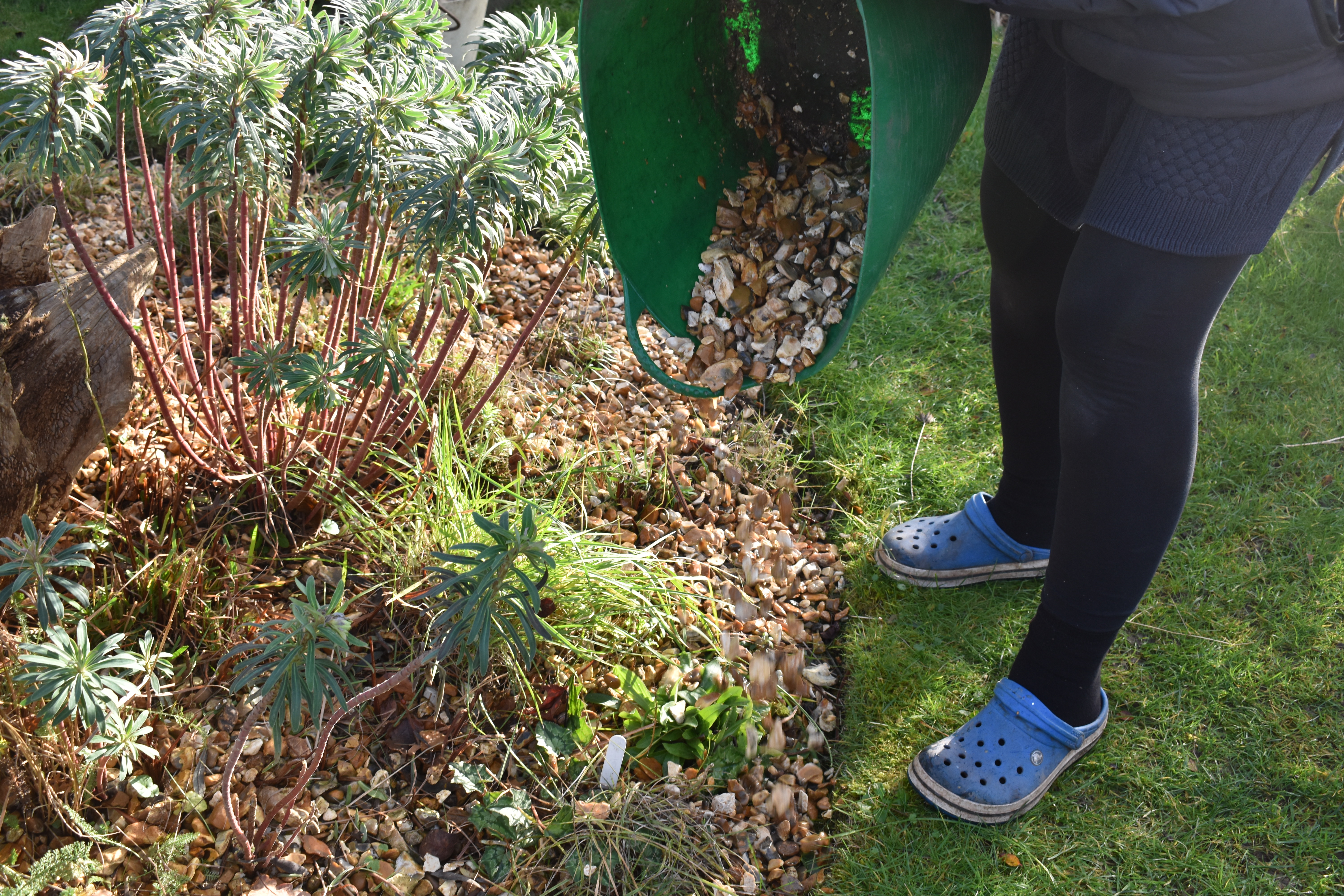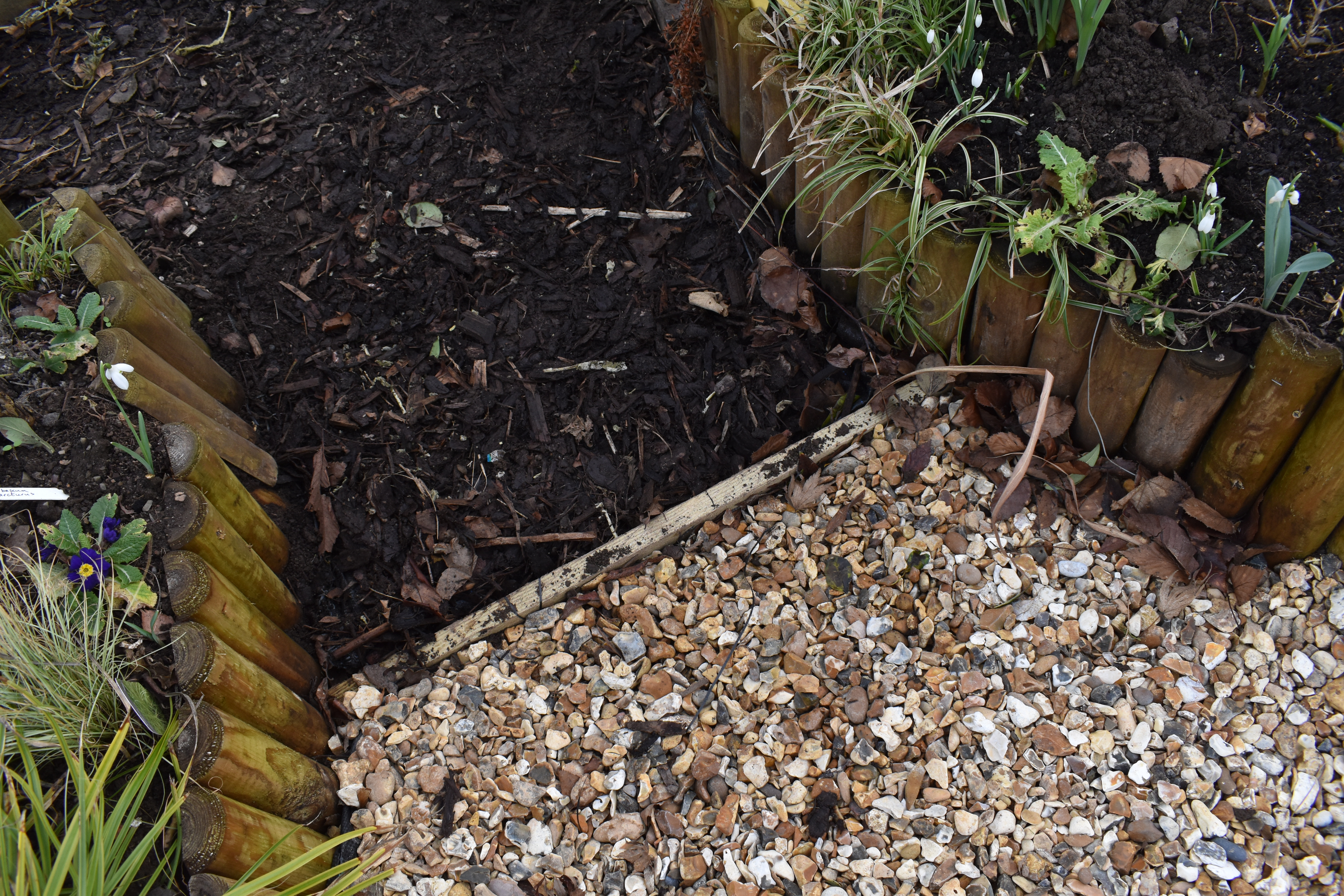 We top dressed trees with shredded autumn leaves and finished off the board between the bark path and the gravel of the new eating area.