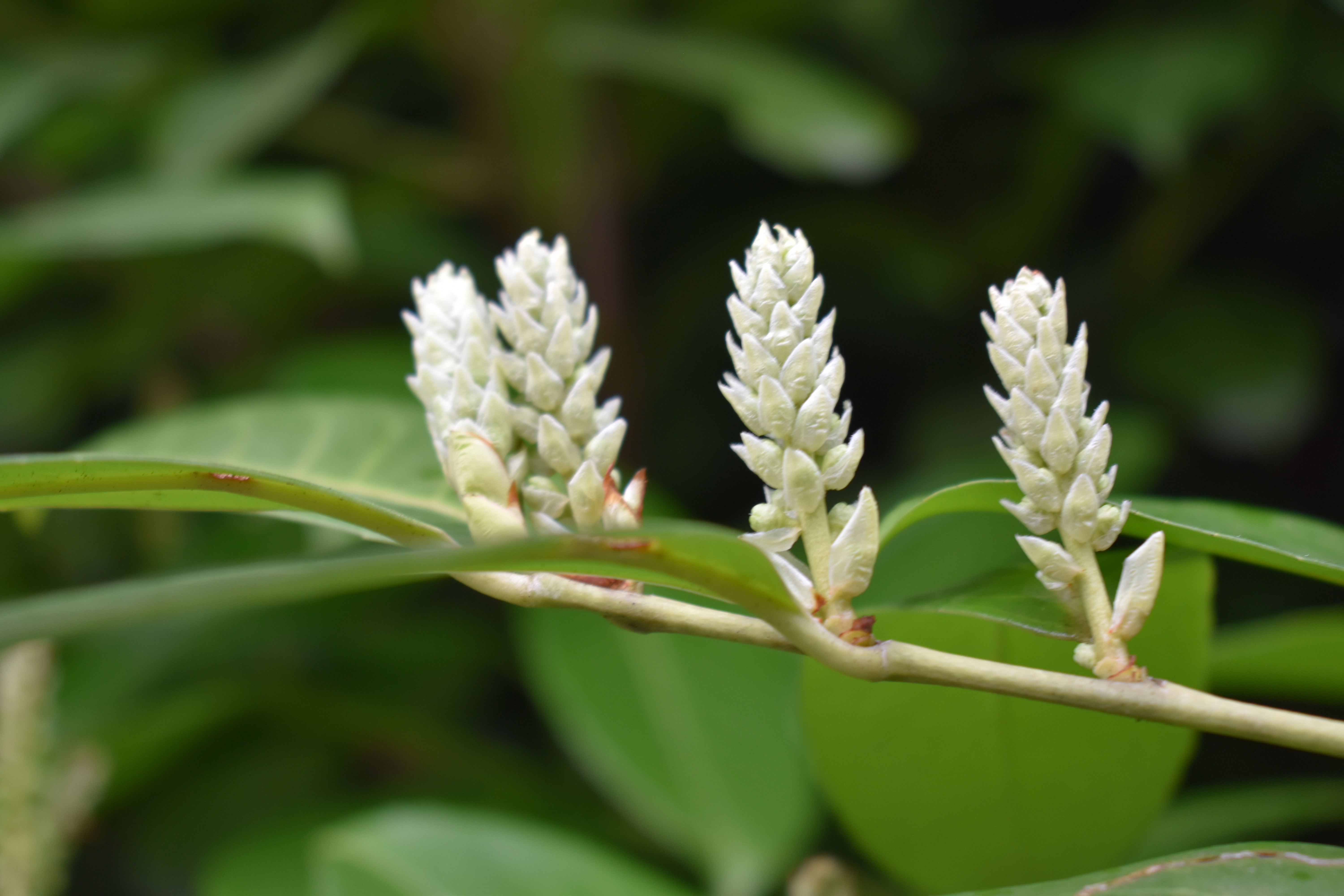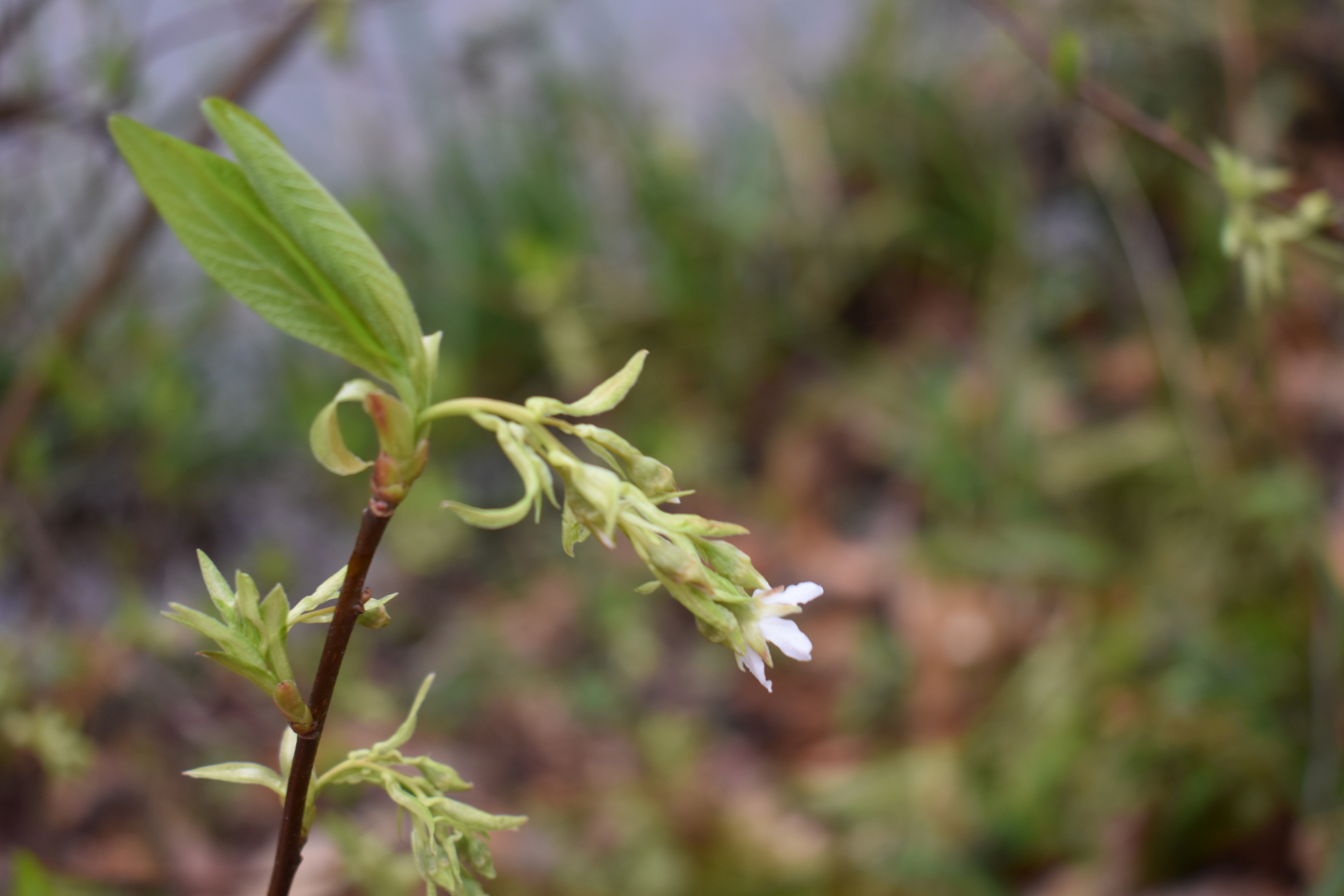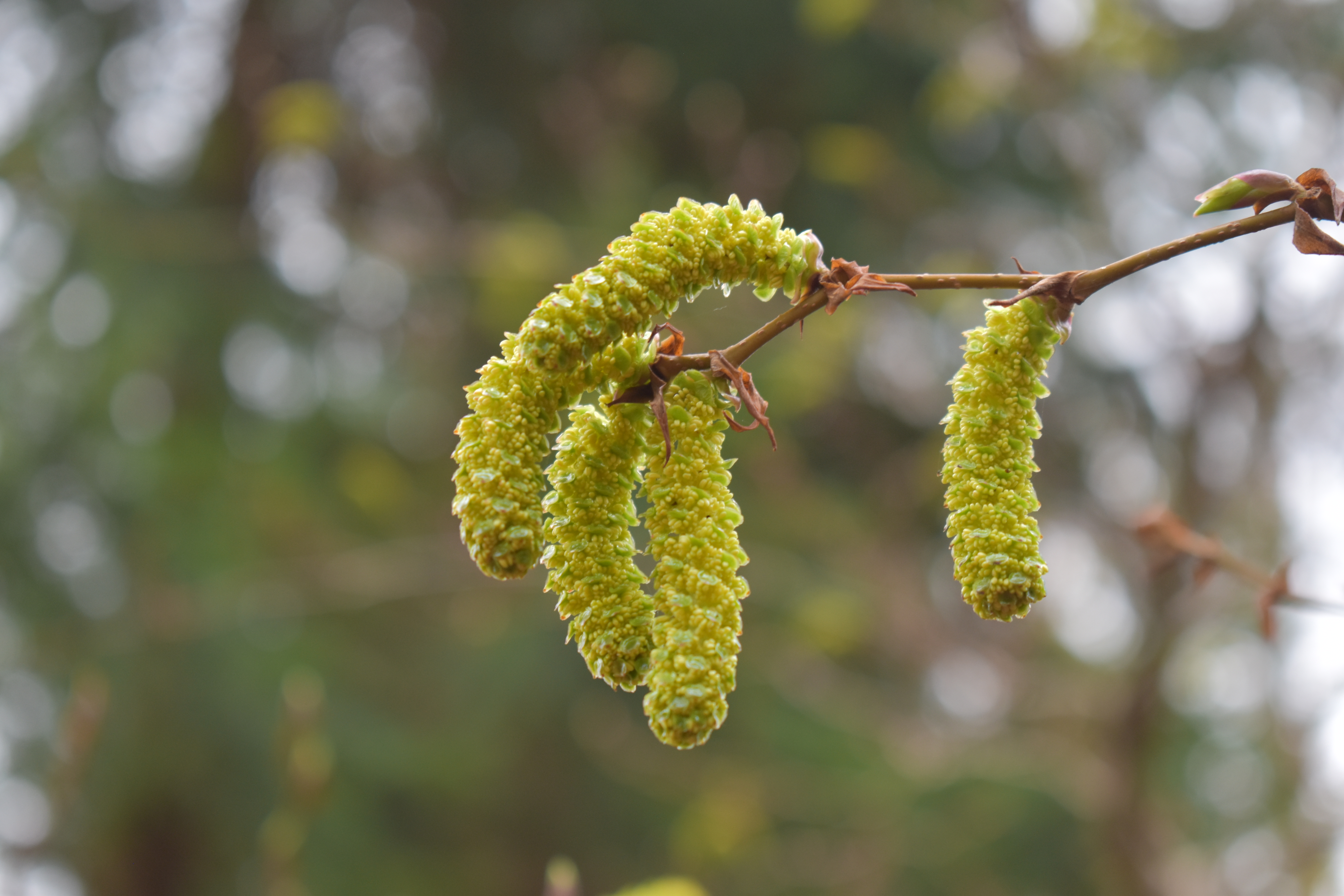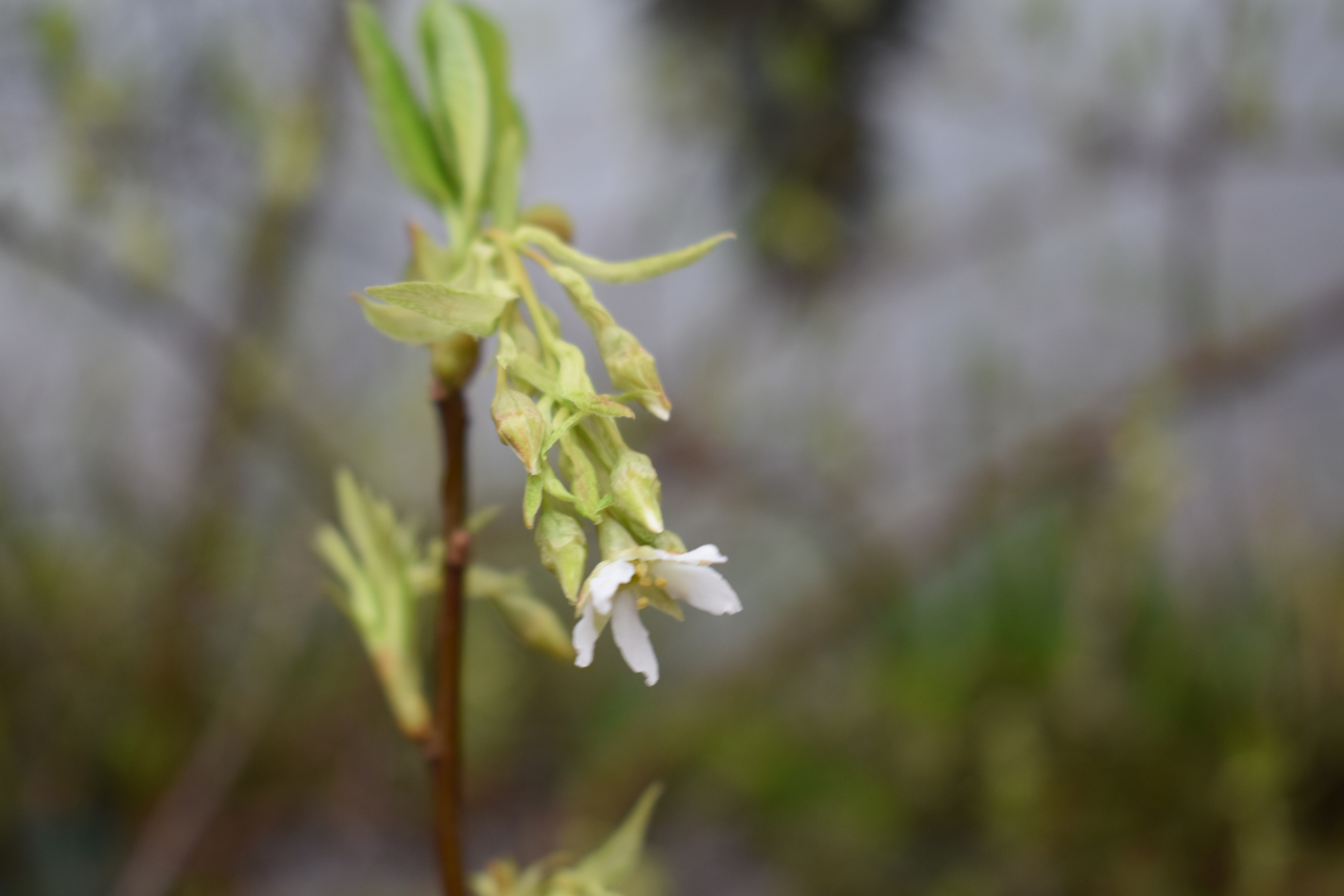 The next four photos show a clump of birch catkins and Cornus mas flowers on the top row and below that two photos of a shrub completely unknown to us. It had the overall look of a will but it had white flowers. None of us had a clue to its identity.