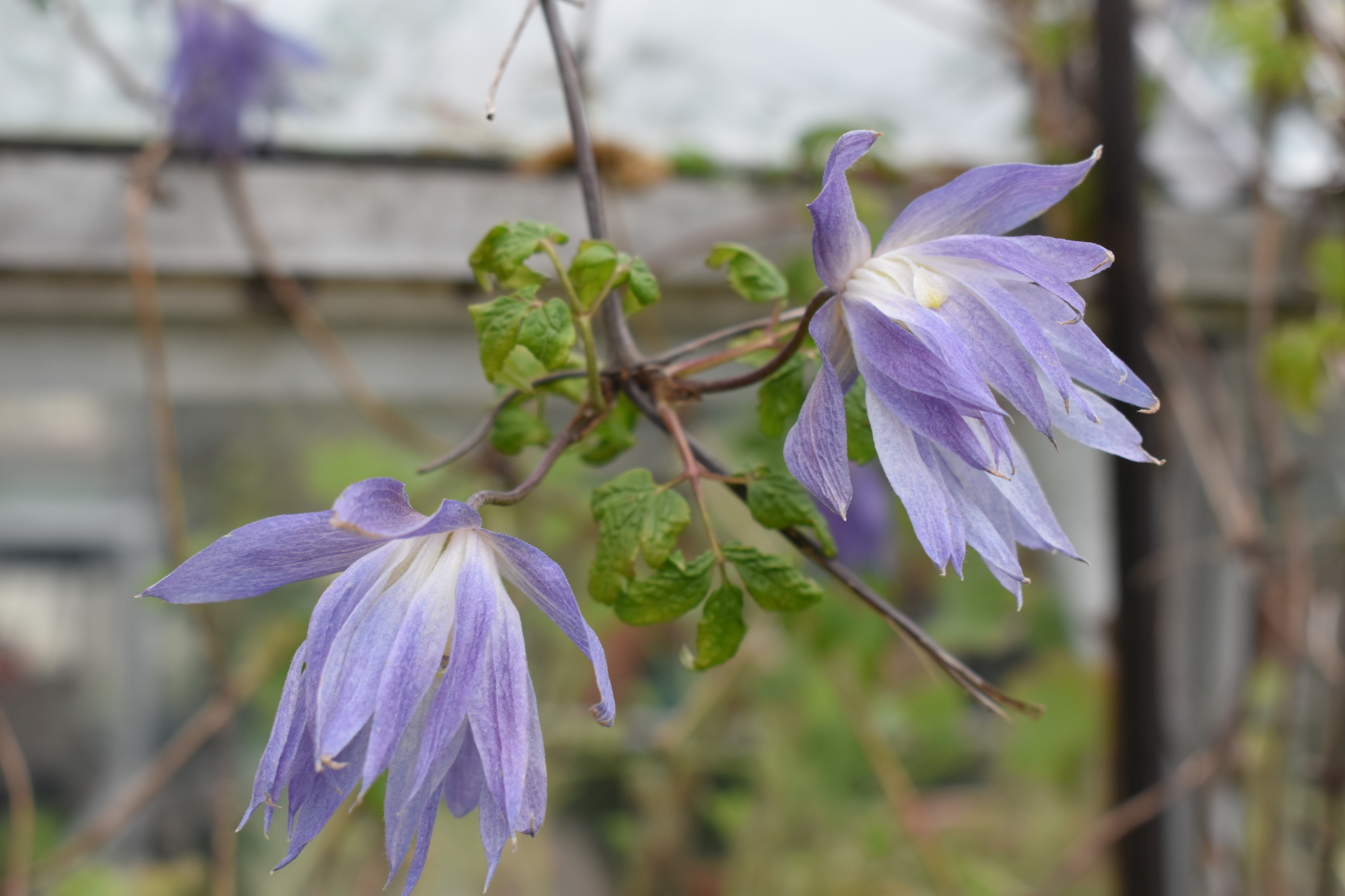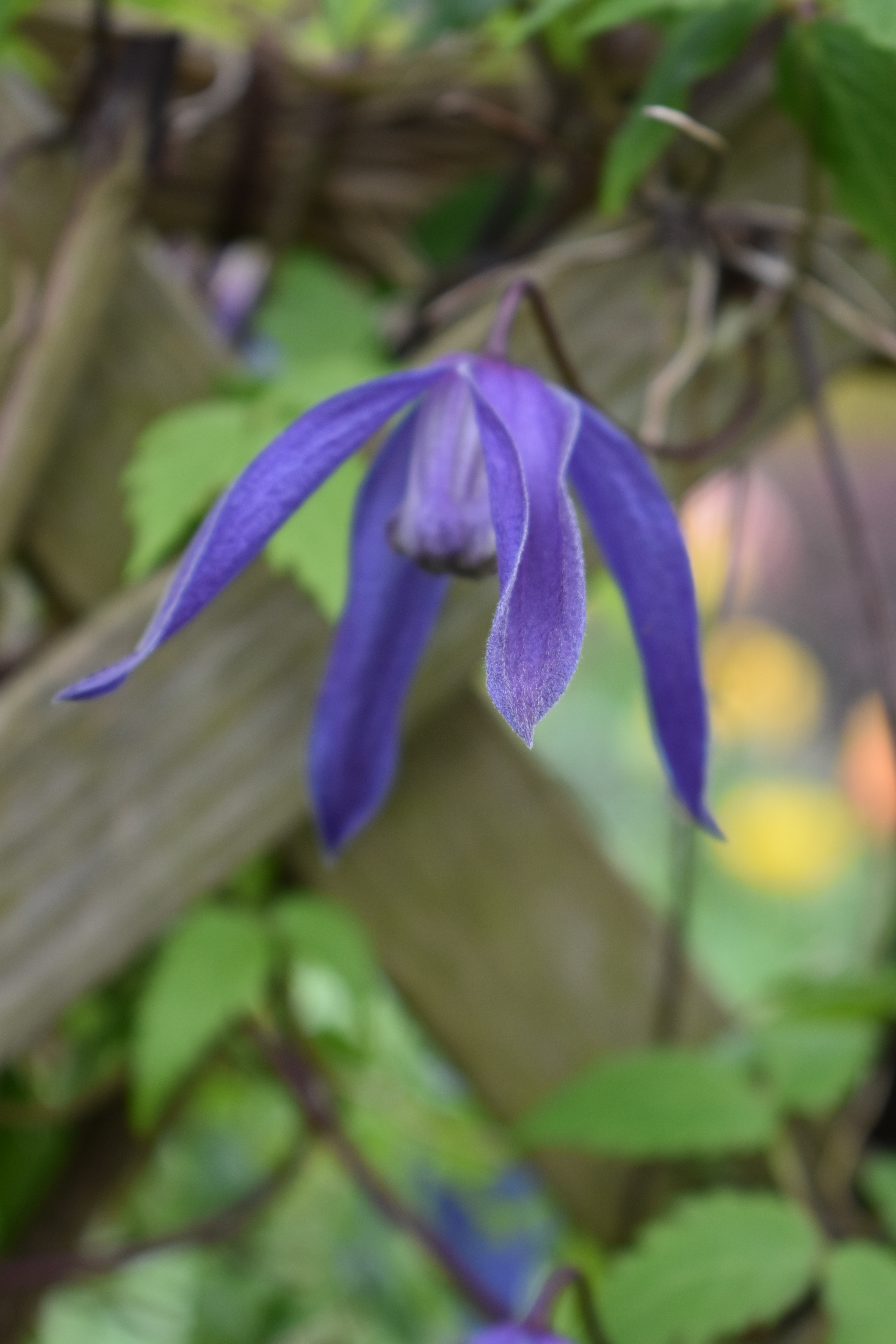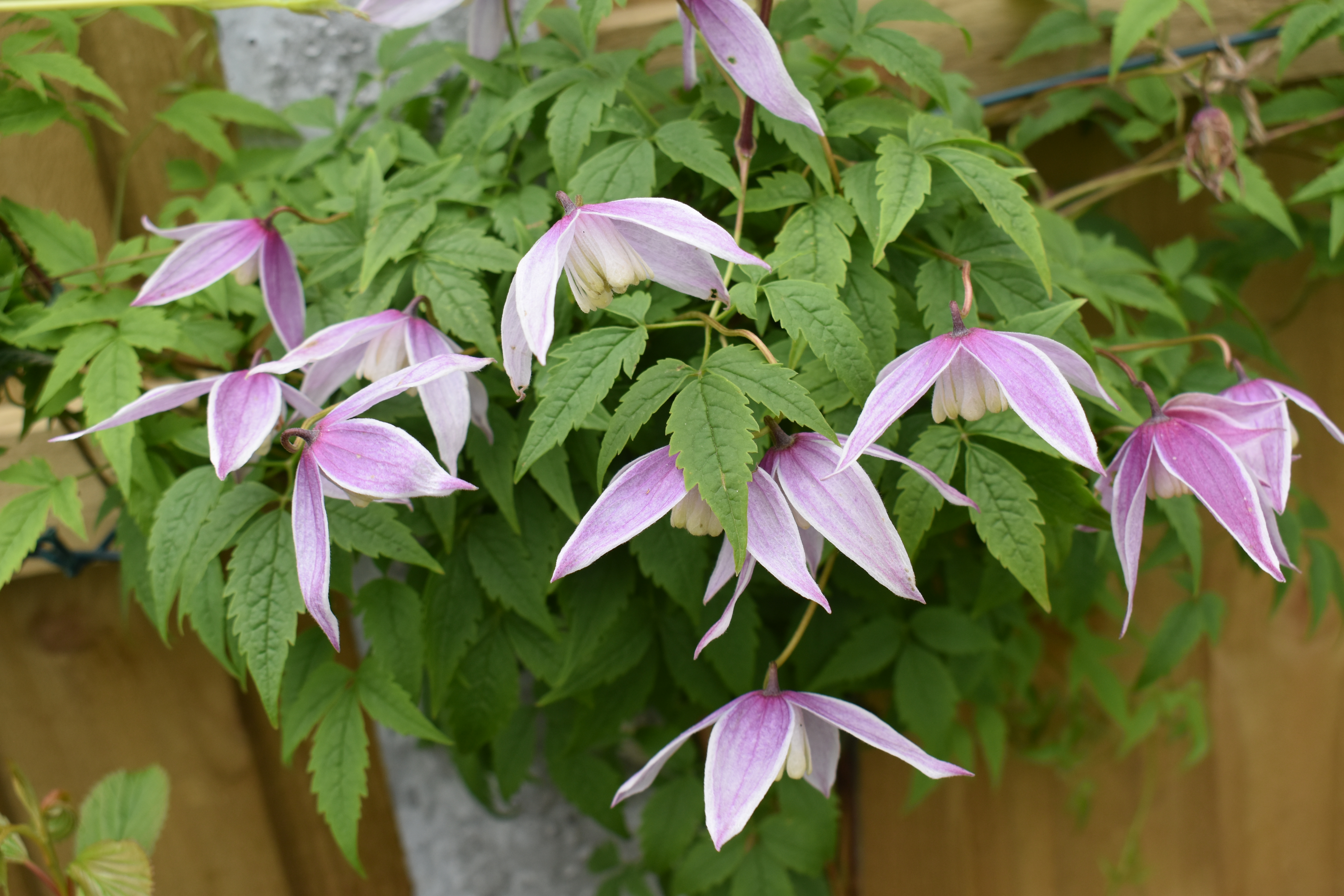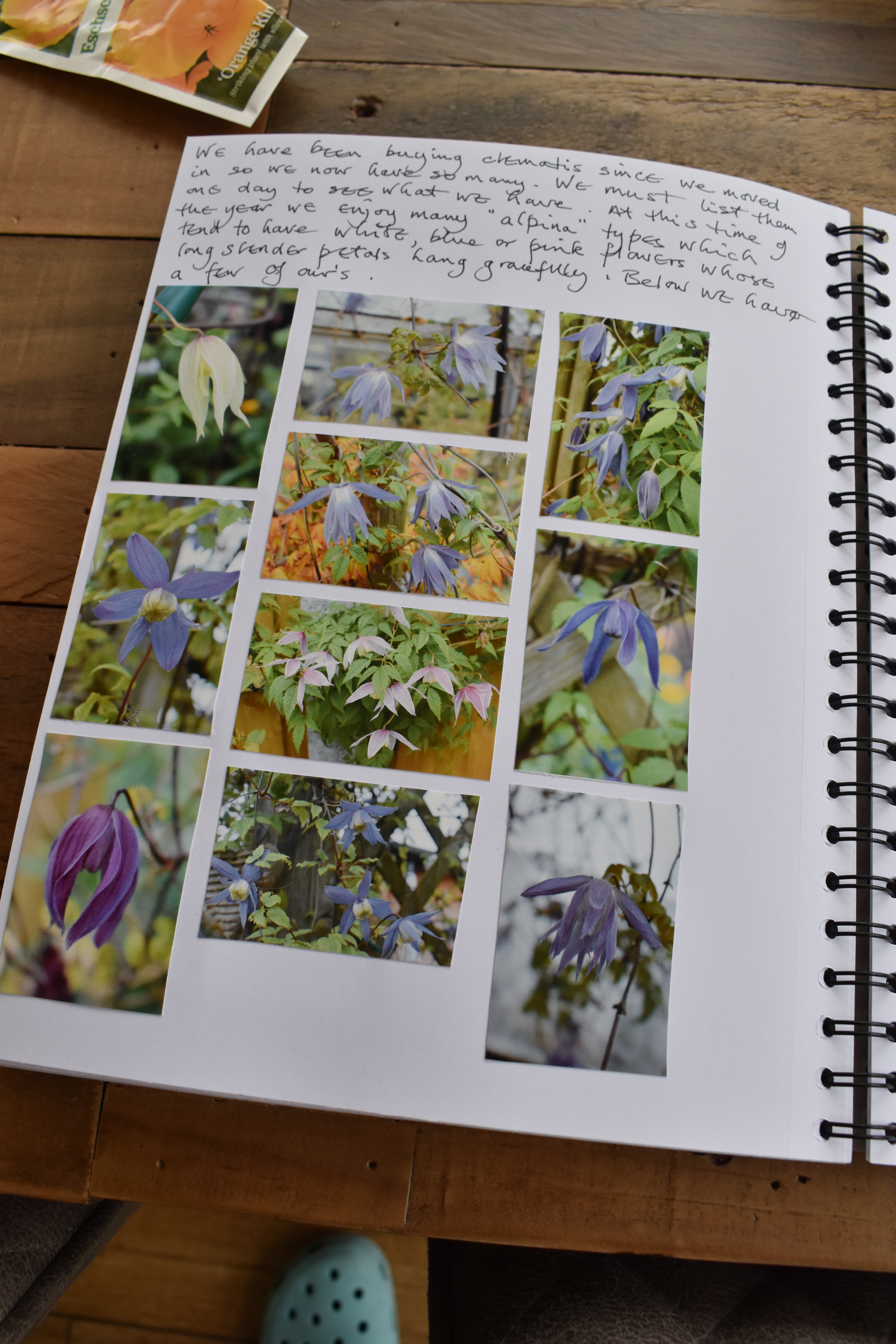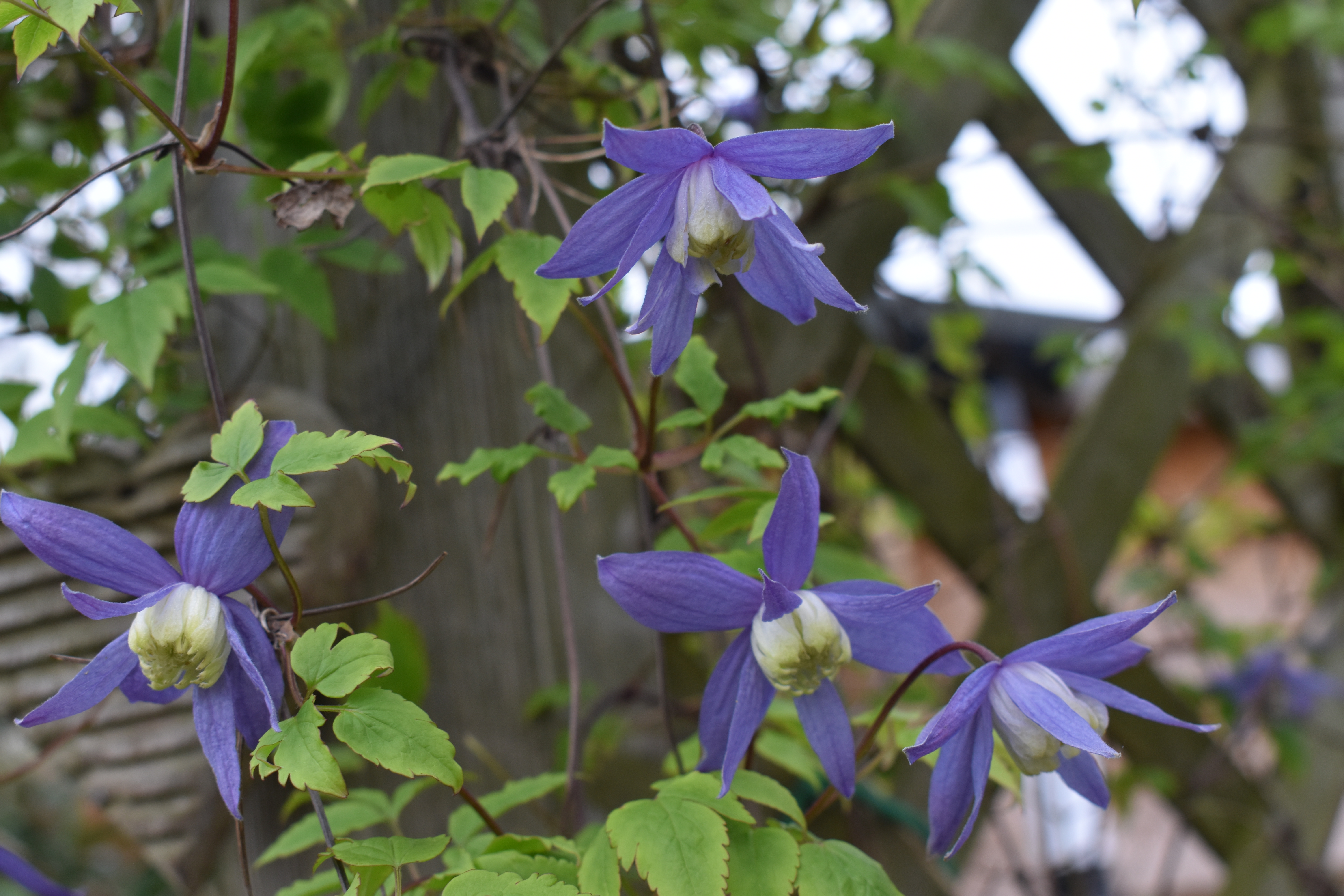 From muscari growing and flowering closely to the ground I moved on to look at clematis, a climber which flowers much higher up. Here I noted that, “We have been busy buying clematis since we moved so now we have so many. We must list them one day to see what we have. At this time of year we enjoy many ‘alpina’ types which tend to have white, blue or pink flowers whose long slender petals hand down gracefully. Below we show a few we have in our garden.”