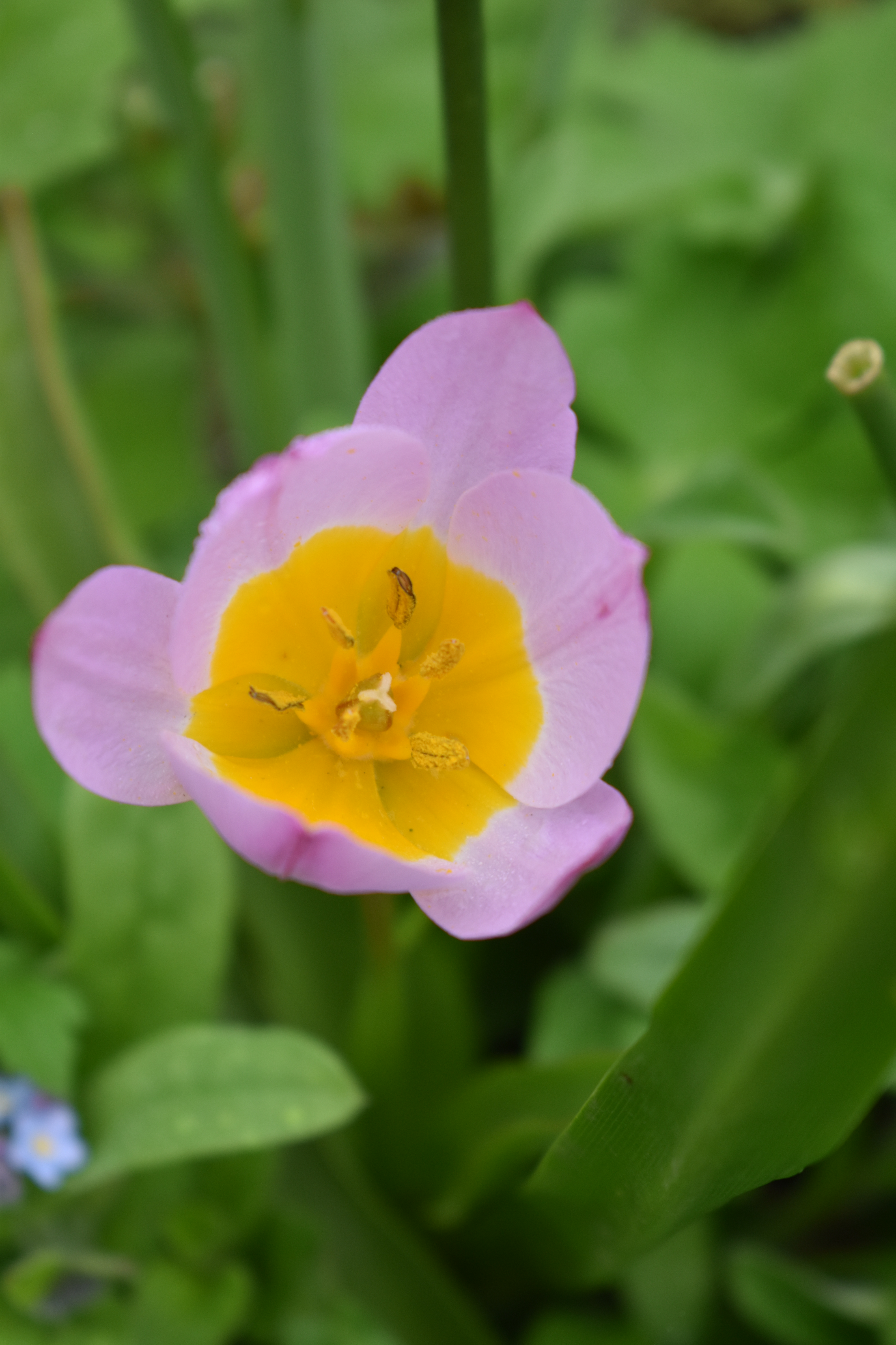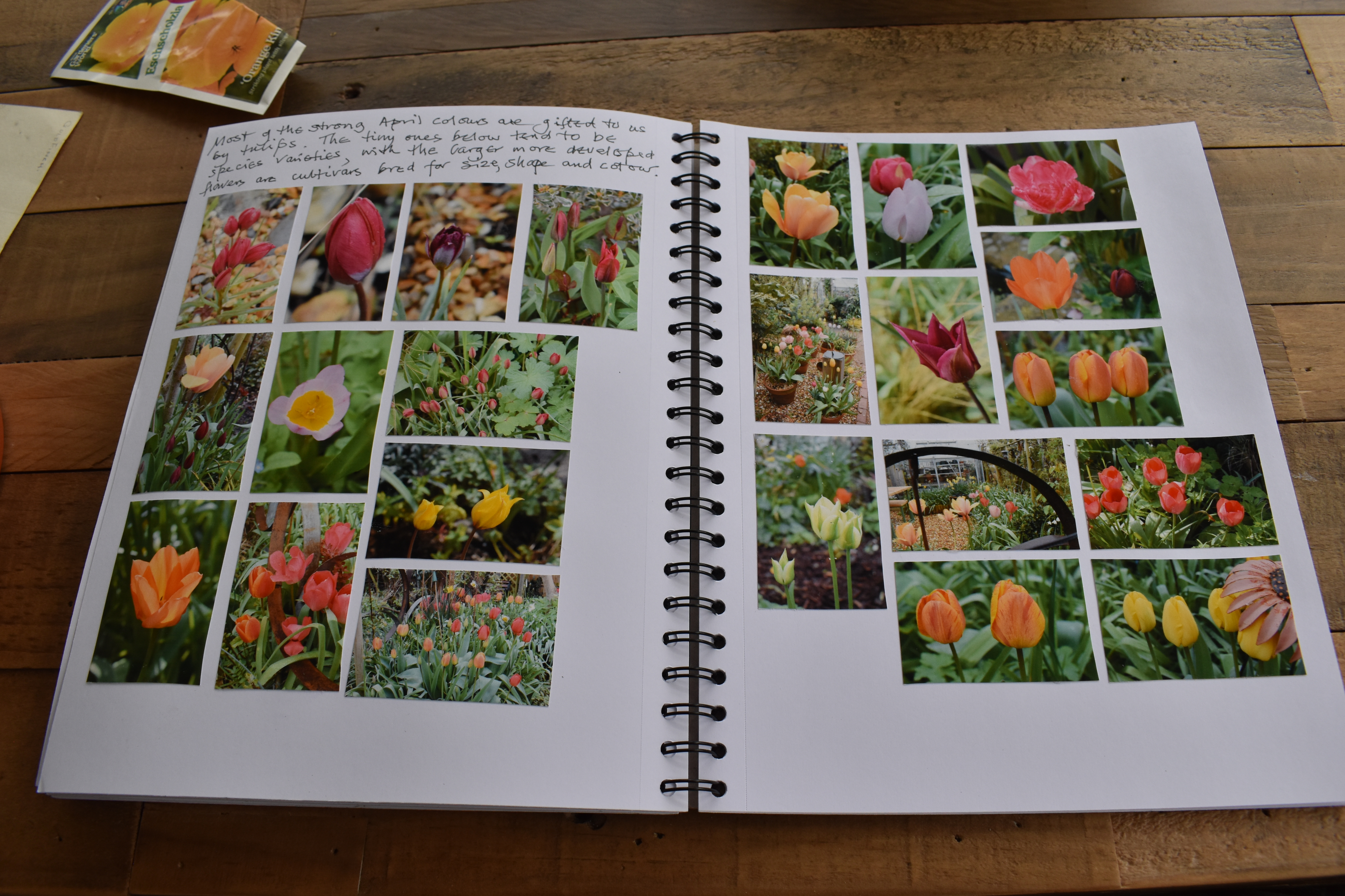 Next the journal displays a double page spread featuring tulips, that most colourful bulb flower of all. To introduce them I wrote,“Most of the strong April colours are gifted to us by tulips. Te tiny ones below tend to be species tulips, with the larger more developed flowers are cultivarsbred for size, shape and colour.”