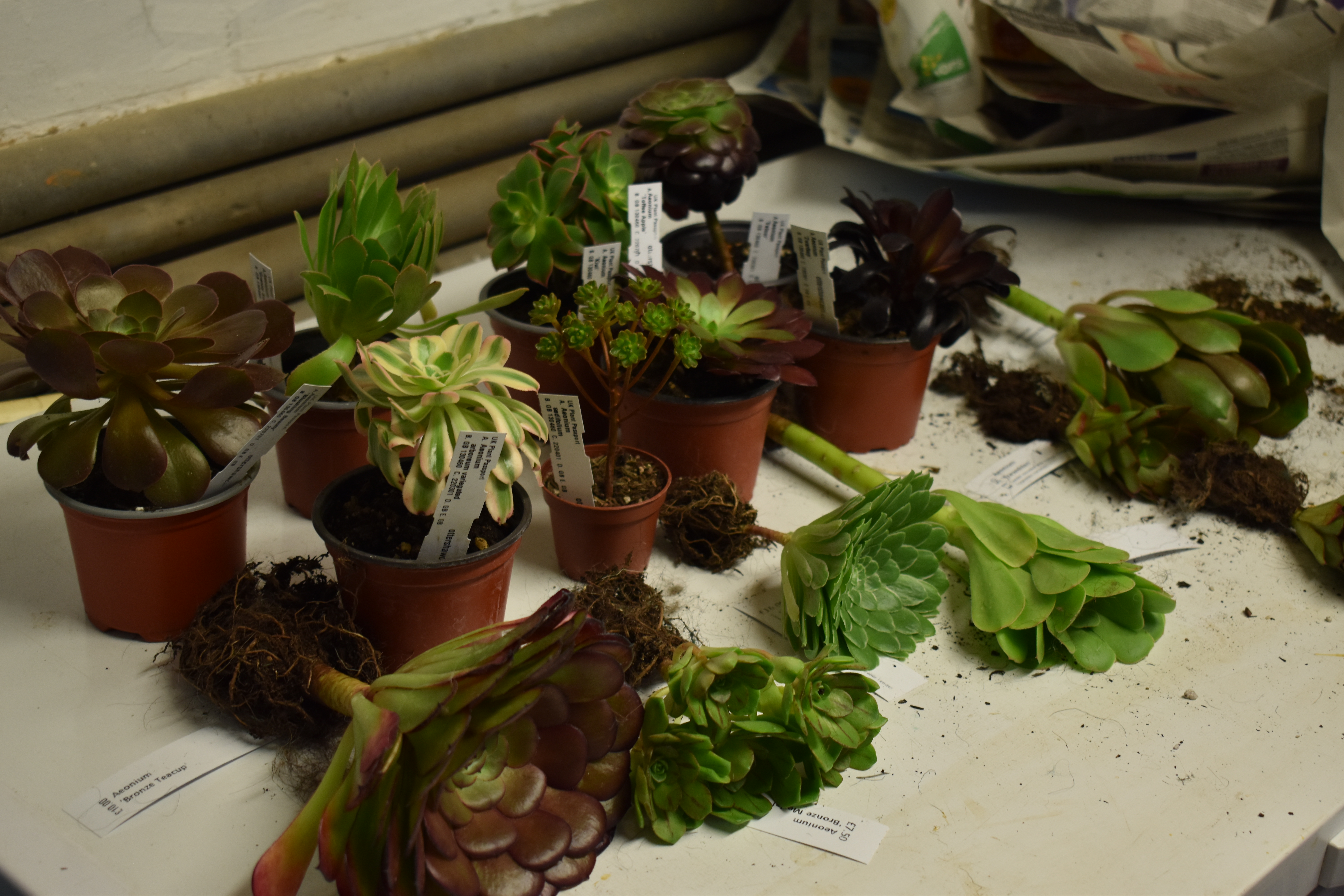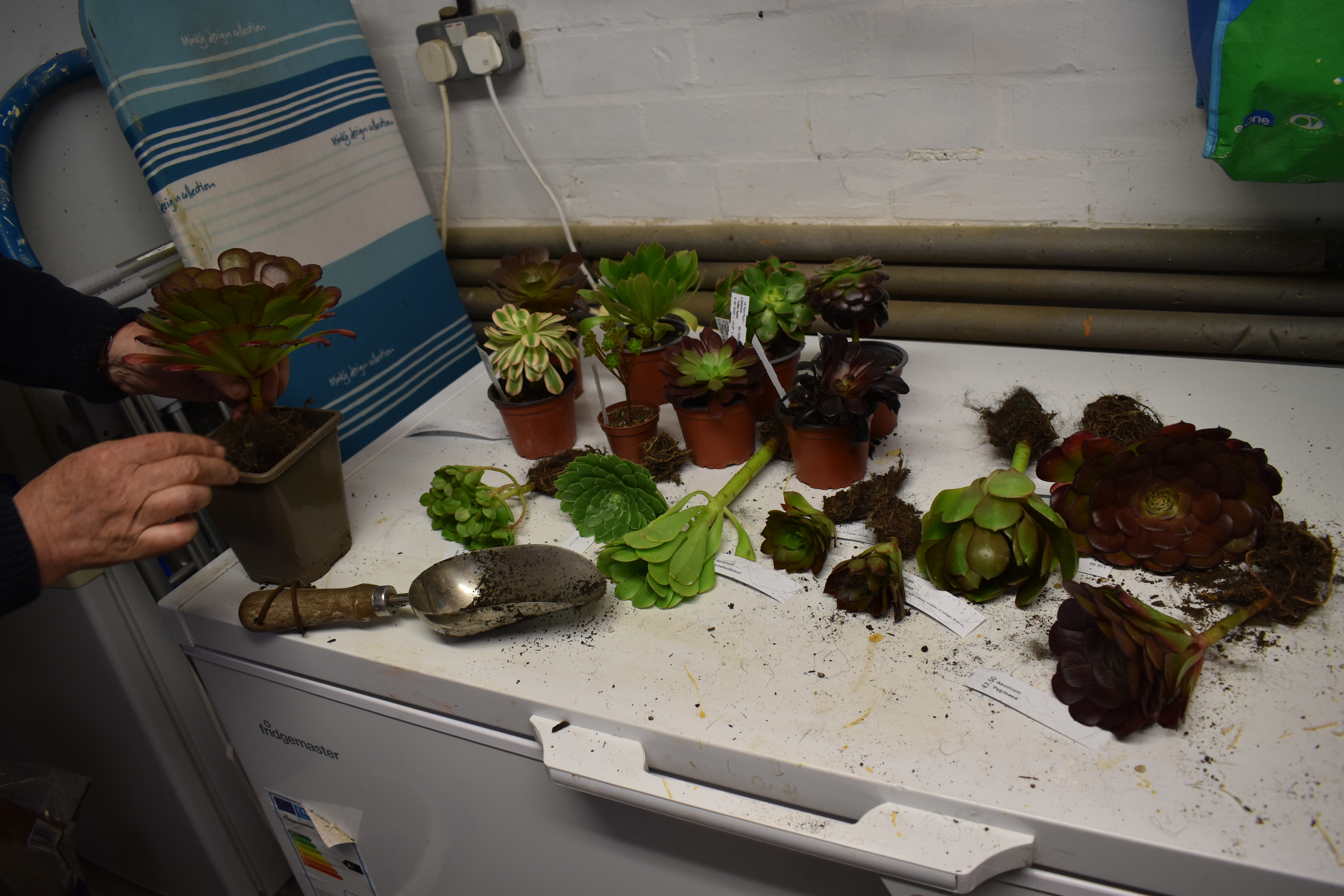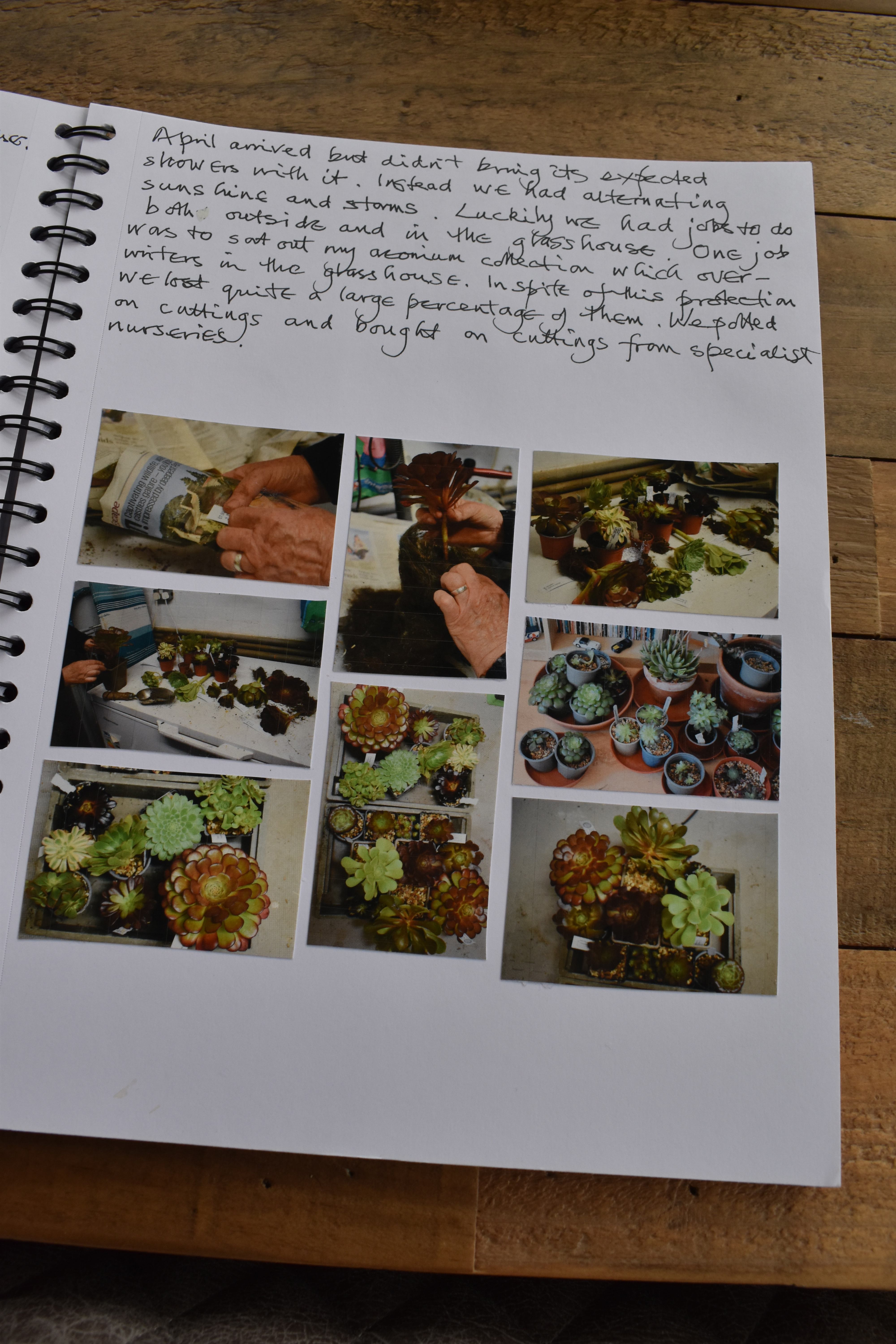 To begin with I wrote, “April arrived but bring its expected ‘April Showers’ with it. Instead we had alternating sunshine and storms. Luckily we had jobs to do both out and inside the glasshouse. One job was to sort out my aeonium collection which overwinters inside the glasshouse. In spite of this protection we lost quite a large percentage of them. We potted on cuttings and bought on others purchased from specialist nurseries.”