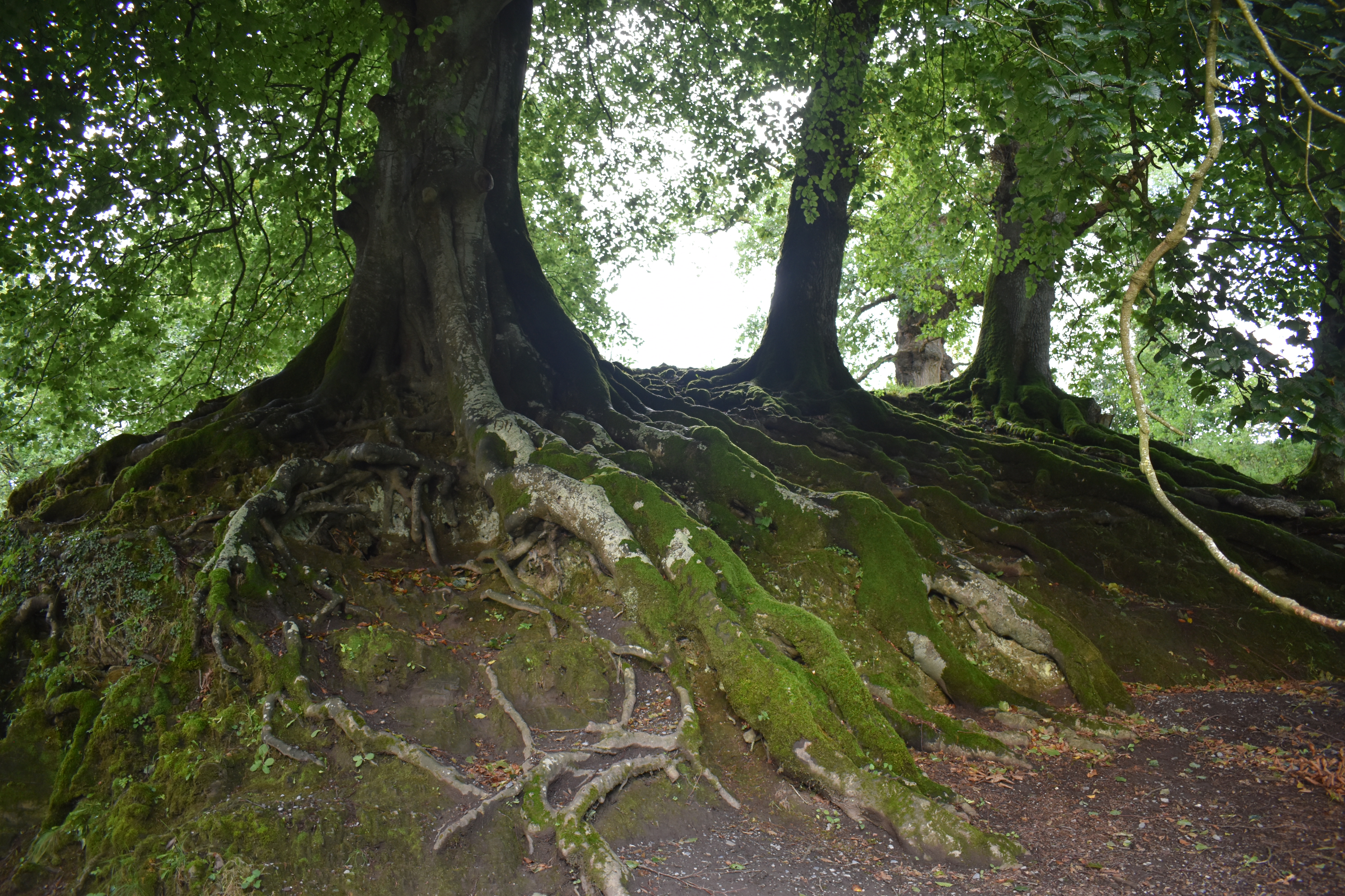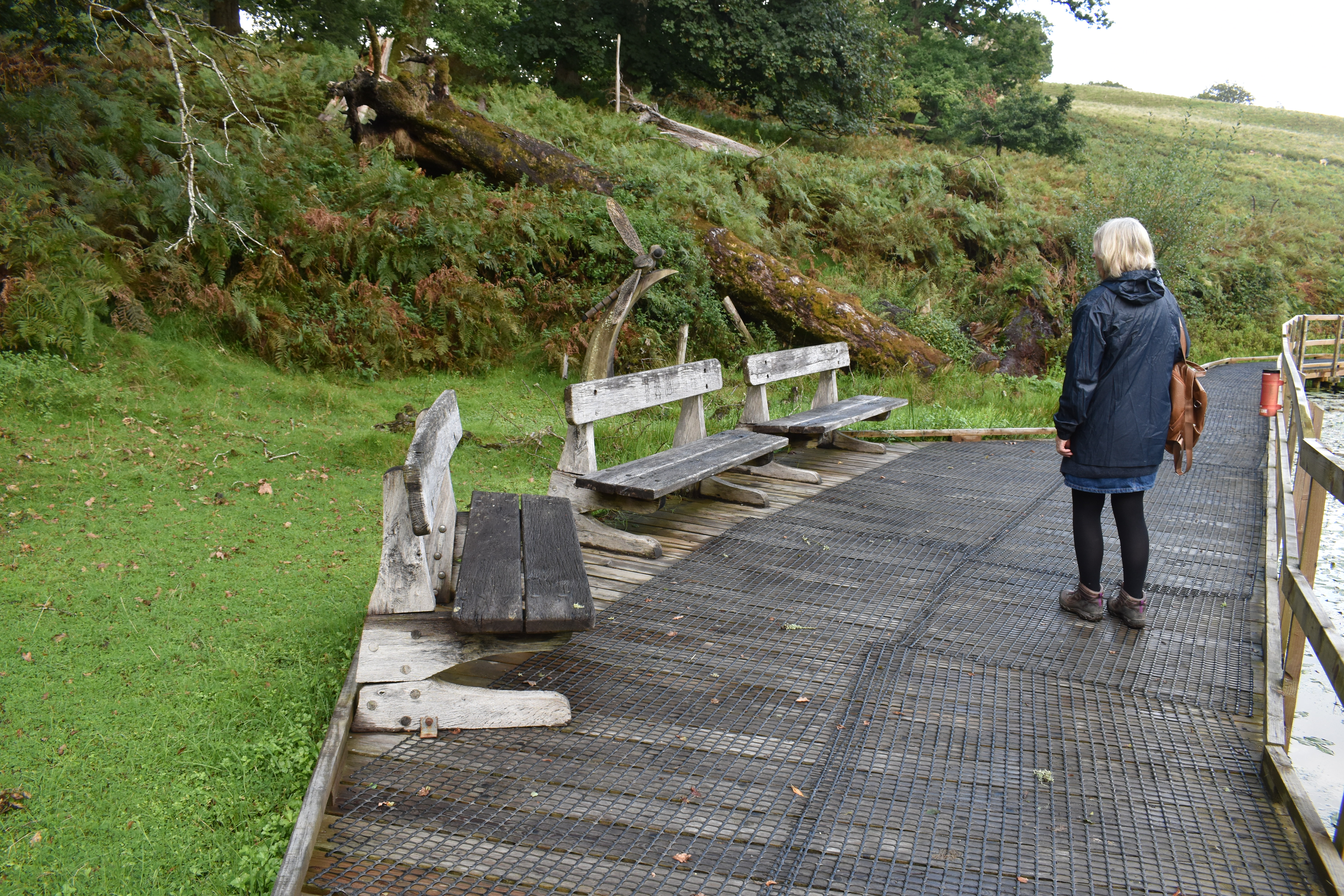 After a coffee and cake in the cafe we set off to enjoy a walk in woodland, after gong through this wide gateway. We donned waterproofs as drizzle had set in. After only a sloping hundred yards or so we entered woodland and followed the blue trail. There were very few posts to guide us on the way so there was a lot of chances to use our imagination.