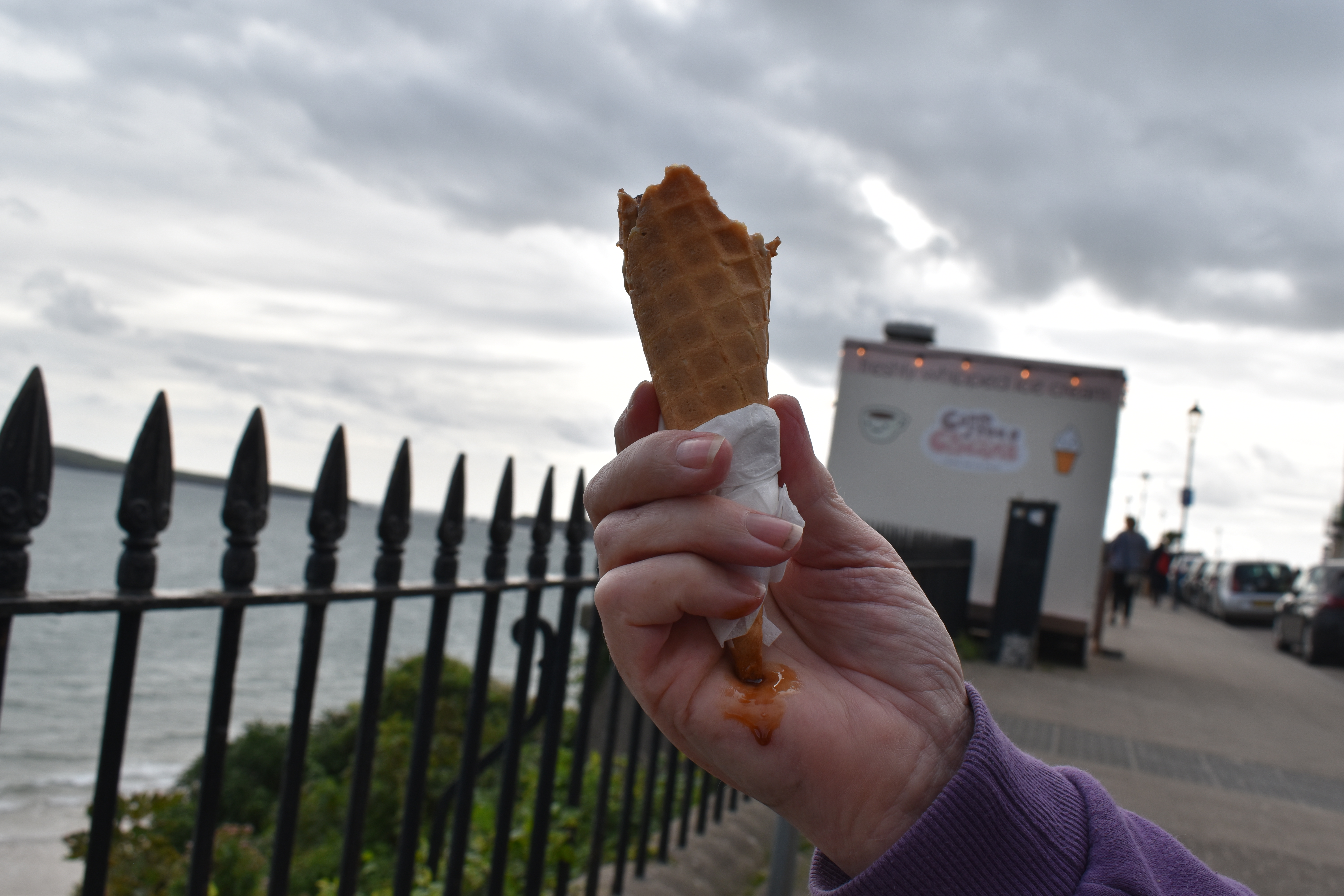 When we visit the seaside we have to find an ice cream to enjoy. We usually indulge in a ‘No 99’, whipped ice cream with a chocolate flake in a cone. Here in Tenby however we were tempted by freshly made farm ice cream in a range of flavours. I chose to have a salted caramel cone and Jude decided on the same. Of course we also had them decorated with flakes. They were amazing!