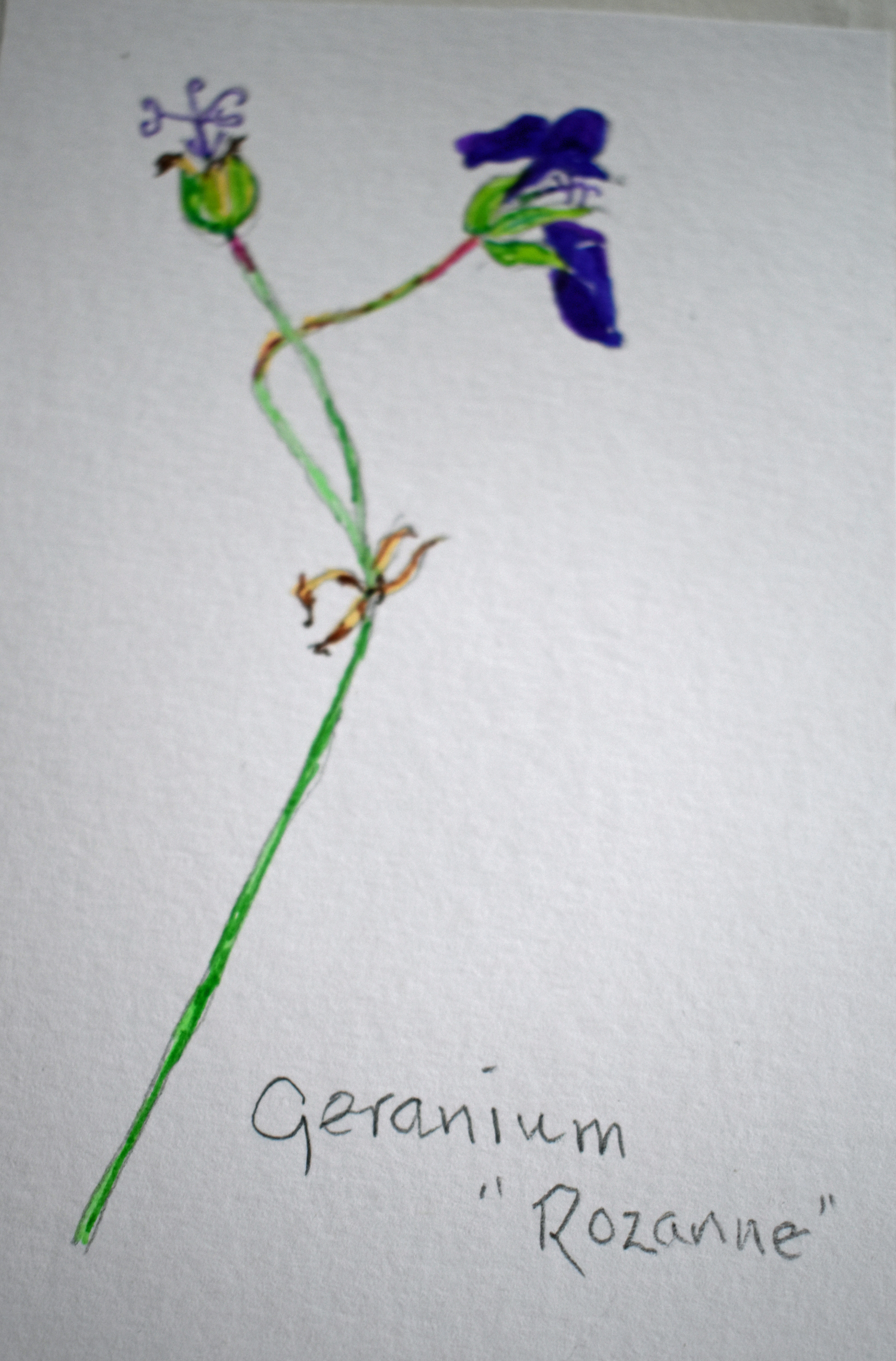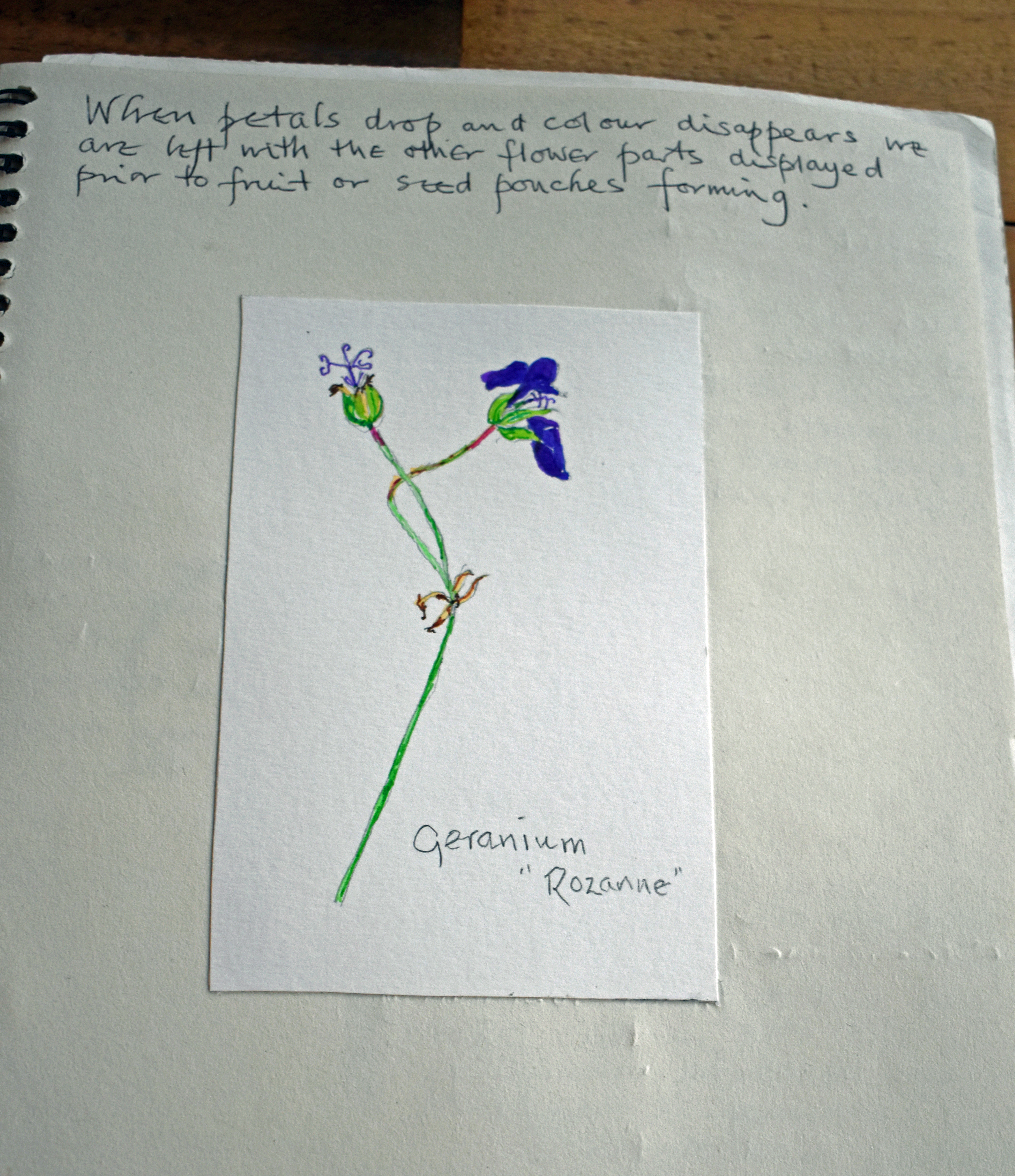 I was looking closely at a little vase of flowers cut from our patch and was amazed at Geranium ‘Rosanne’, and I noted that, “When petals fall and colour disappears we are left with the other flower parts displayed just prior to fruit or seed pouches forming.”