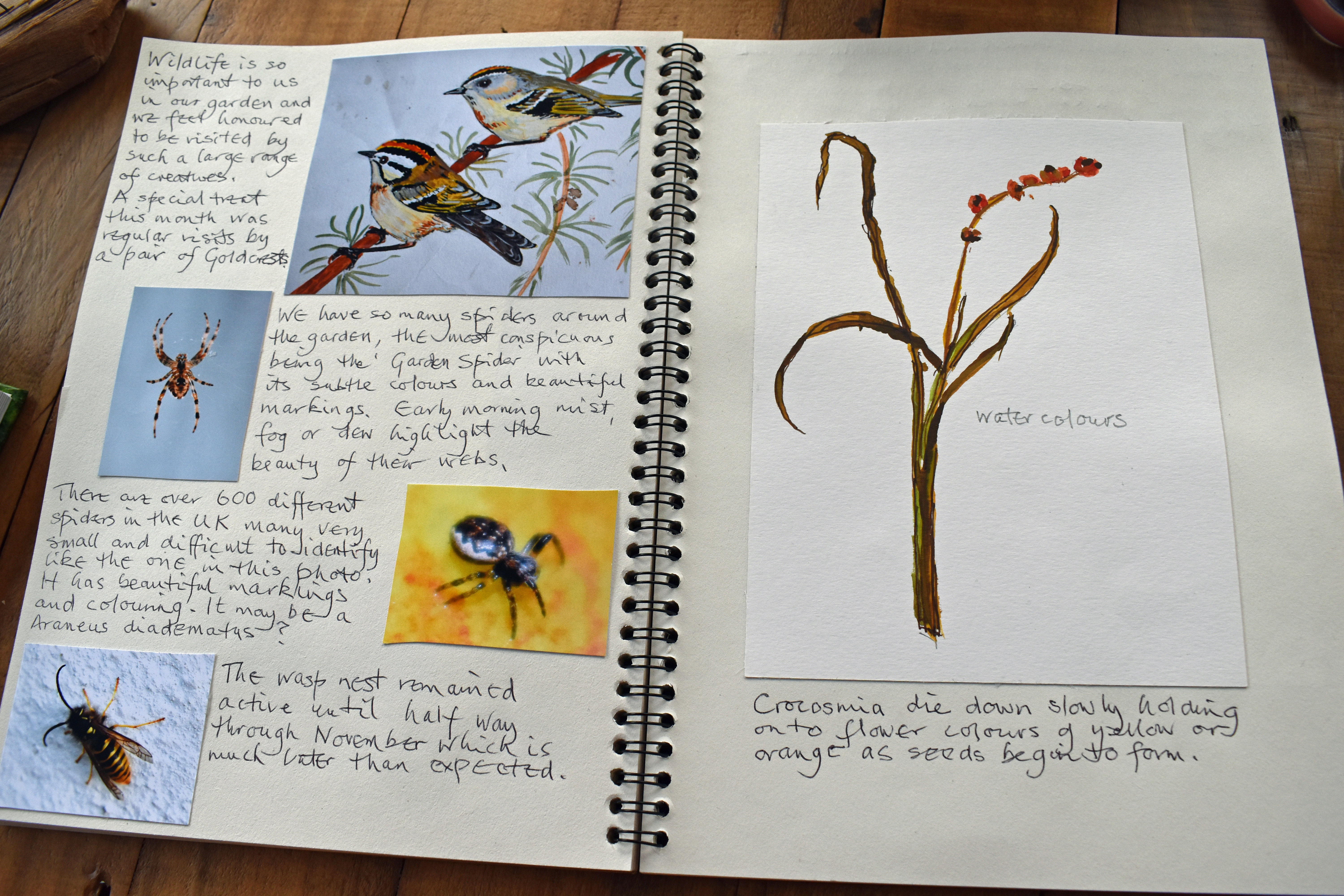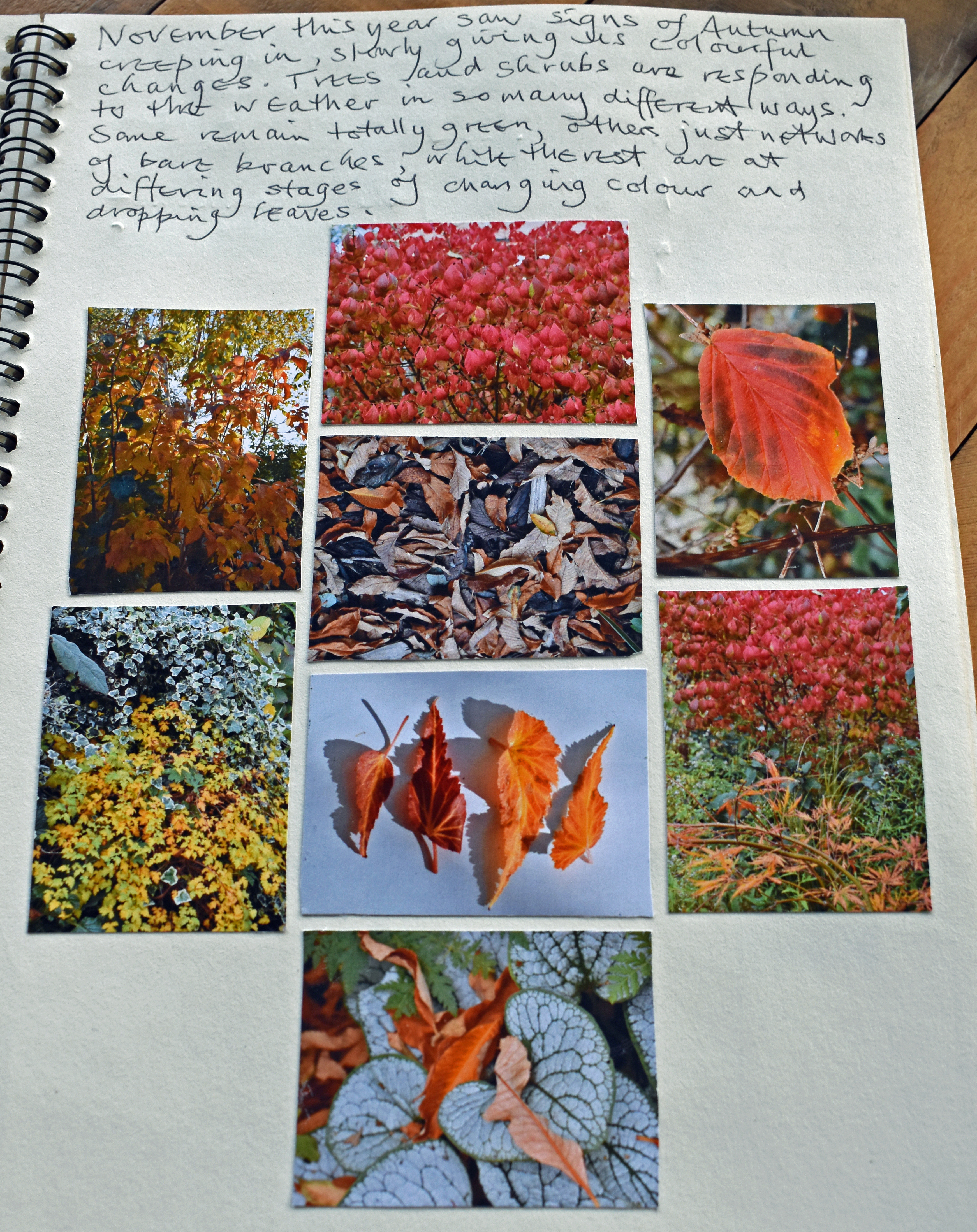 The first page regarding November was about leaves changing colour and falling. “November this year saw signs of Autumn creeping in, slowly giving us colourful changes. Trees and shrubs are responding to the weather in so many different ways. Some remain totally green, others just networks of bare branches, while the rest are at differing stages of changing colour and dropping leaves.”