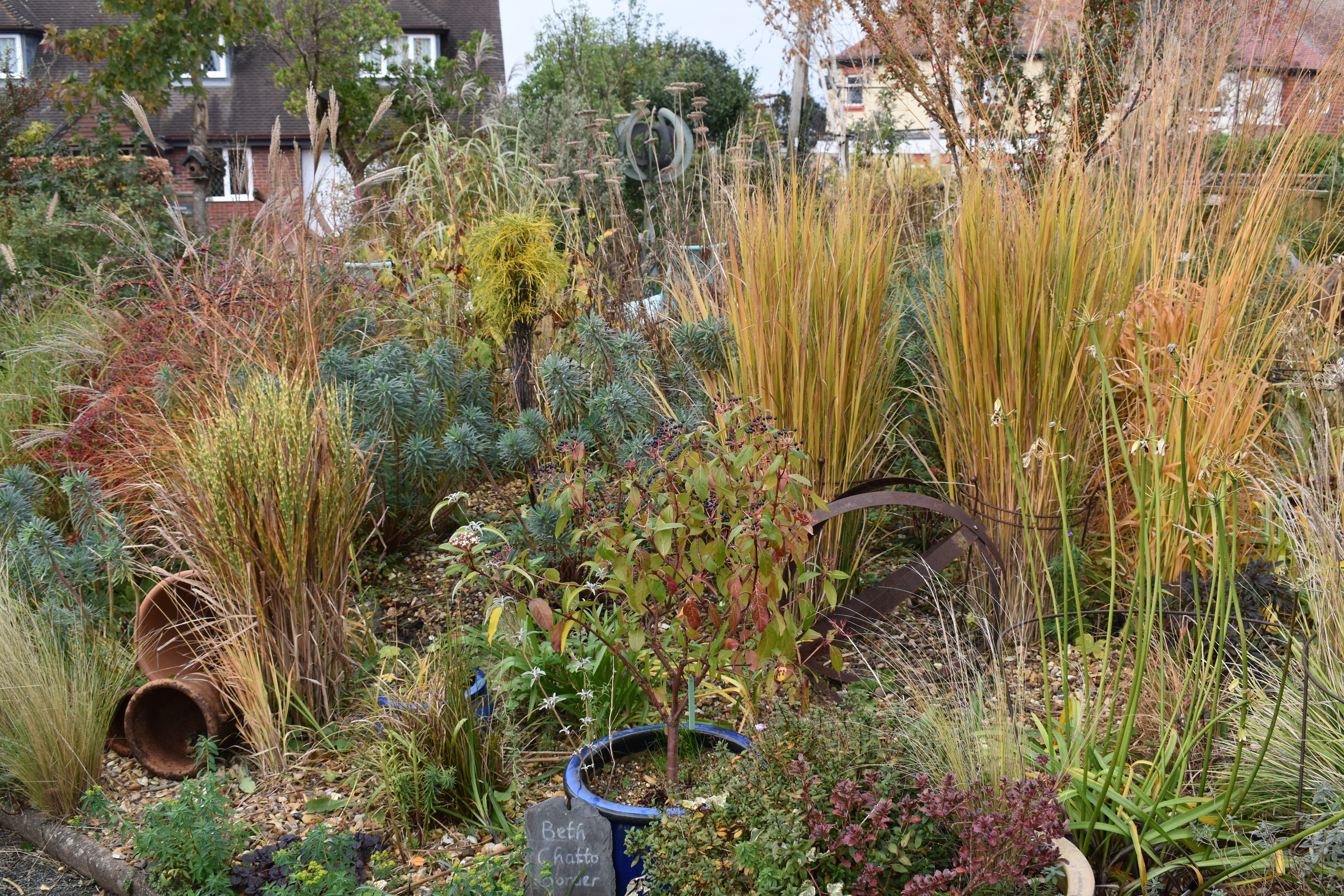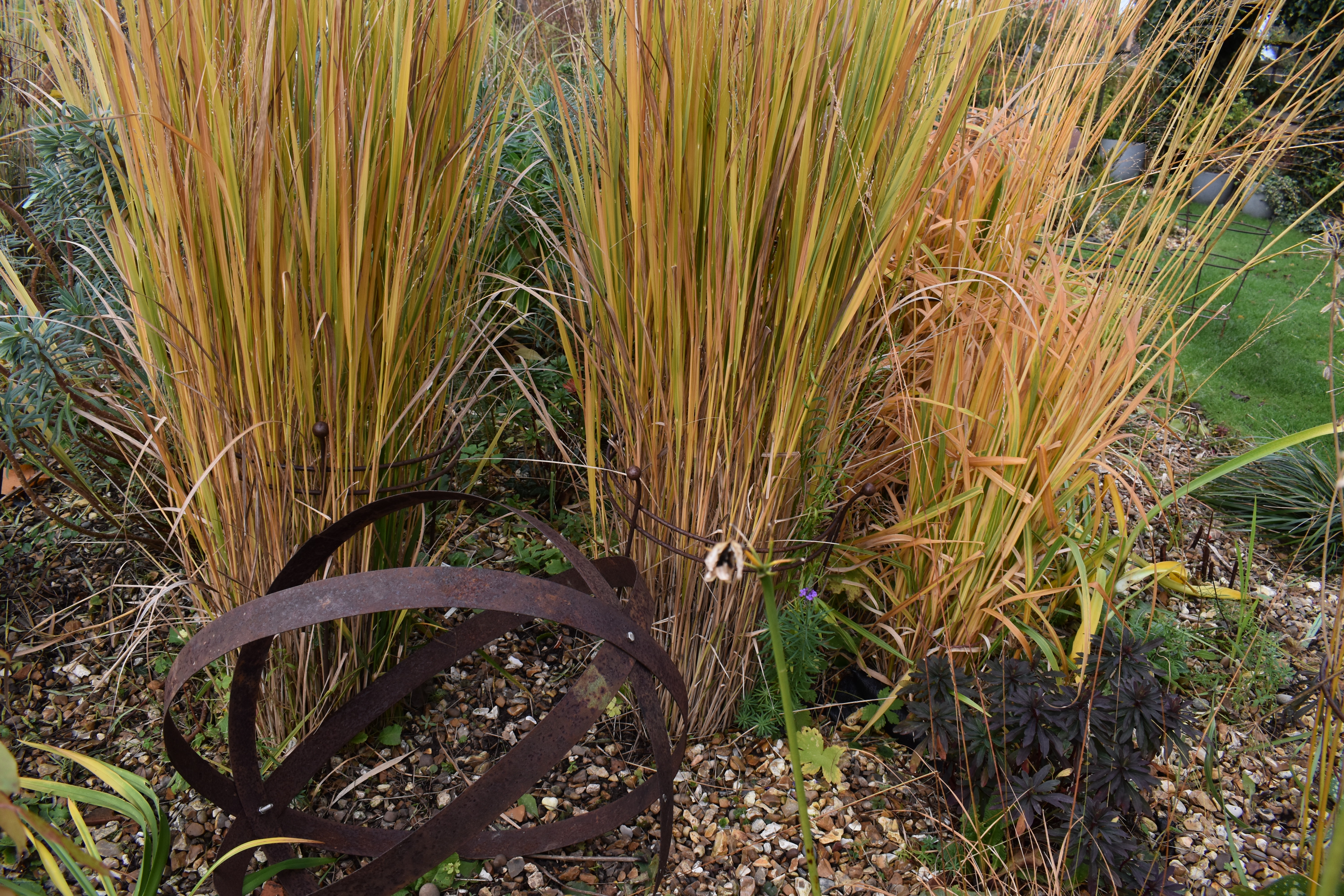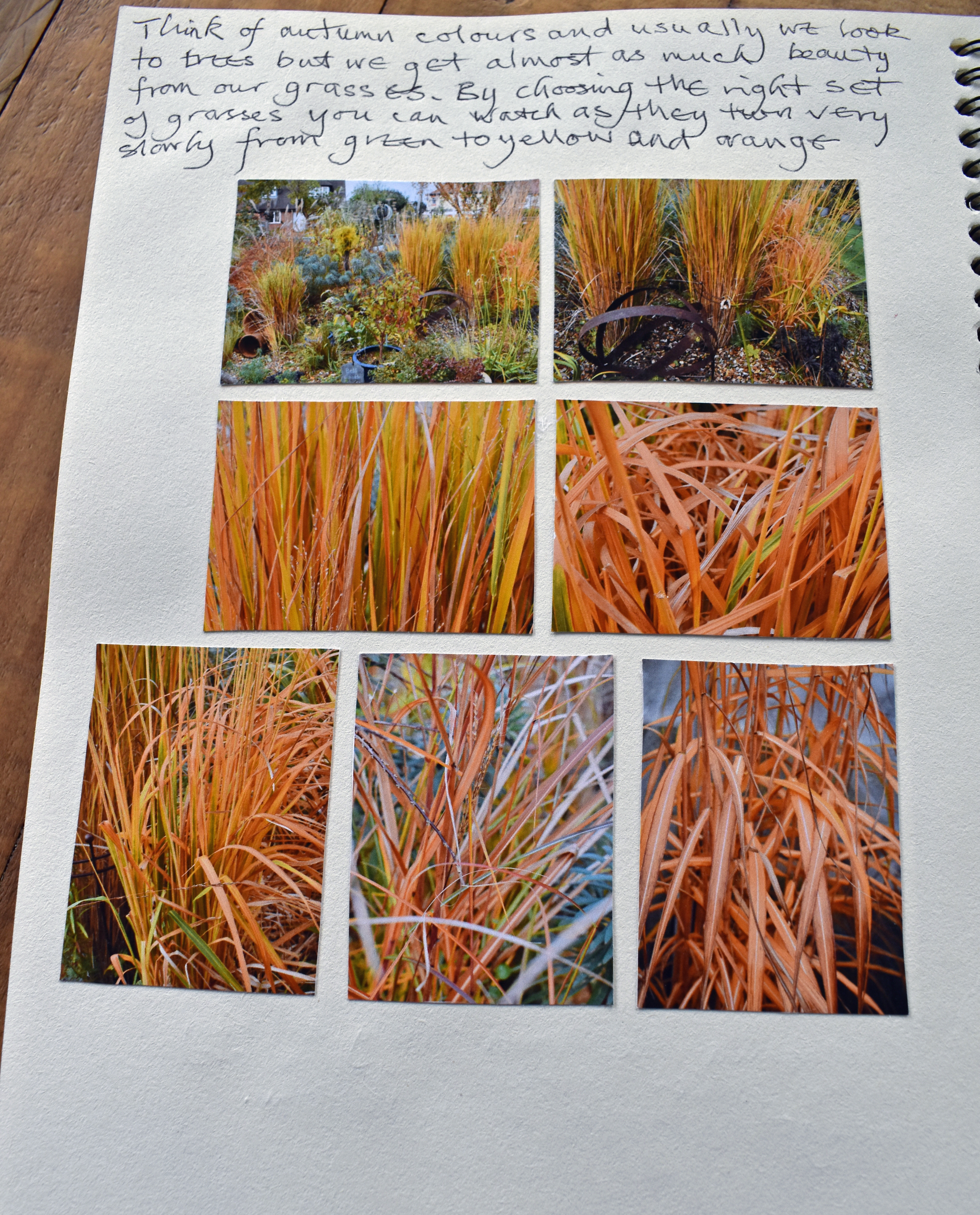 The final page in my garden journal 2023 for November looks again at autumn colour but with a different slant. I wrote, “Think of autumn colours and usually we look to trees but we get almost as much beauty from our grasses. By choosing the right set of grasses you can watch as they turn very slowly from greens to yellows and oranges.” A set of seven photos illustrates this.