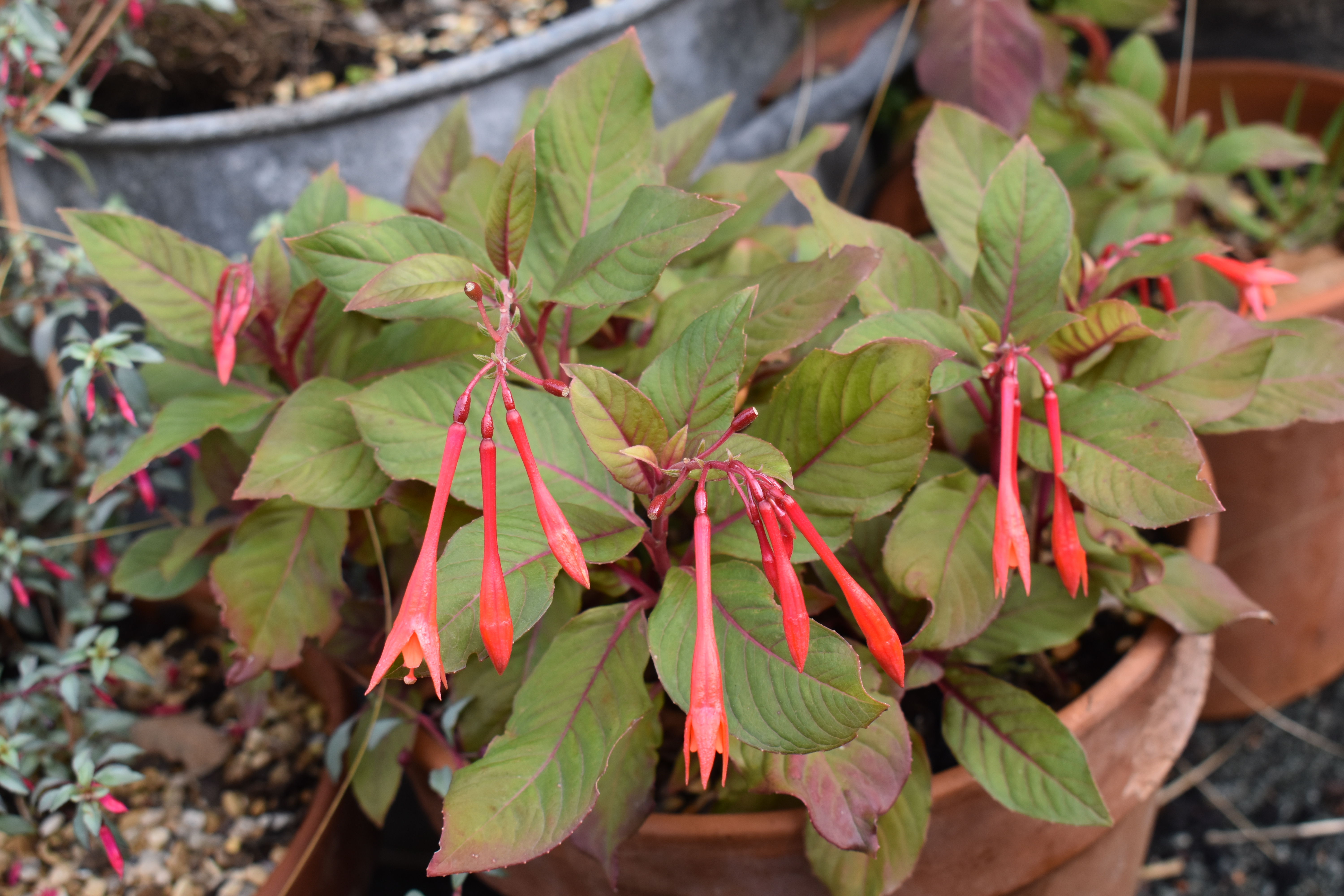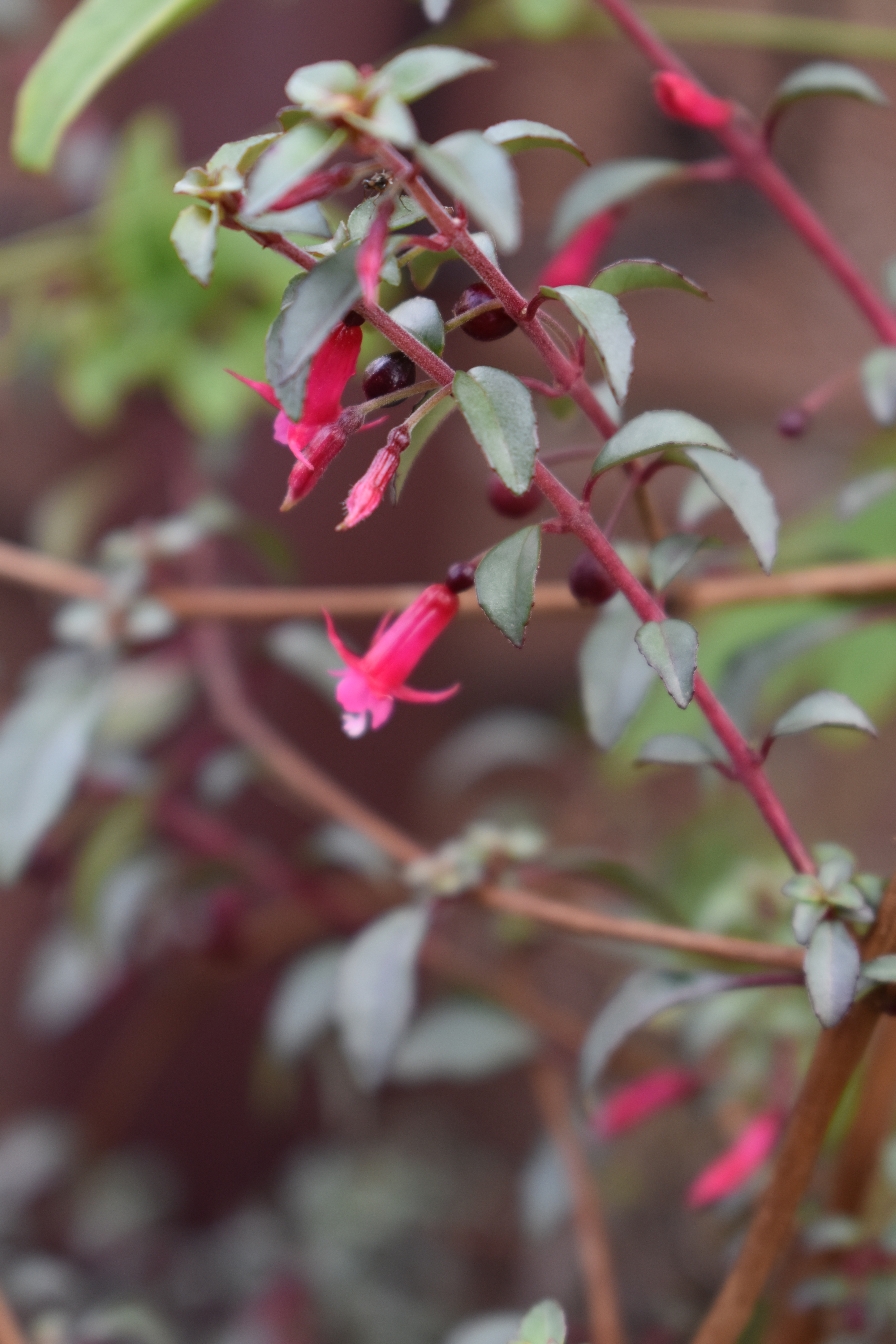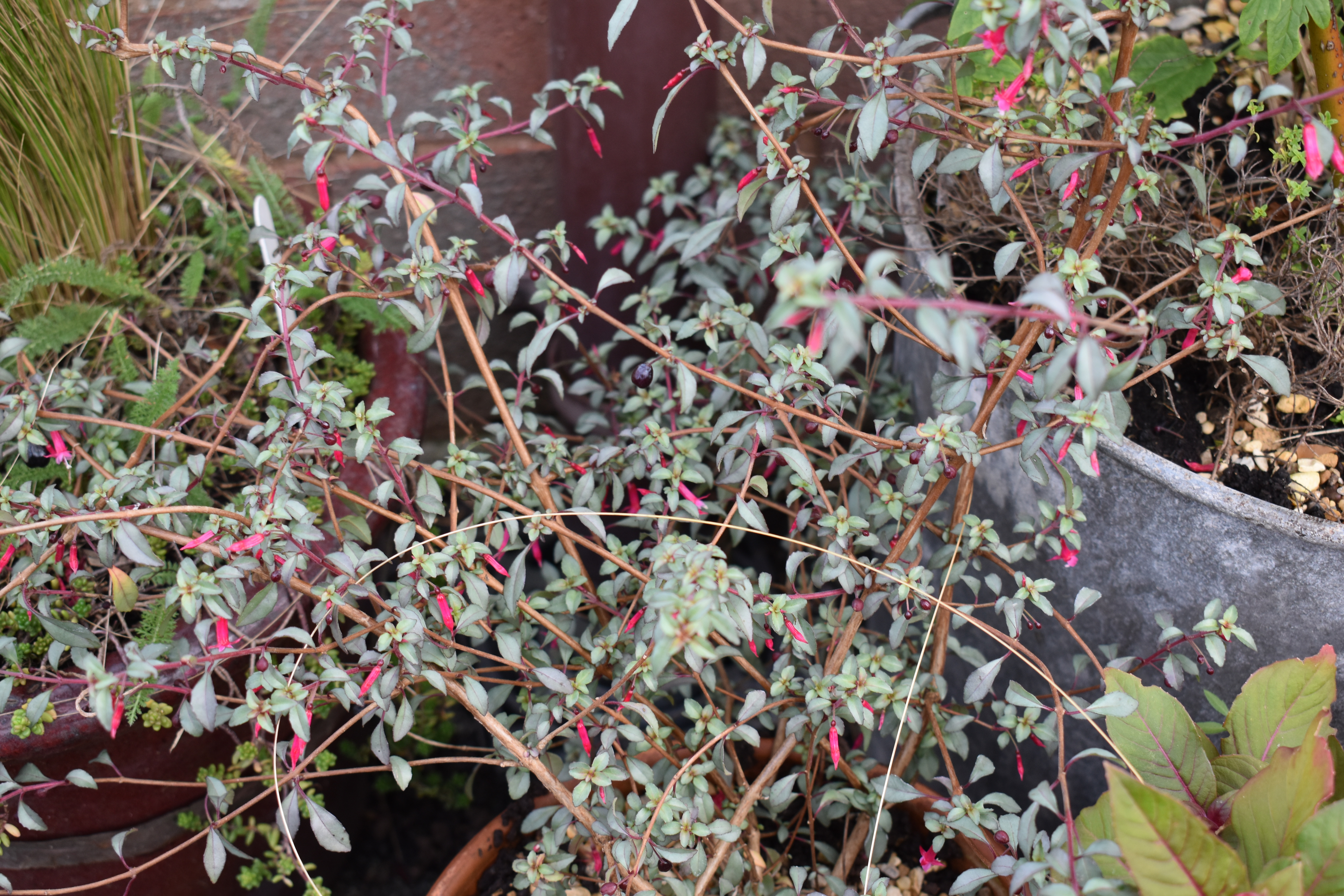 Onto the next page and I featured some of our fuschia and wrote,” We have a few fuschia plants flowering well outside in the garden, with several growing in containers so that we can move them into the greenhouse when frosts arrive. One hardy fuschia is growing in the ‘Prairie Garden’, F. magellanica which is still covered in flowers. We dislike the blousy ballerina like fuschia so we tend to grow species. They are far more delicate, with more interesting foliage including a glaucous leaved variety, F. ‘Silver Linings’. Some of the flowers are tiny, no more than a centimetre long. Many of these fuschias are smaller than their more gaudy cousins.”