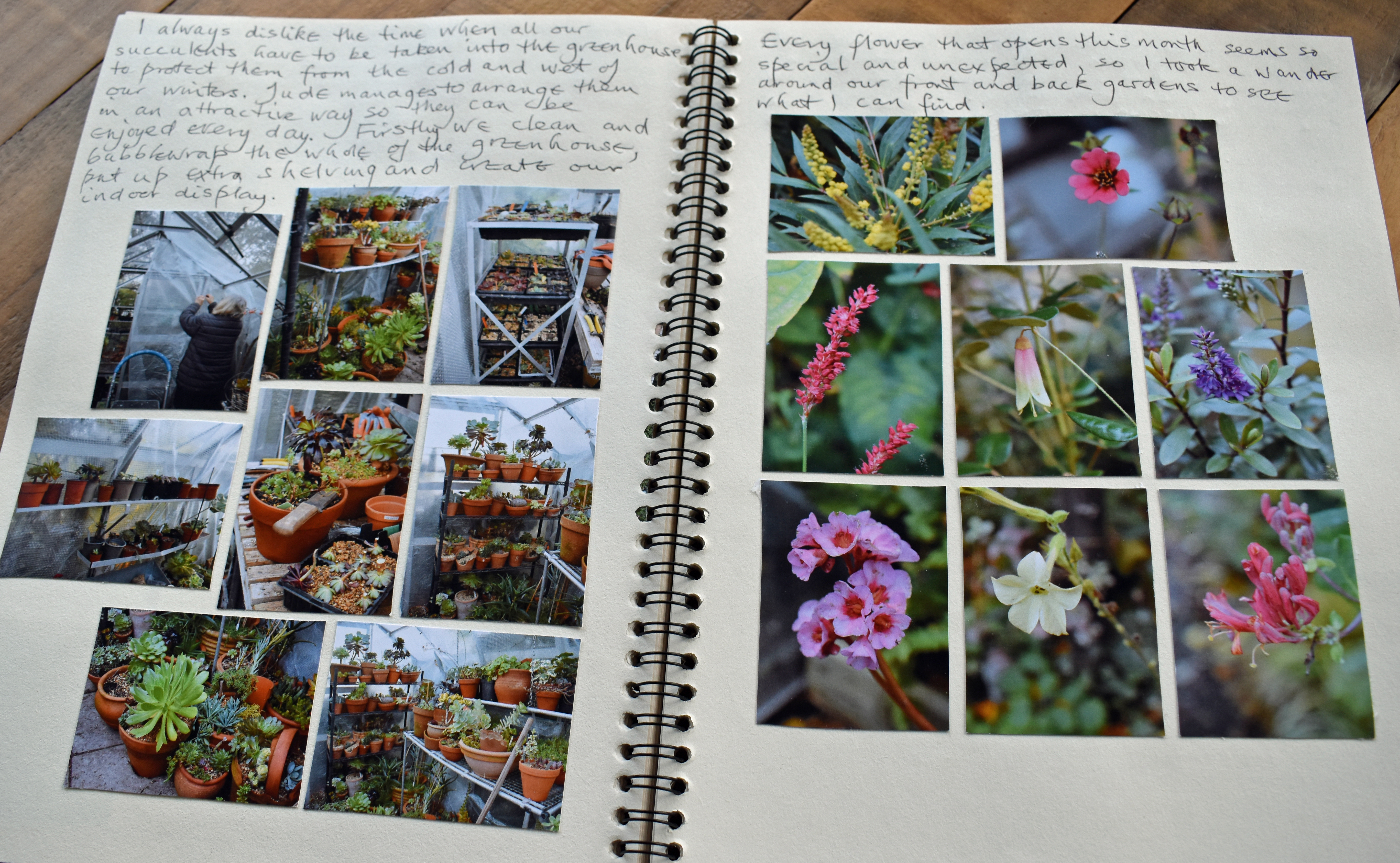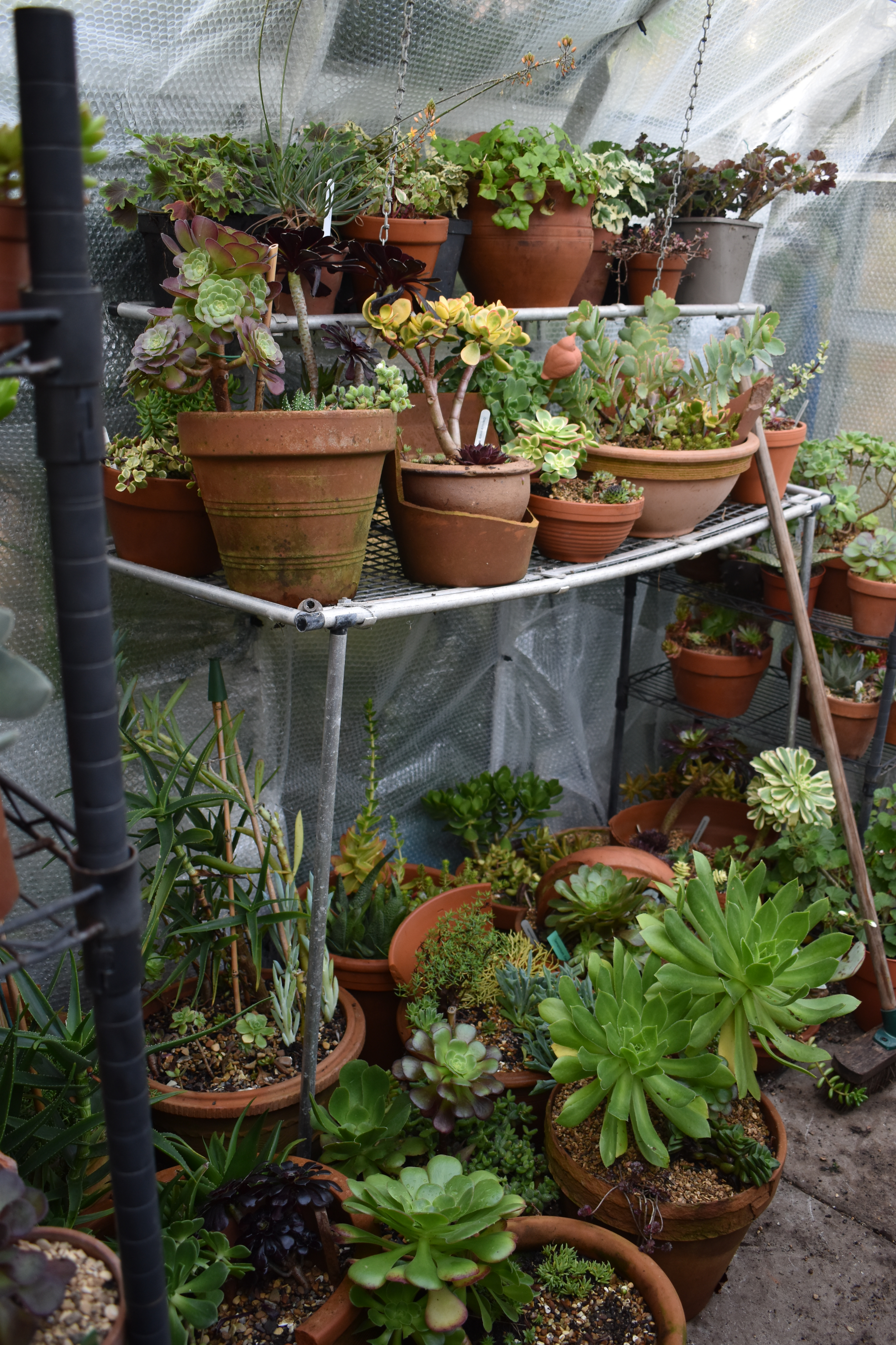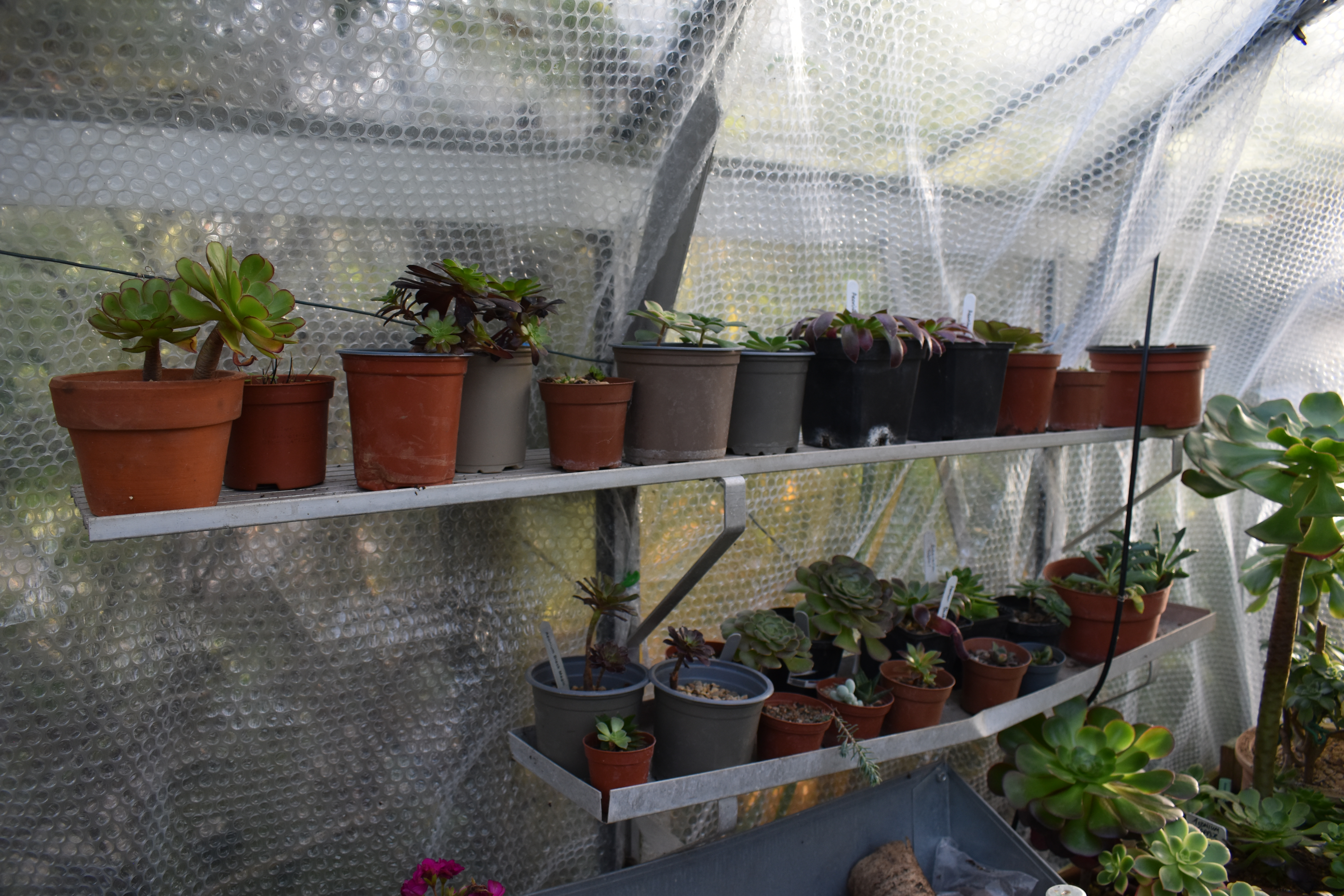 I wrote,“I always dislike the time when all our succulents have to be taken into the greenhouse to protect them from the cold and wet of our winters. Jude manages to arrange them in an attractive way so they can be enjoyed every day. Firstly we clean and bubblewrap the whole of the greenhouse, put up extra shelving and create our indoor display.”