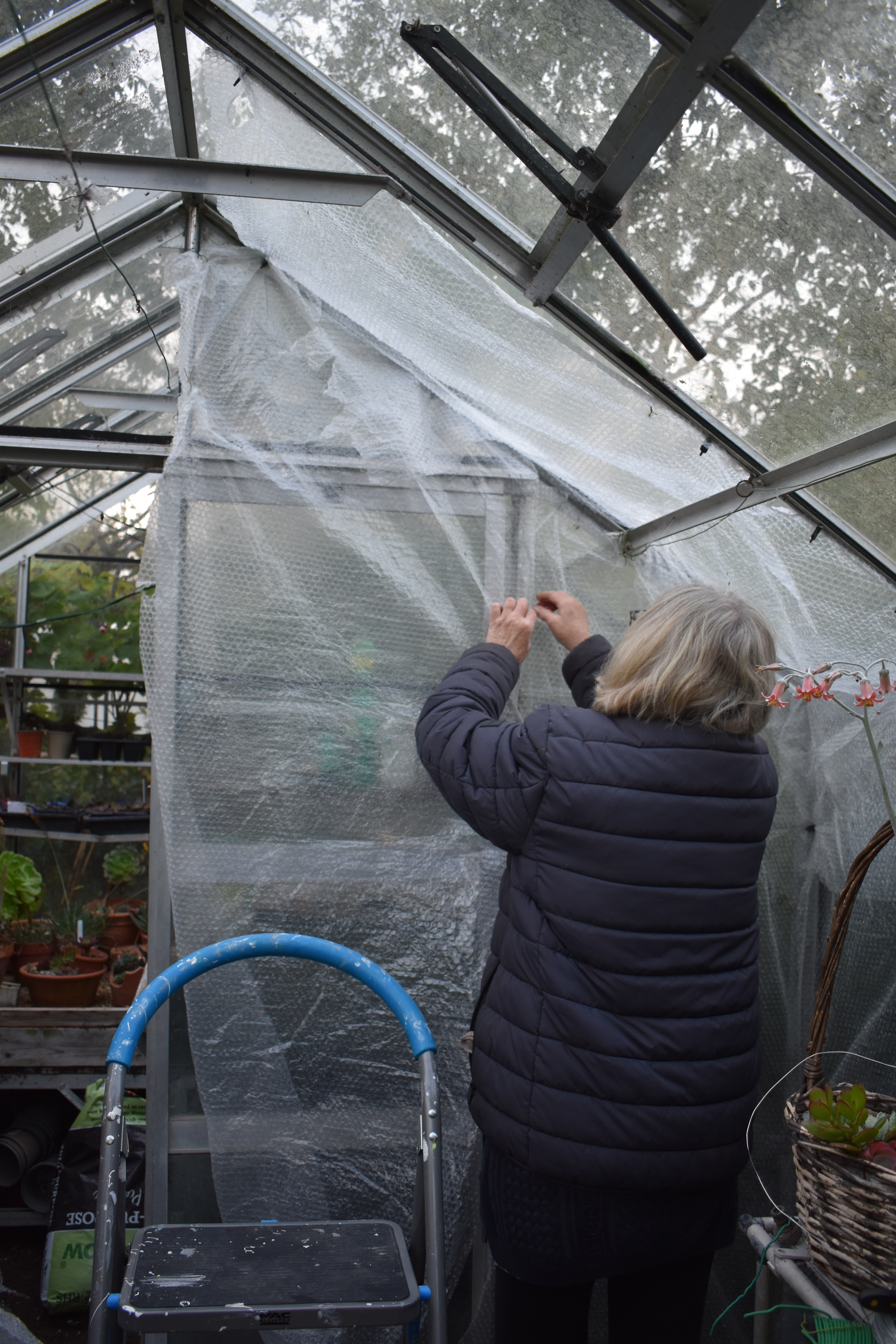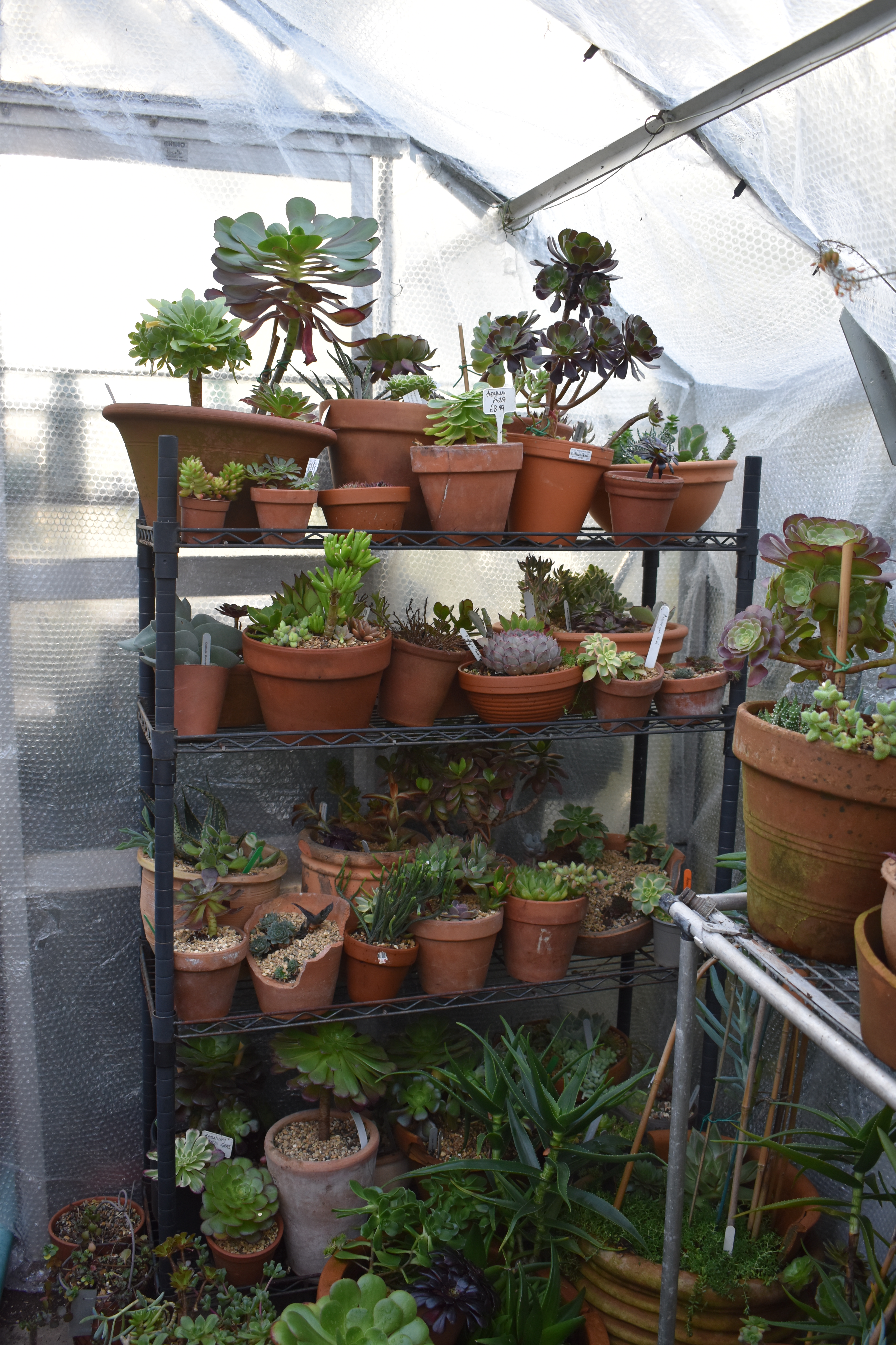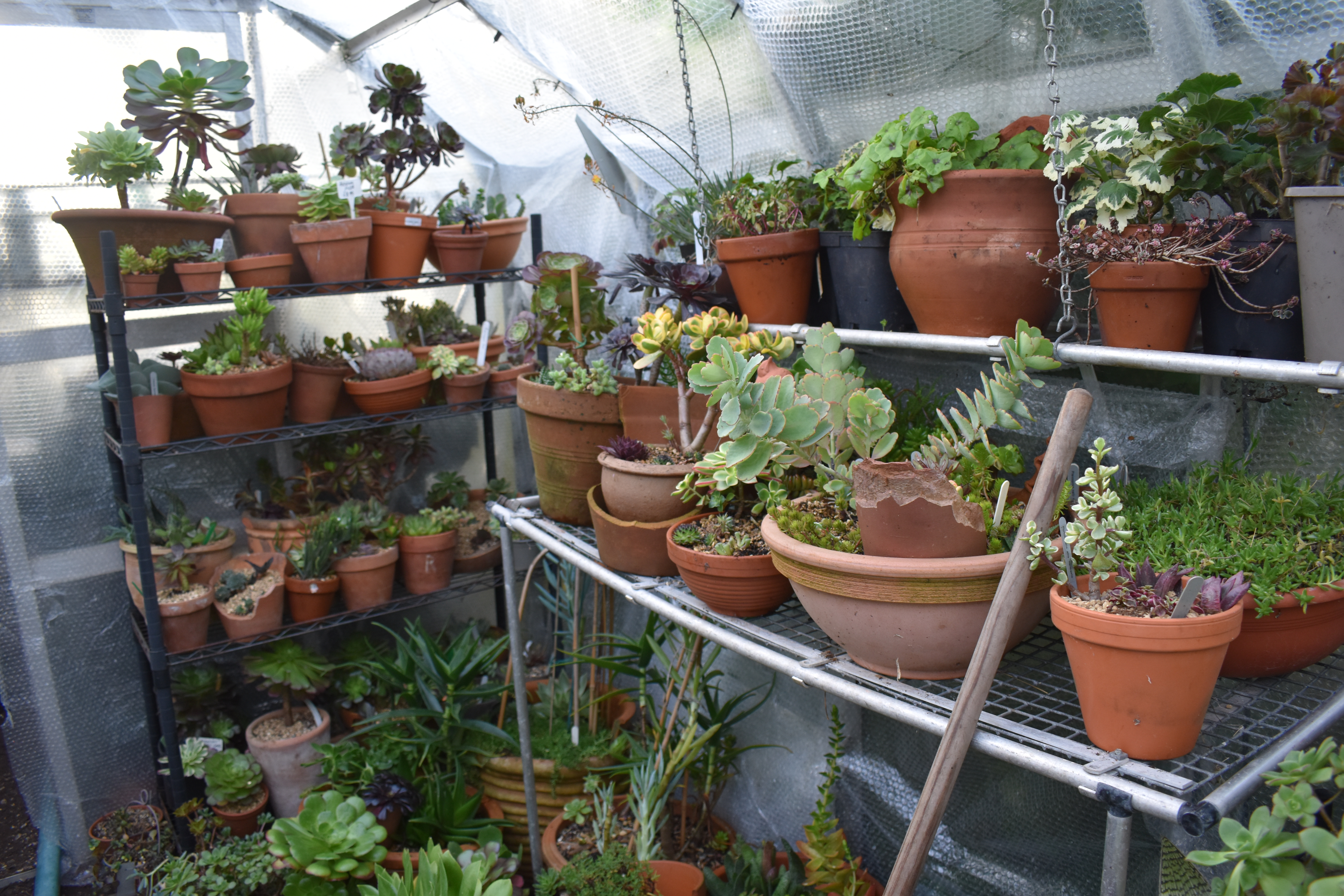 I wrote,“I always dislike the time when all our succulents have to be taken into the greenhouse to protect them from the cold and wet of our winters. Jude manages to arrange them in an attractive way so they can be enjoyed every day. Firstly we clean and bubblewrap the whole of the greenhouse, put up extra shelving and create our indoor display.”