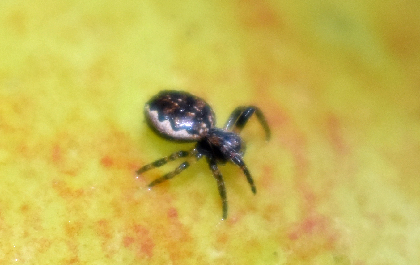 “There are over 600 different spiders in the UK, many very small and difficult to identify like the one in this photograph. It has beautiful markings and colouring. It may be an ‘Araneus diadematus?’ “