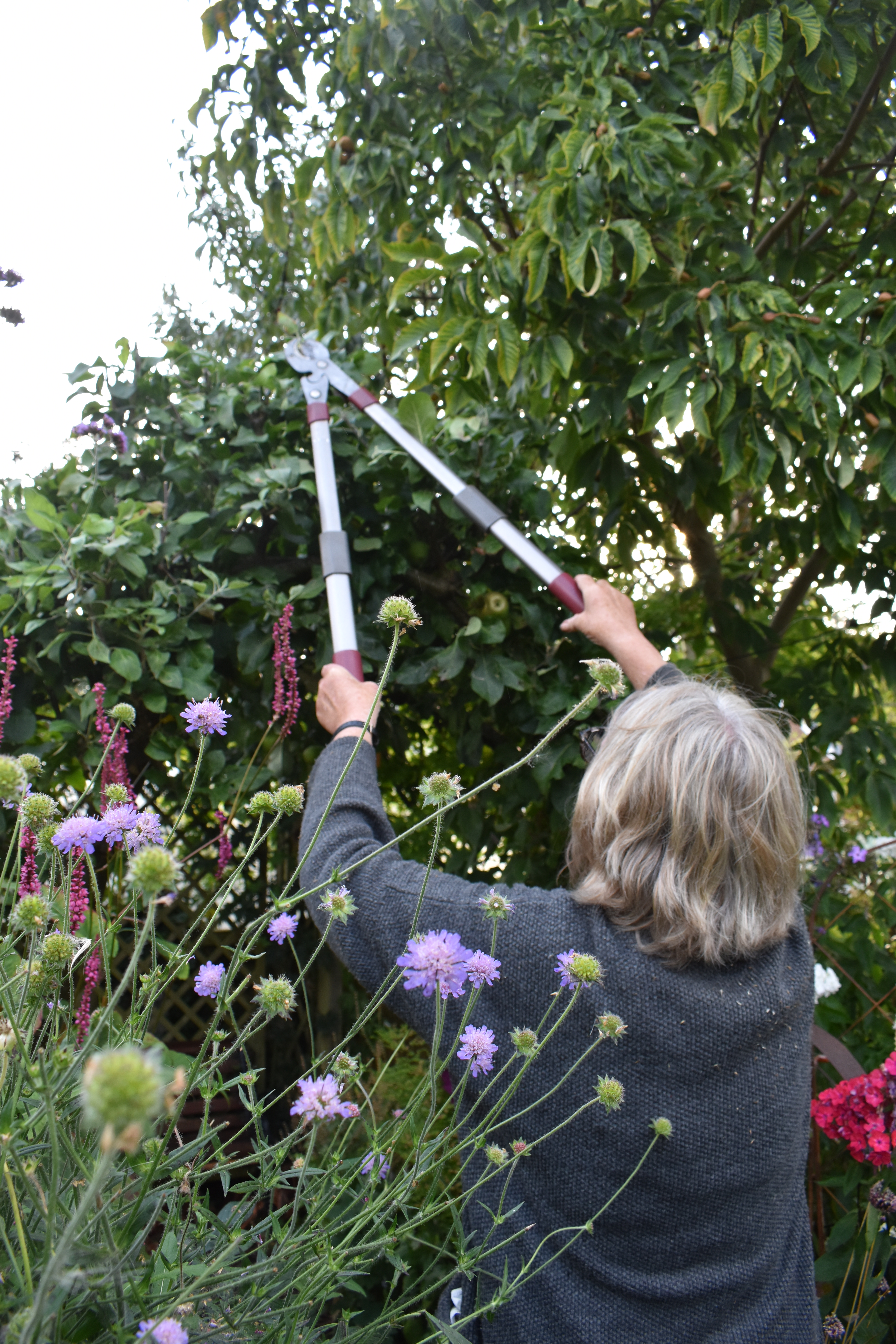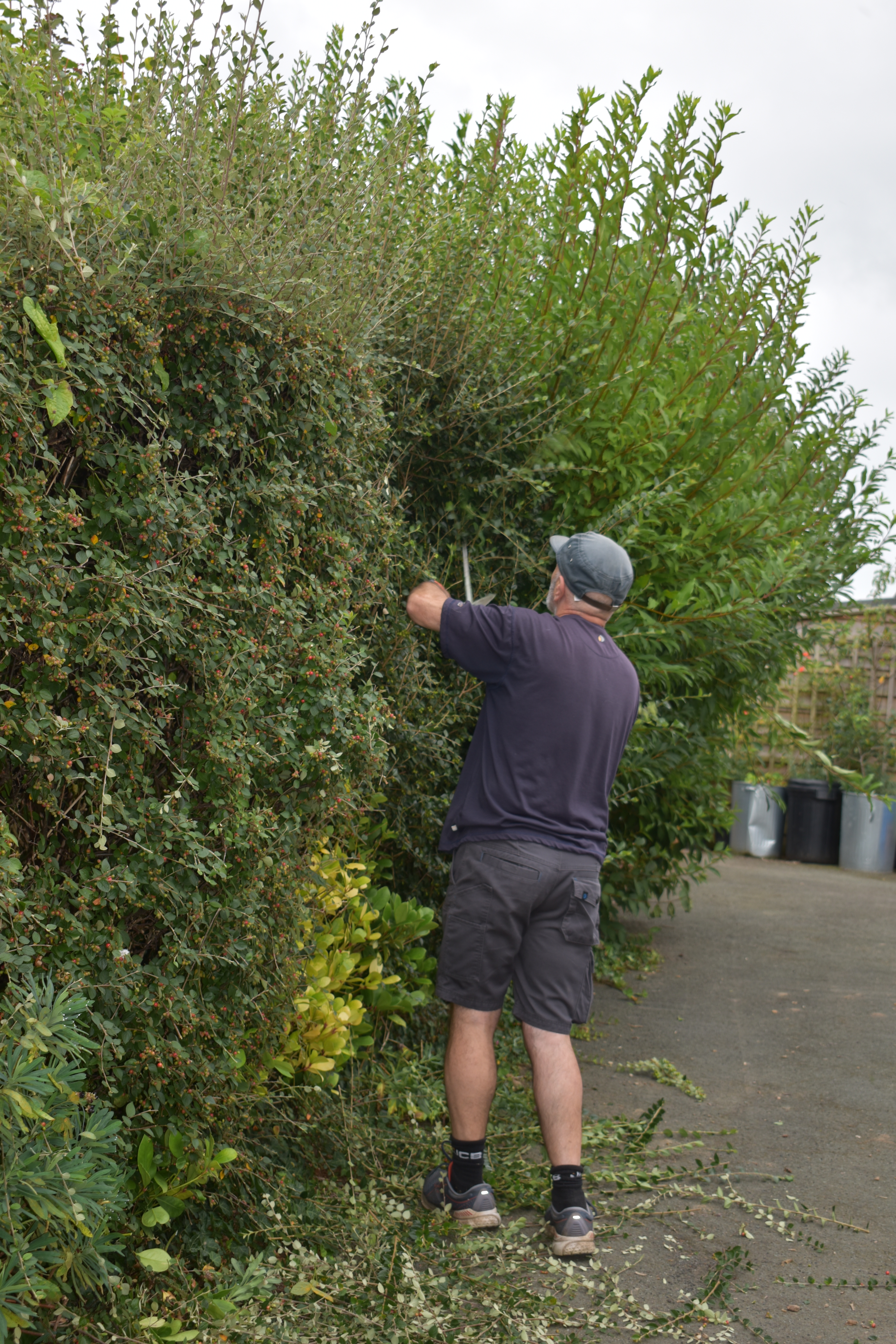 I noted that, “In the summer many garden jobs need doing almost daily such as deadheading and tying in climbers. Others are done less frequently but regularly such as brushing up the drive edges . Hedge cutting happens once a year, a job we leave to Ian.”