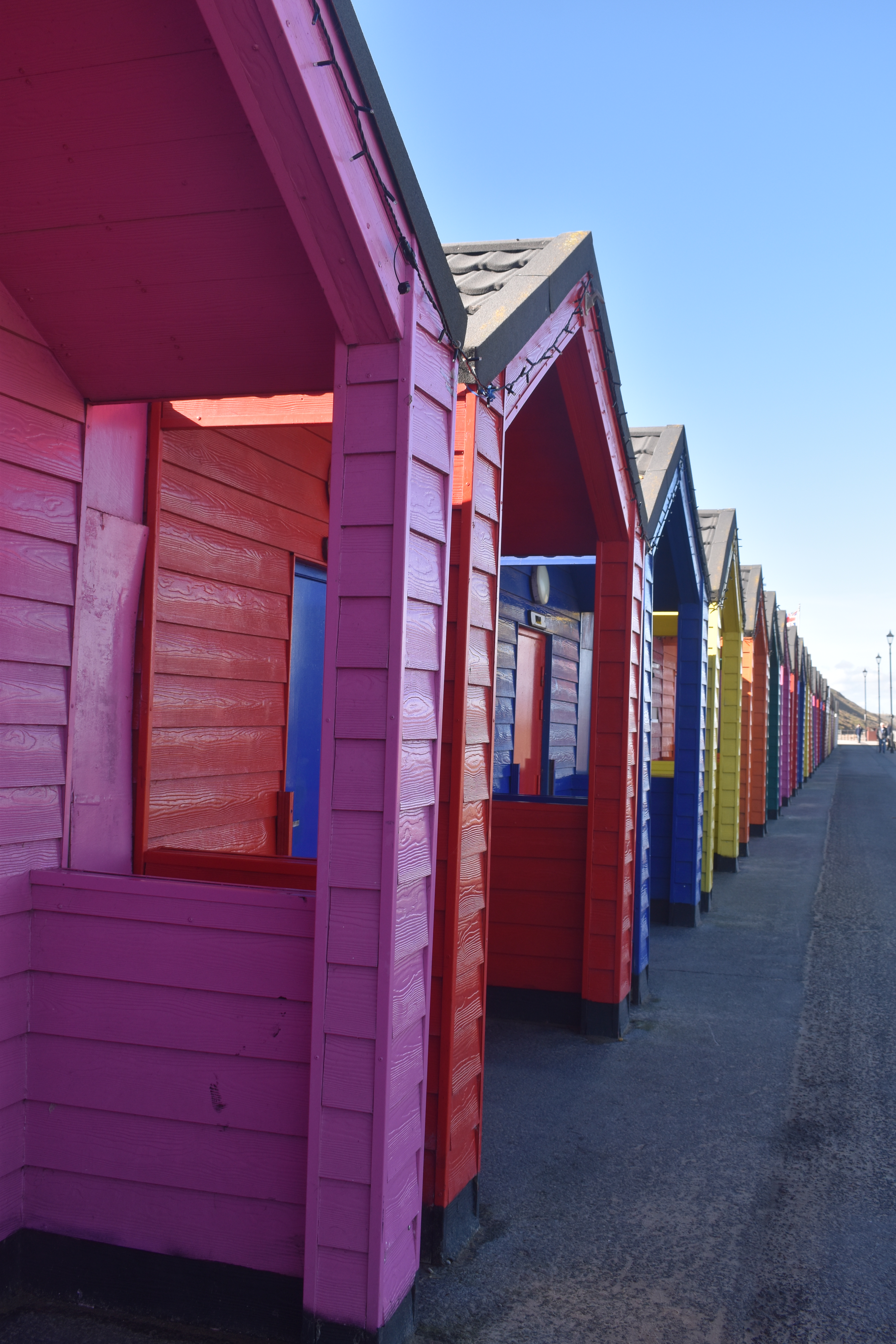We walked along the promenade until we found a row of brightly painted beach huts. The paintwork was glossy and the brightest shades of pinks, reds and many others. They were so well looked after which isn’t the case everywhere. Each one had a name sign above their door and a few were used as a beach shop and others boasted faded signs depicting their purposes.