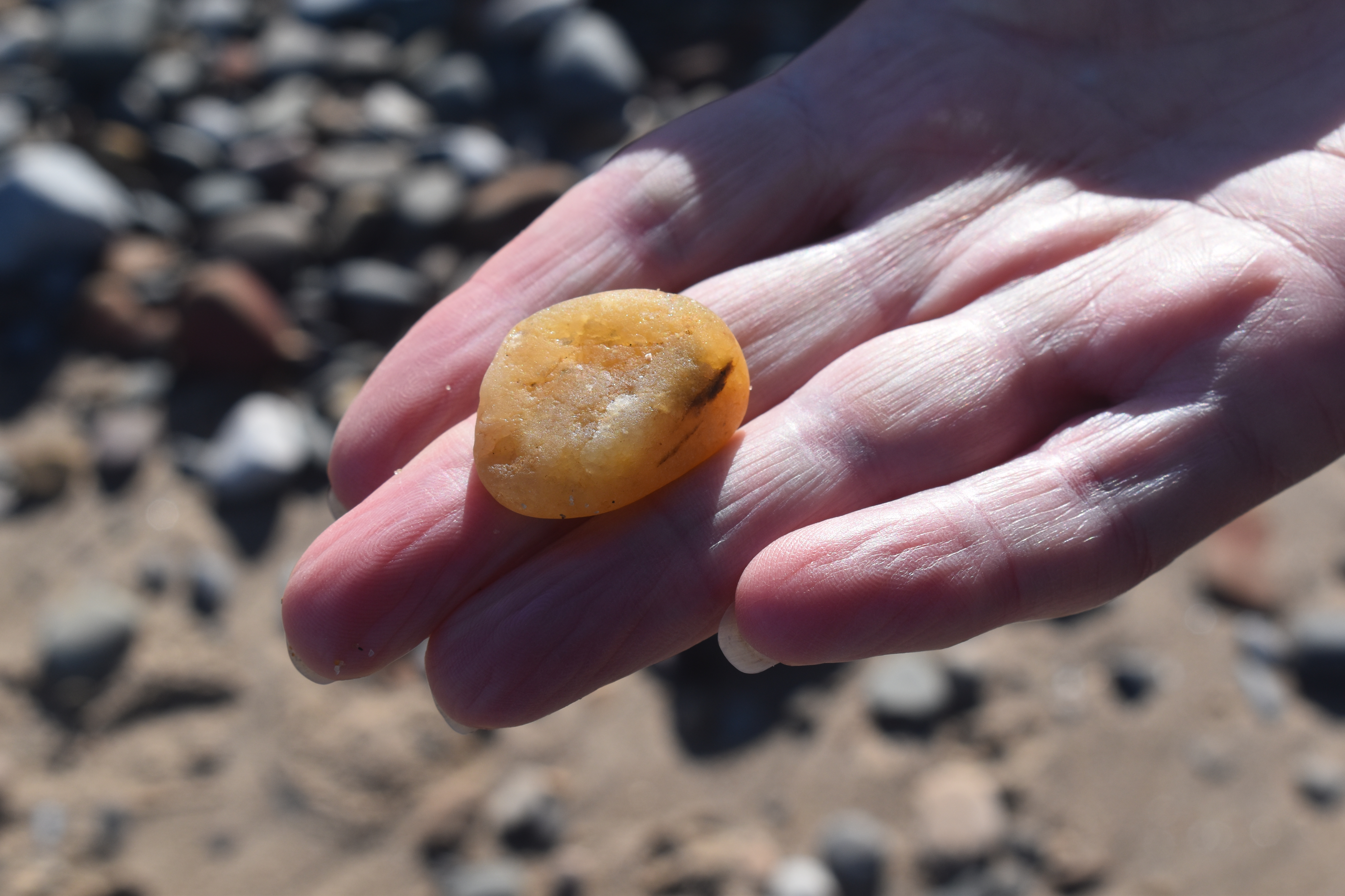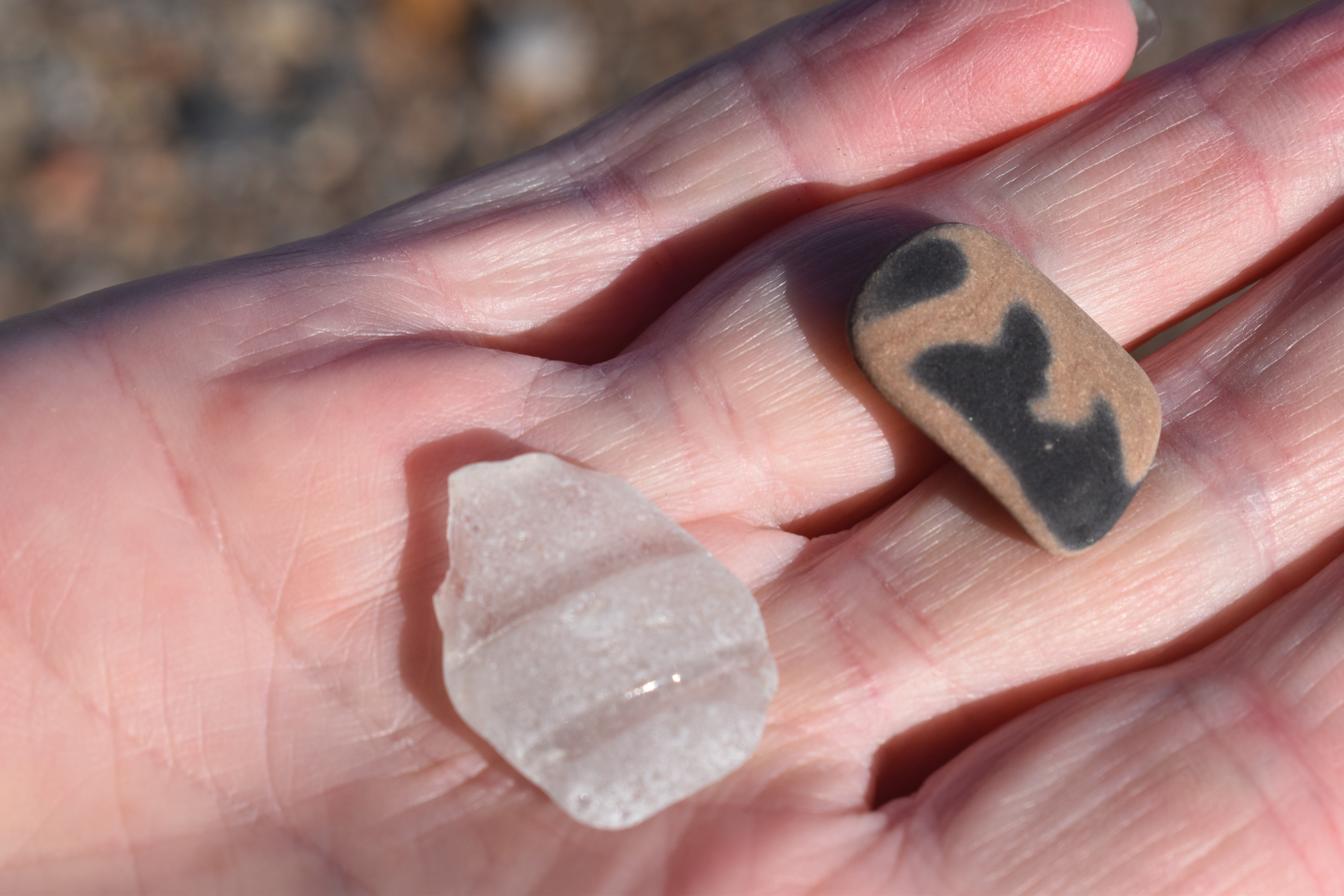 From the beach huts we took stone steps down to the beach and wandered back towards the pier following the line where sand met pebbles. Here we found some beautiful pebbles and sea glass.