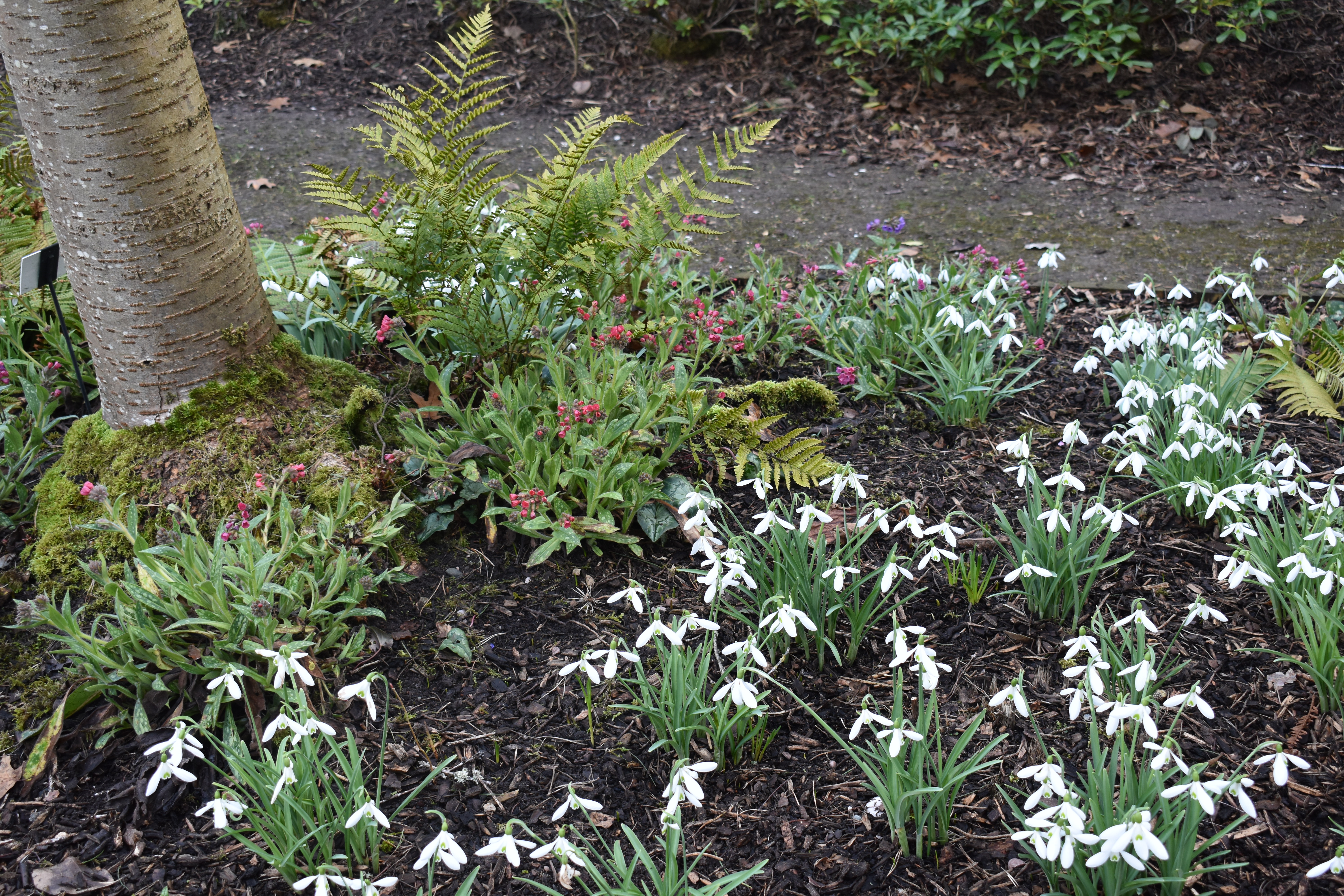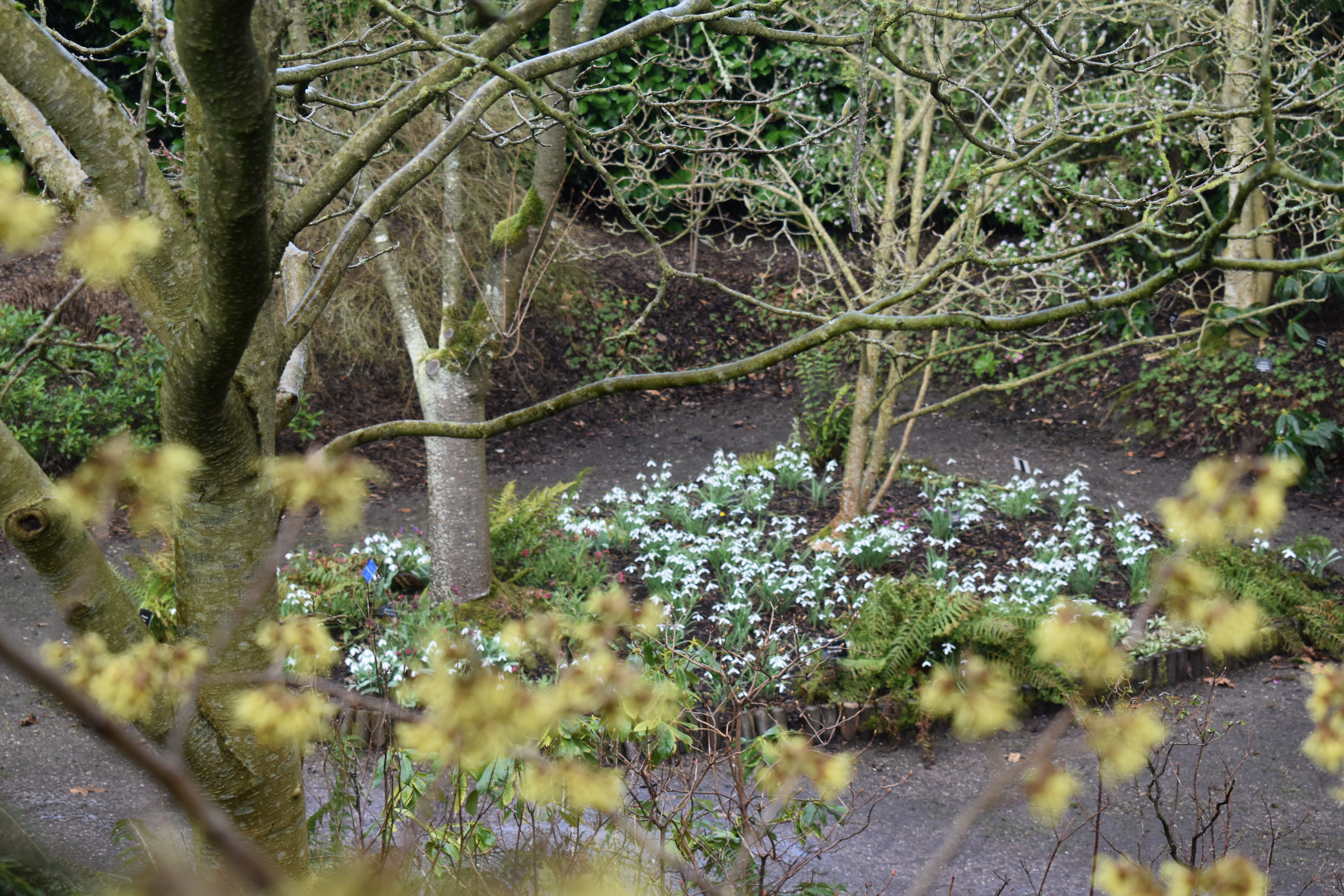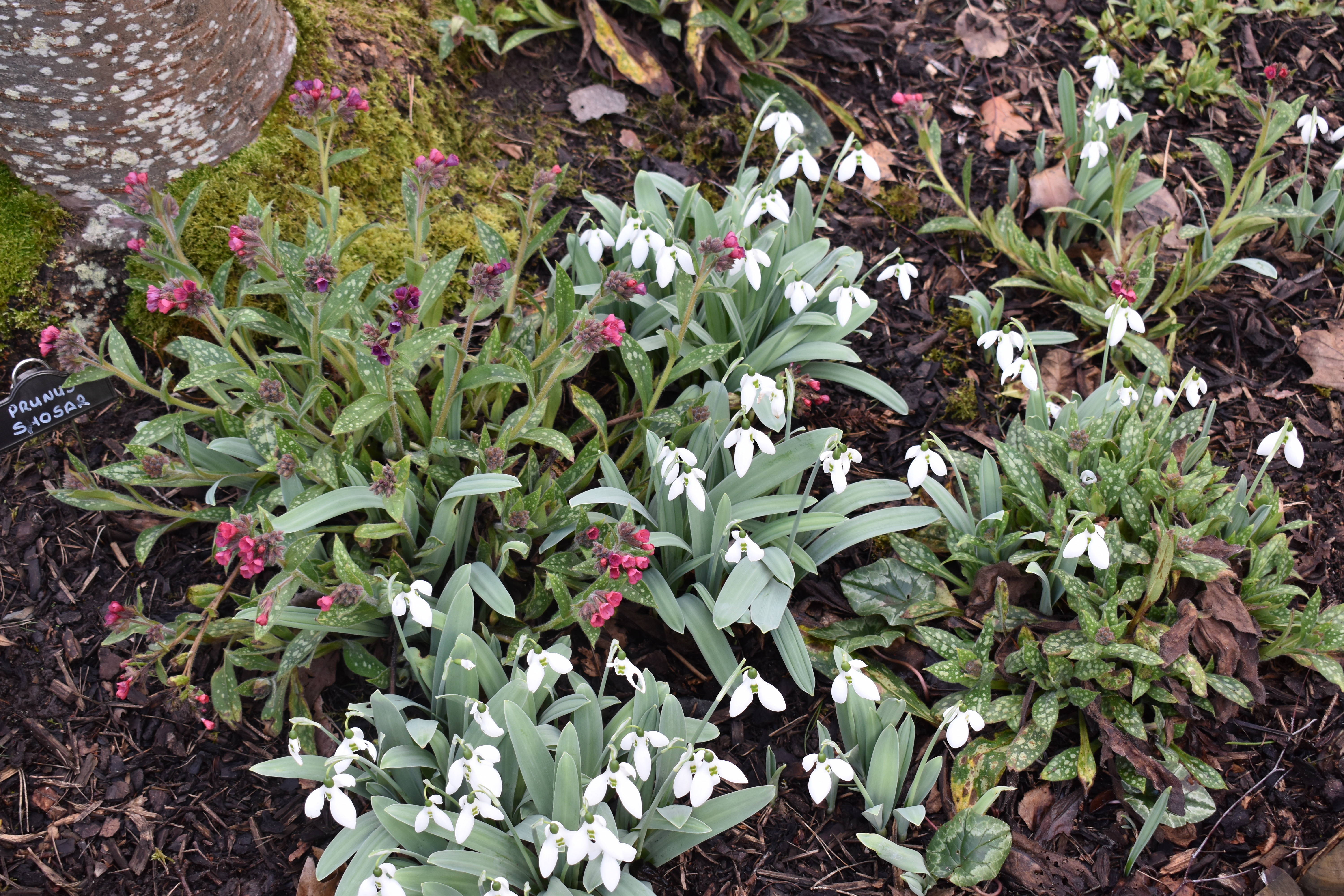 Returning to our original routeway, we enjoyed the rich sweet scent of Daphnes and low spring plantings. Below the photos show Daphne bholua ‘Spring Beauty’, the blossom of a prunus and the spring flowers of pulmonaria and snowdrops covering the ground below.