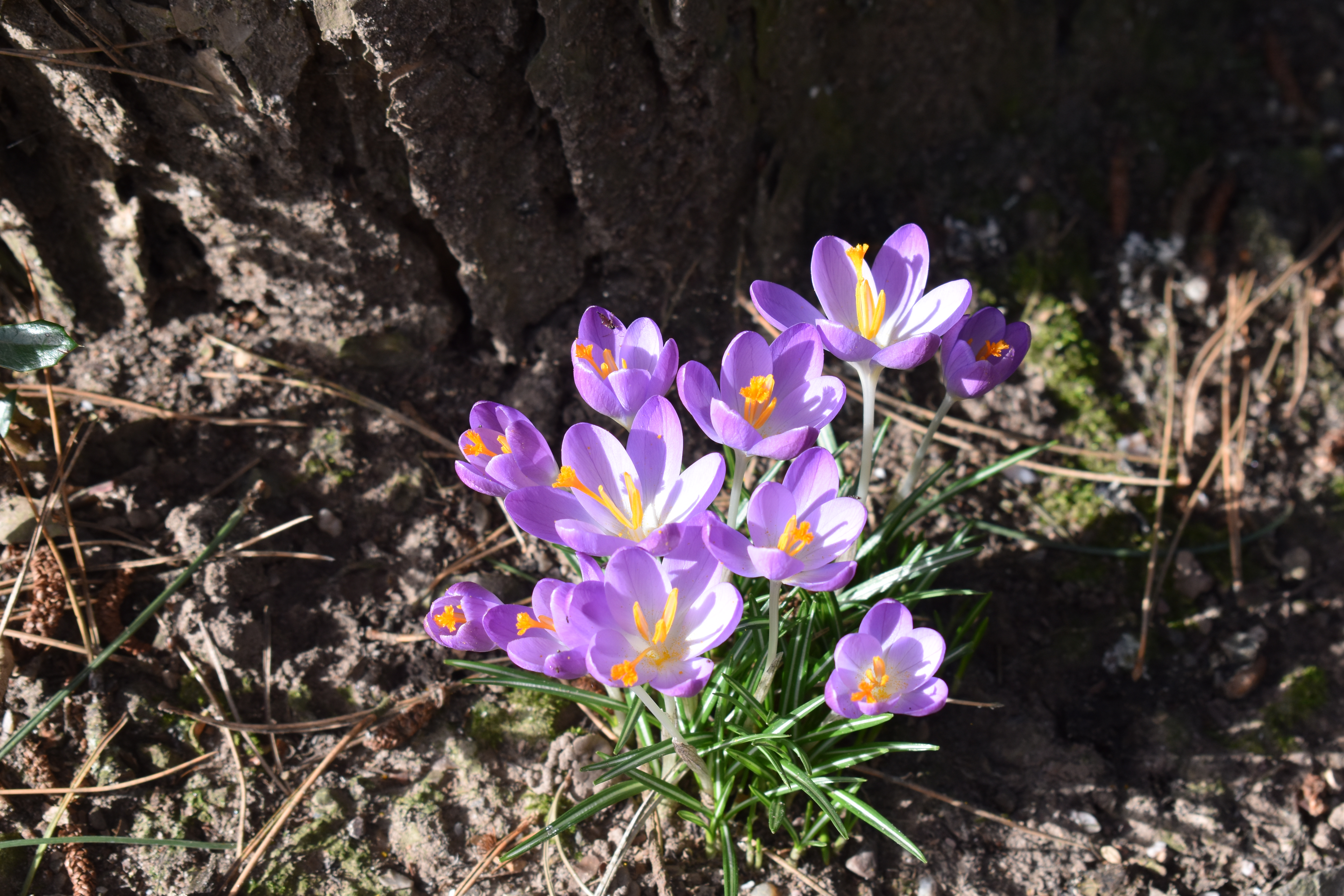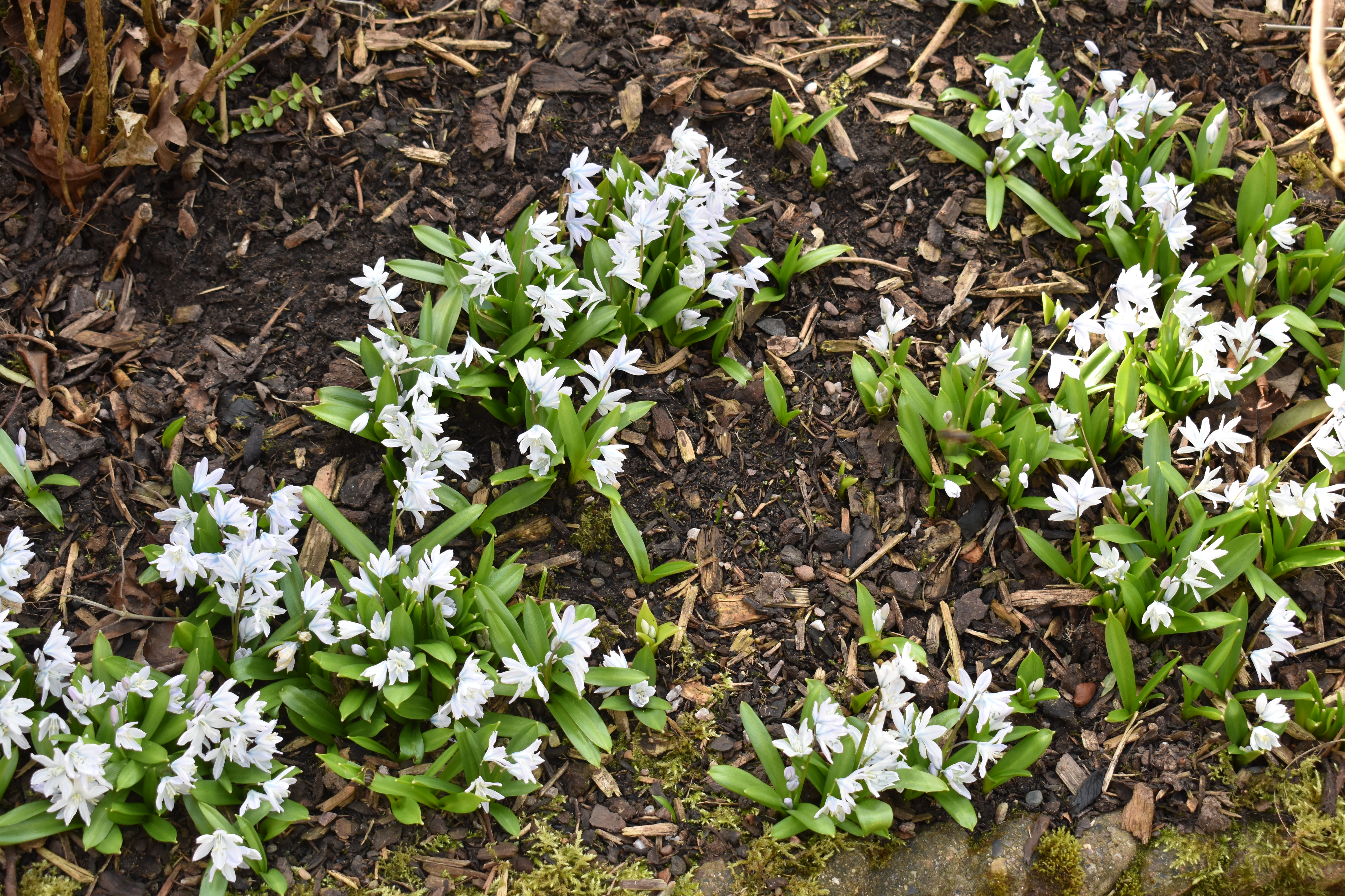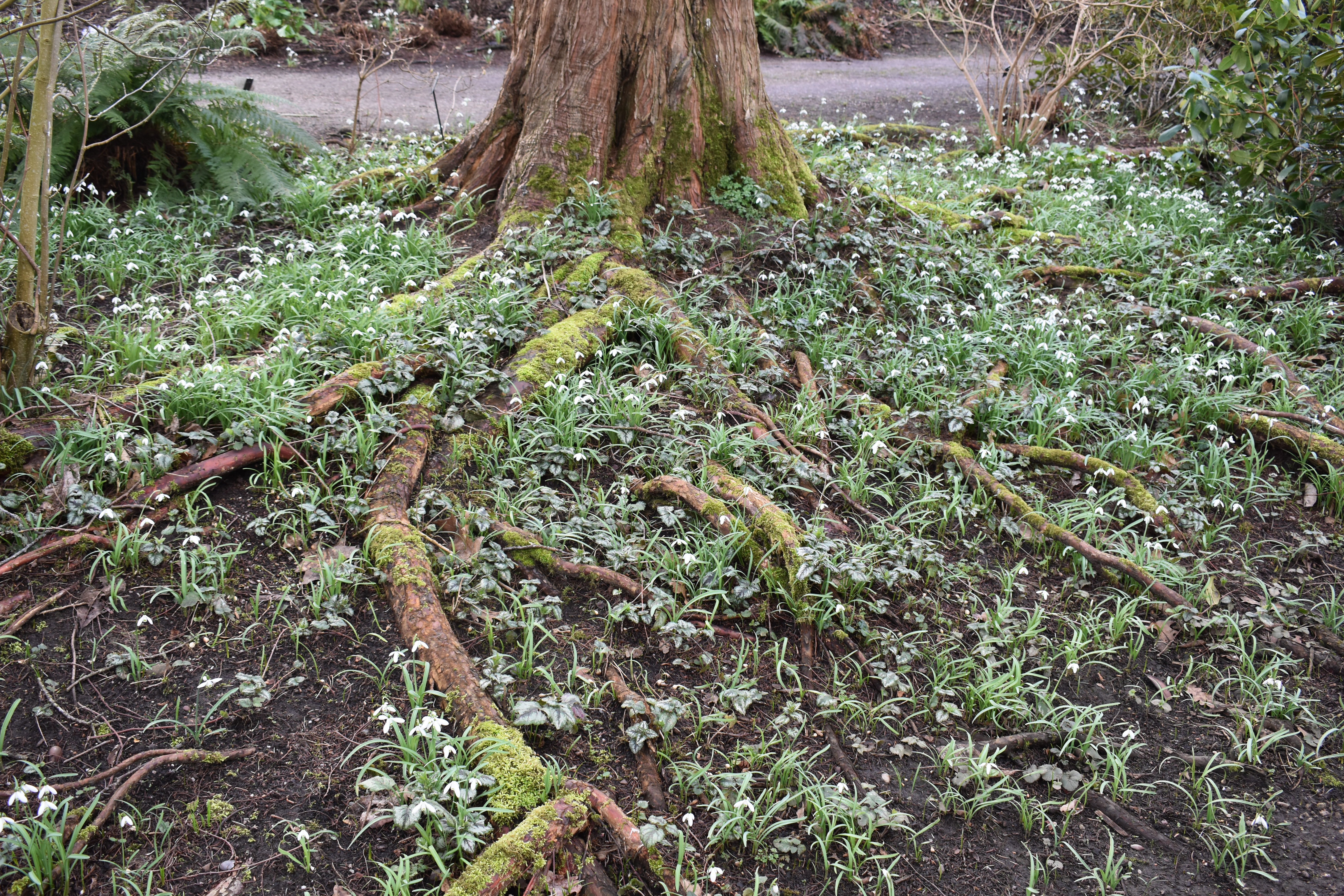 Nearby beneath a tree the ground in between its exposed roots was covered by scillas, white with the palest blue hue.