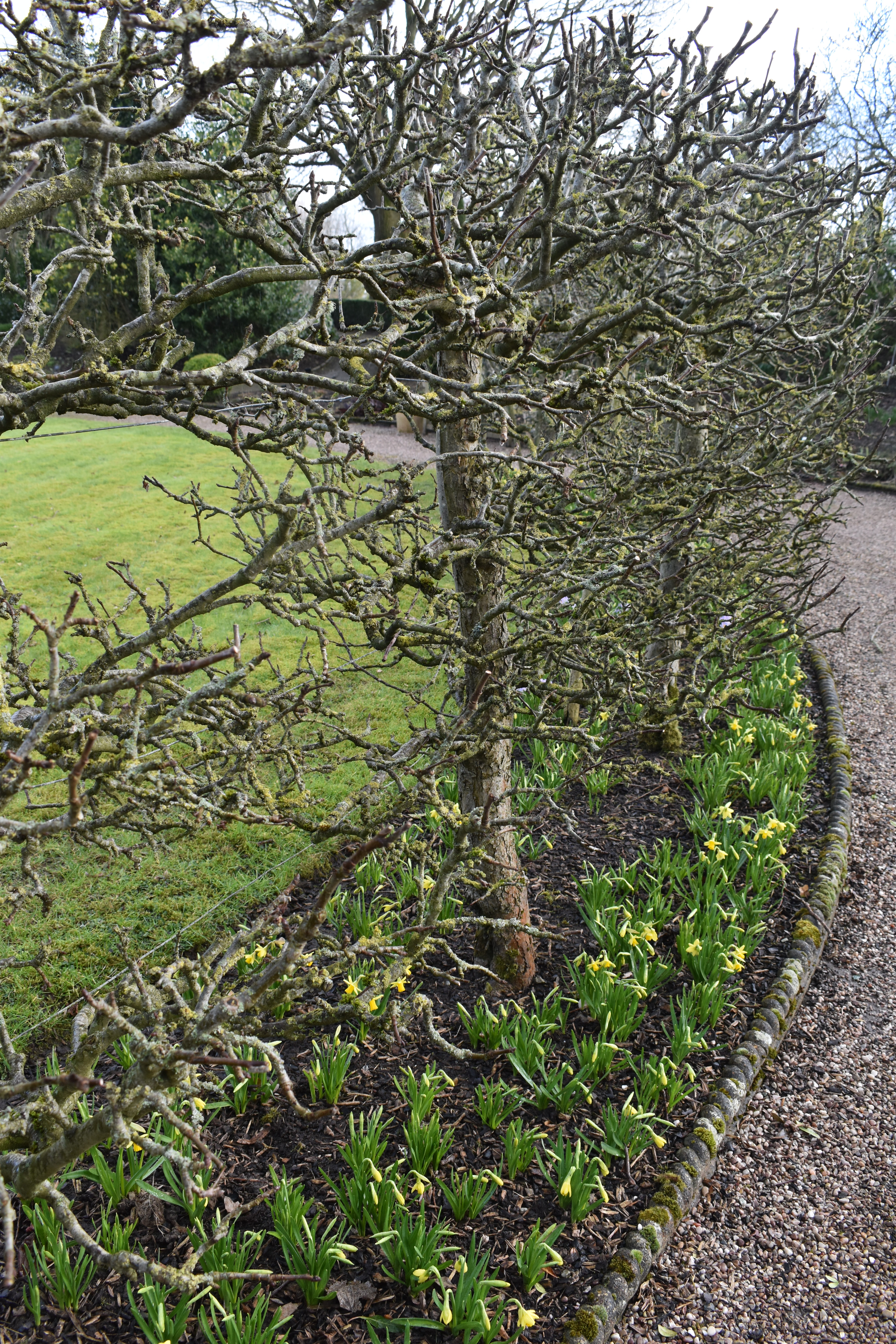 We returned to the circle of lawn beautifully edged by fan-trained apple trees underplanted with spring bulbs such as Narcissus ‘Tete-a-Tete’ and chionodoxa.