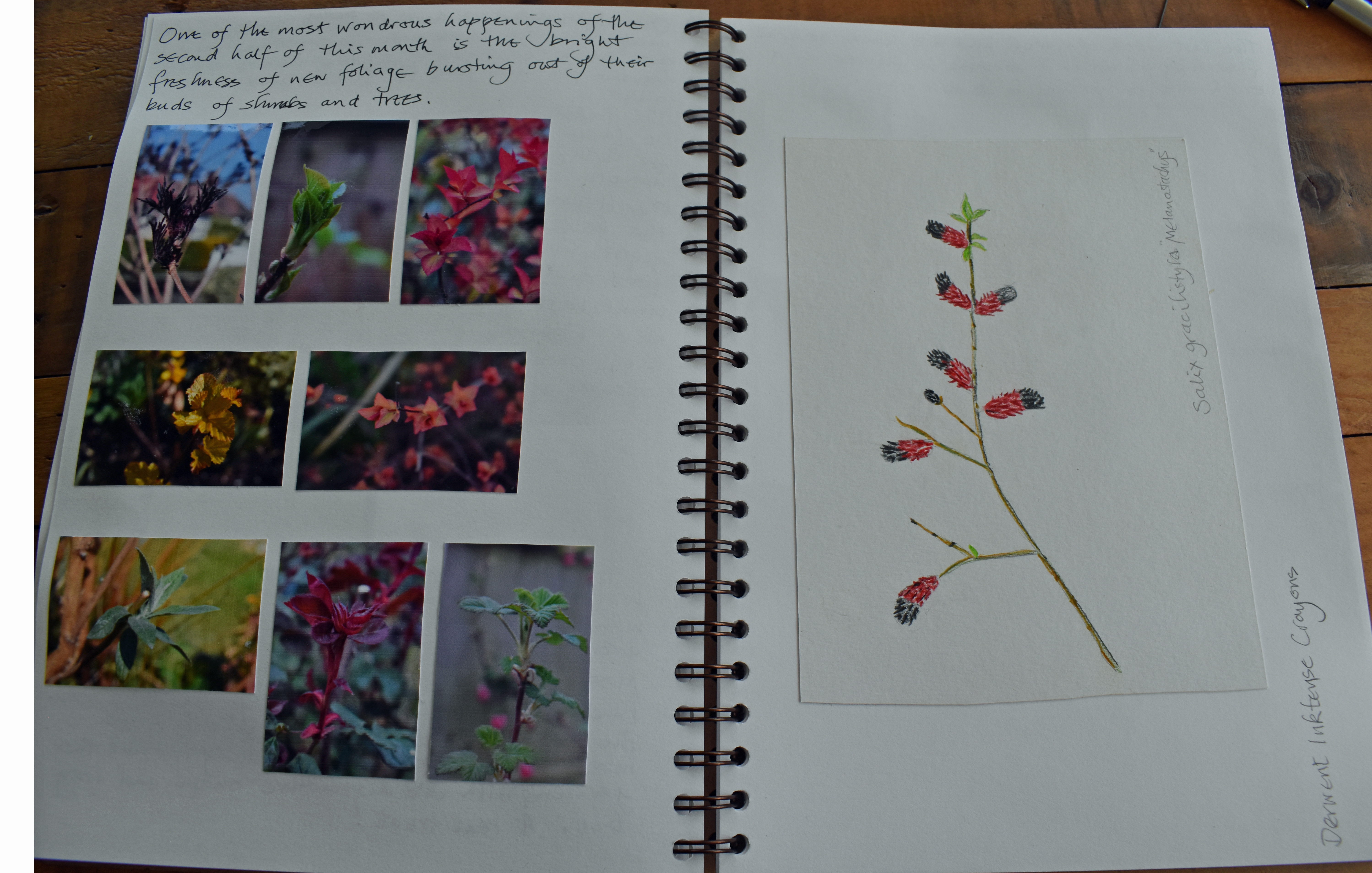 Opposite the photos of freshly burst buds is a sketch I made using Derwent Inktense Crayons, depicting a branch of Salix gracilistyla ‘Melanostachys’. Its catkins are intense black and red.