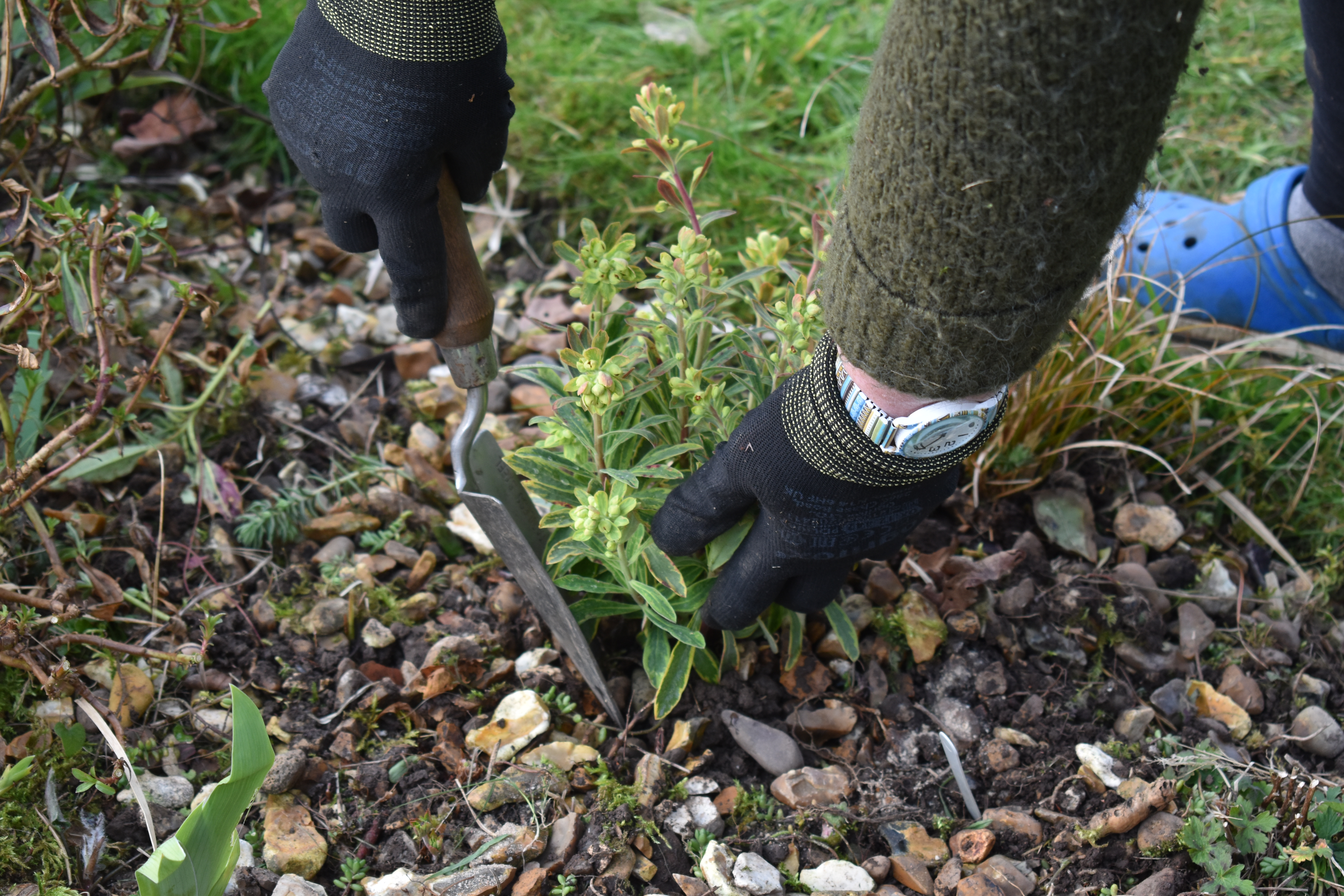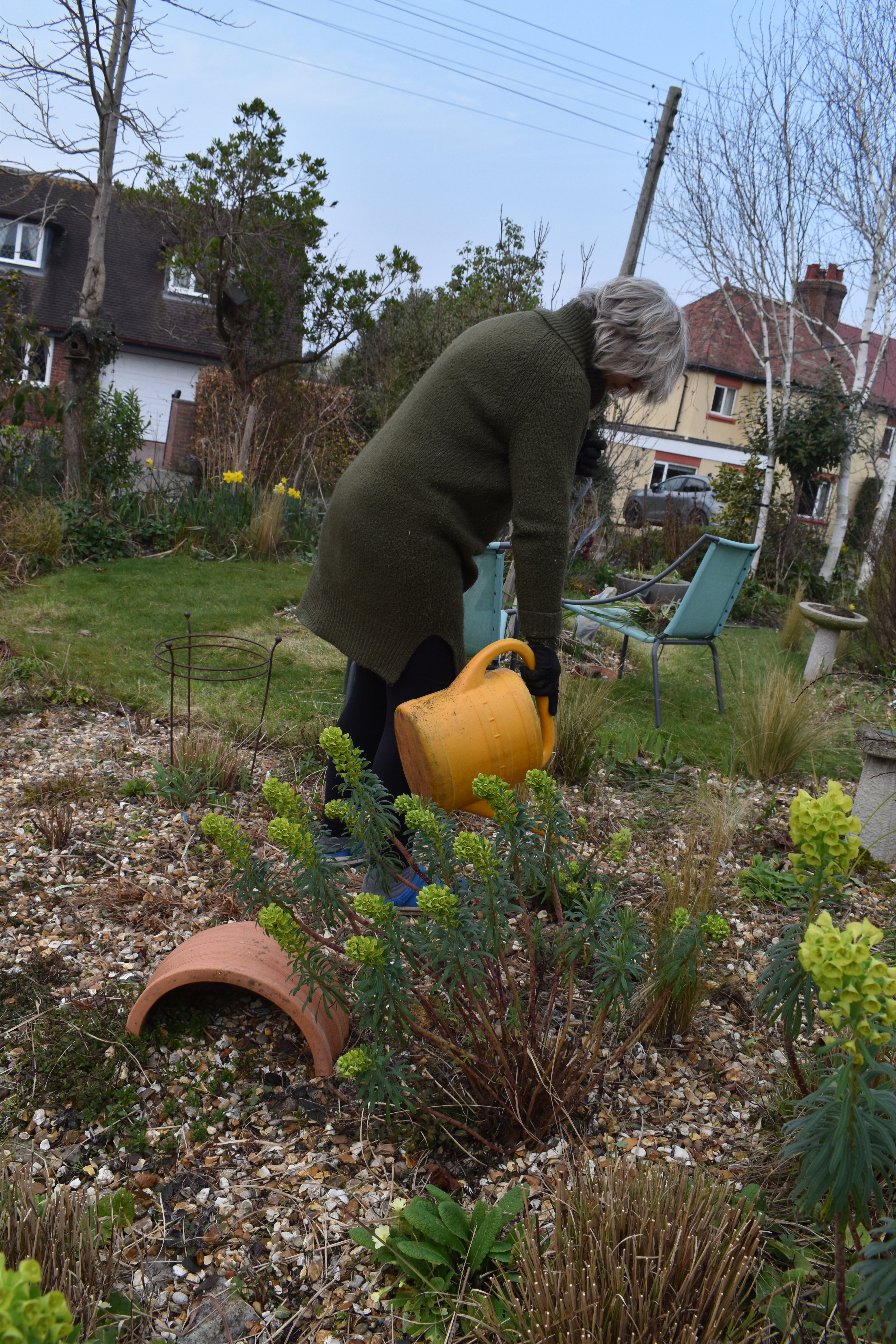 “Watering newly planted euphorbias, picking daffodils for the house and sowing perennial seeds.”