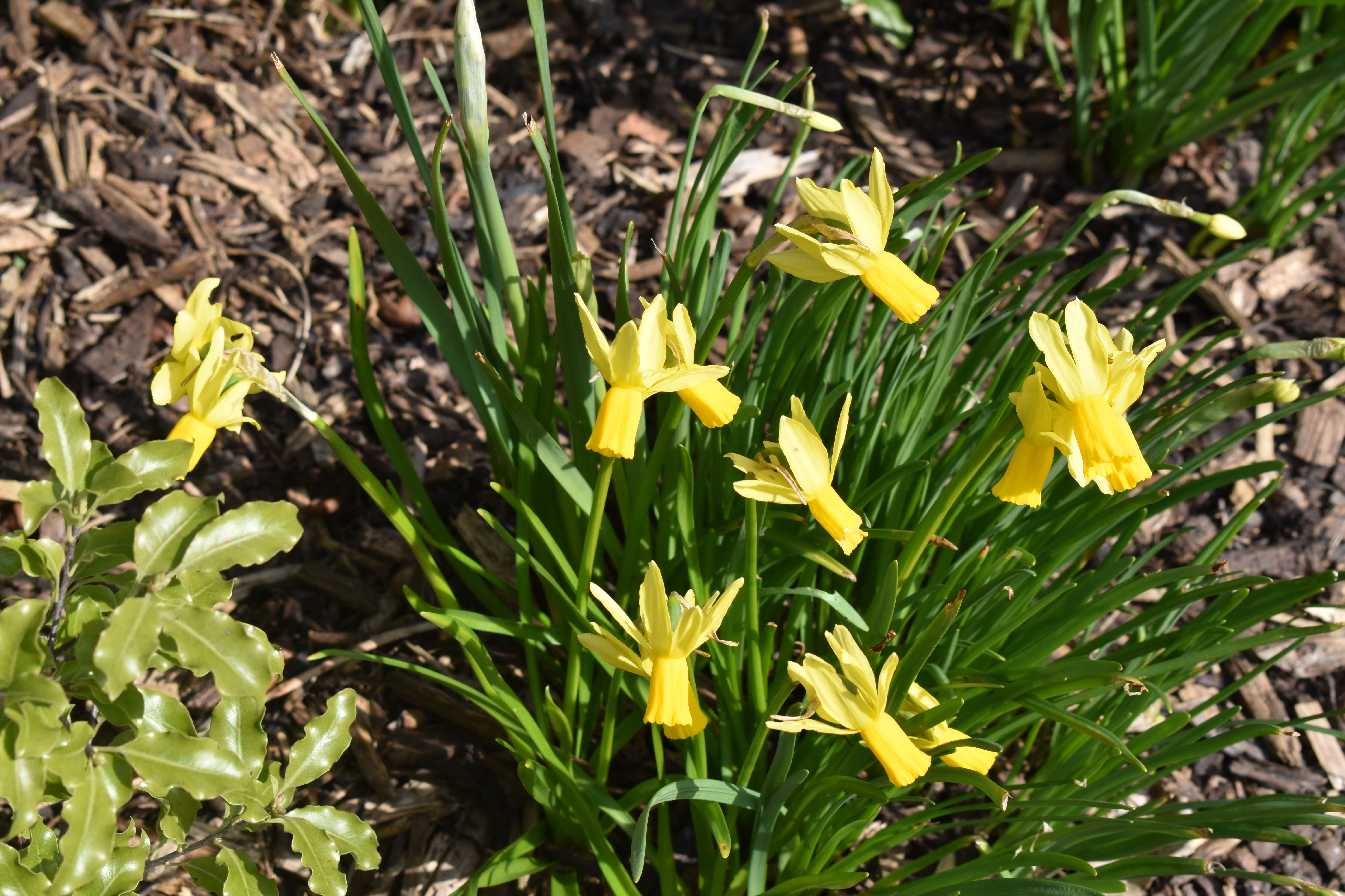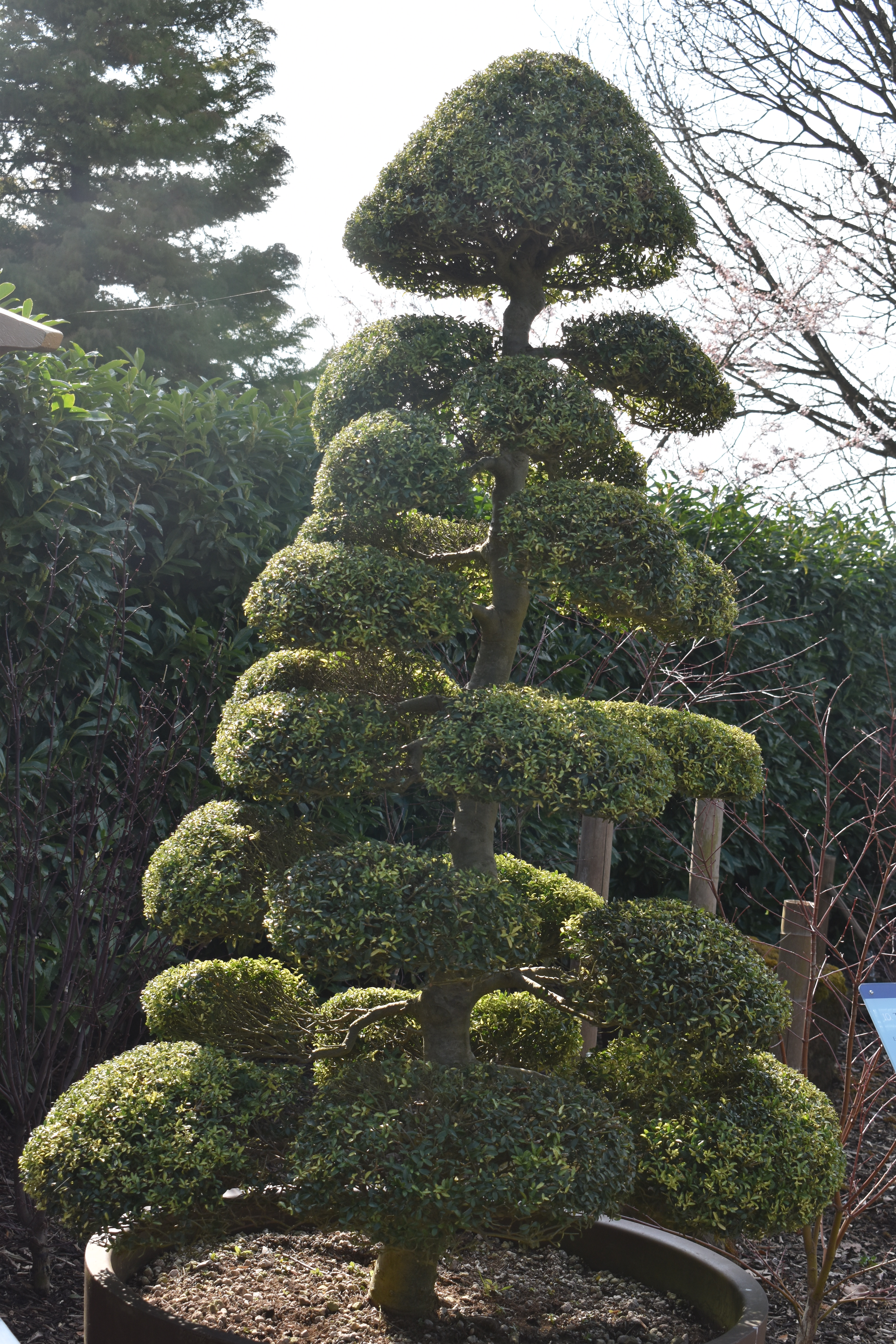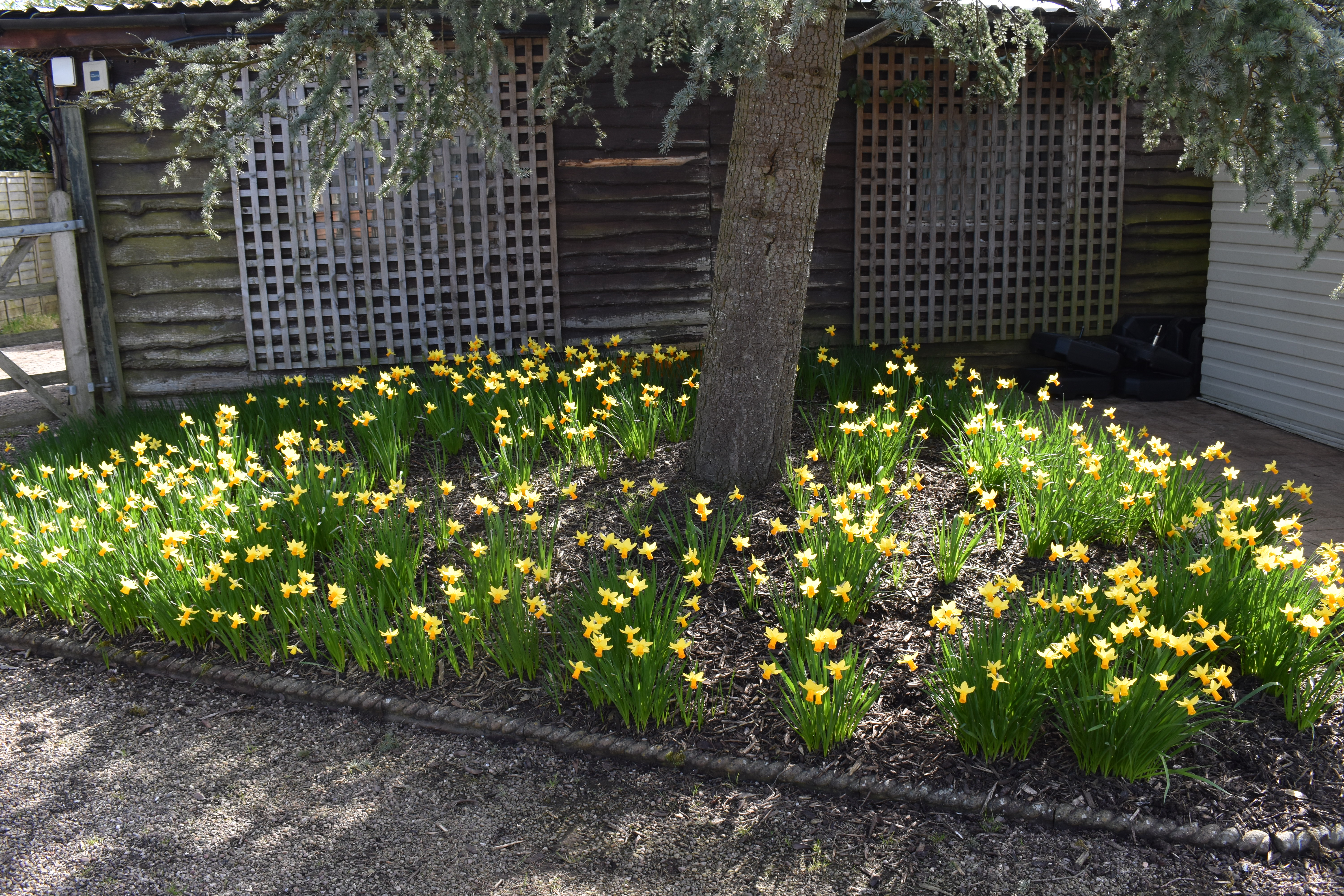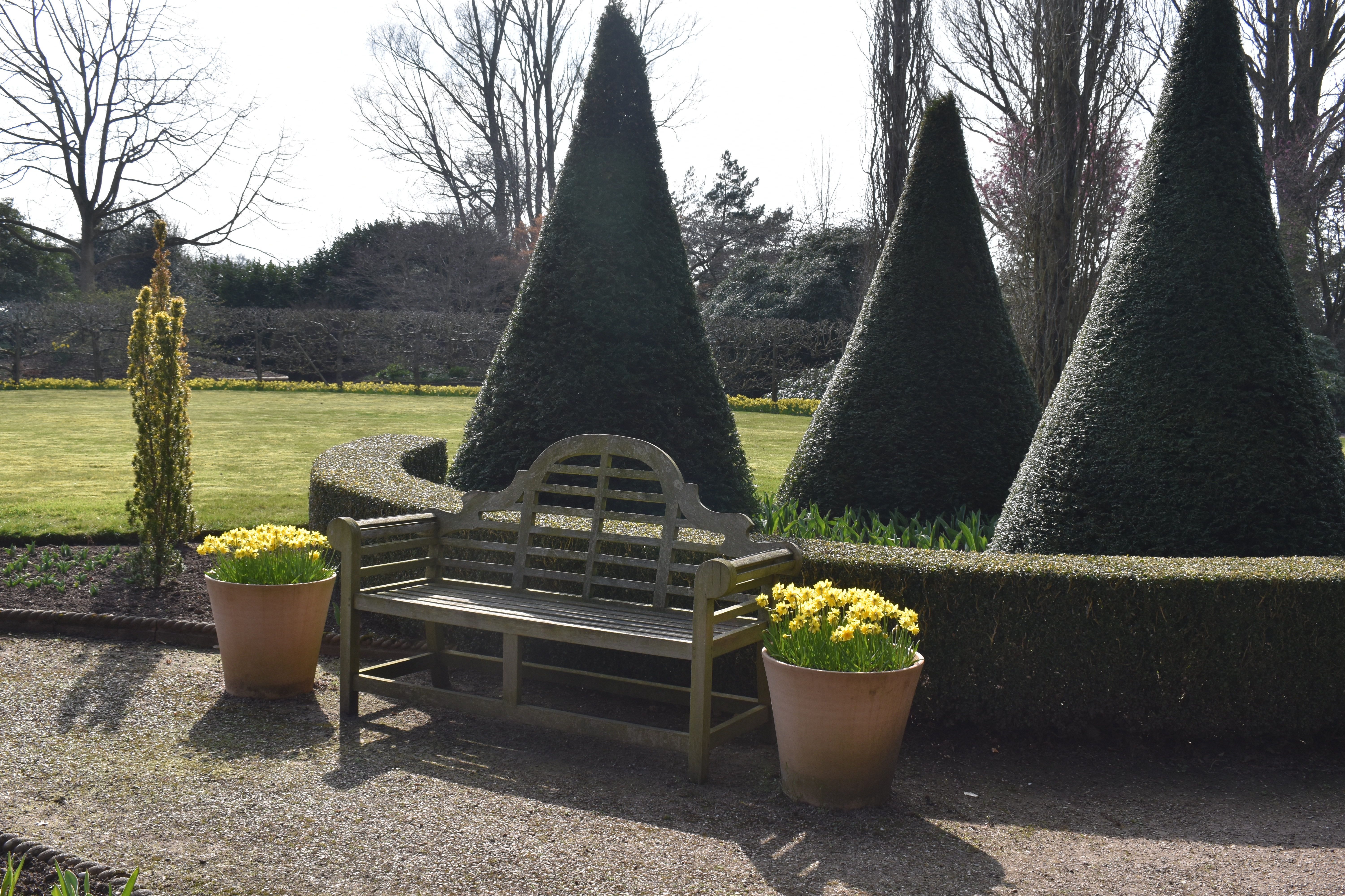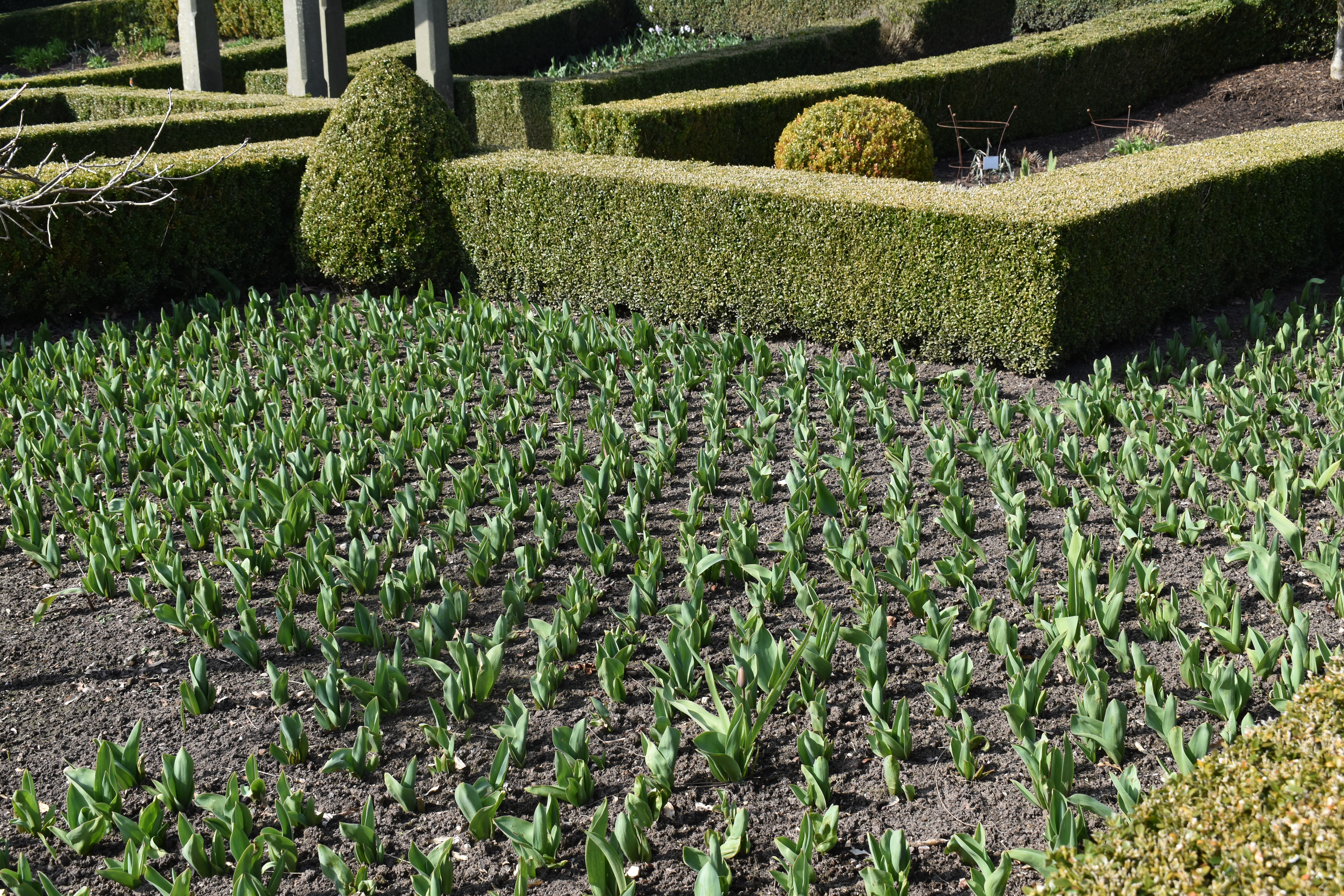 These patches of tulip foliage promise a kaleidoscope of colours on our visit next month. The well-trimmed topiary look good all year.
