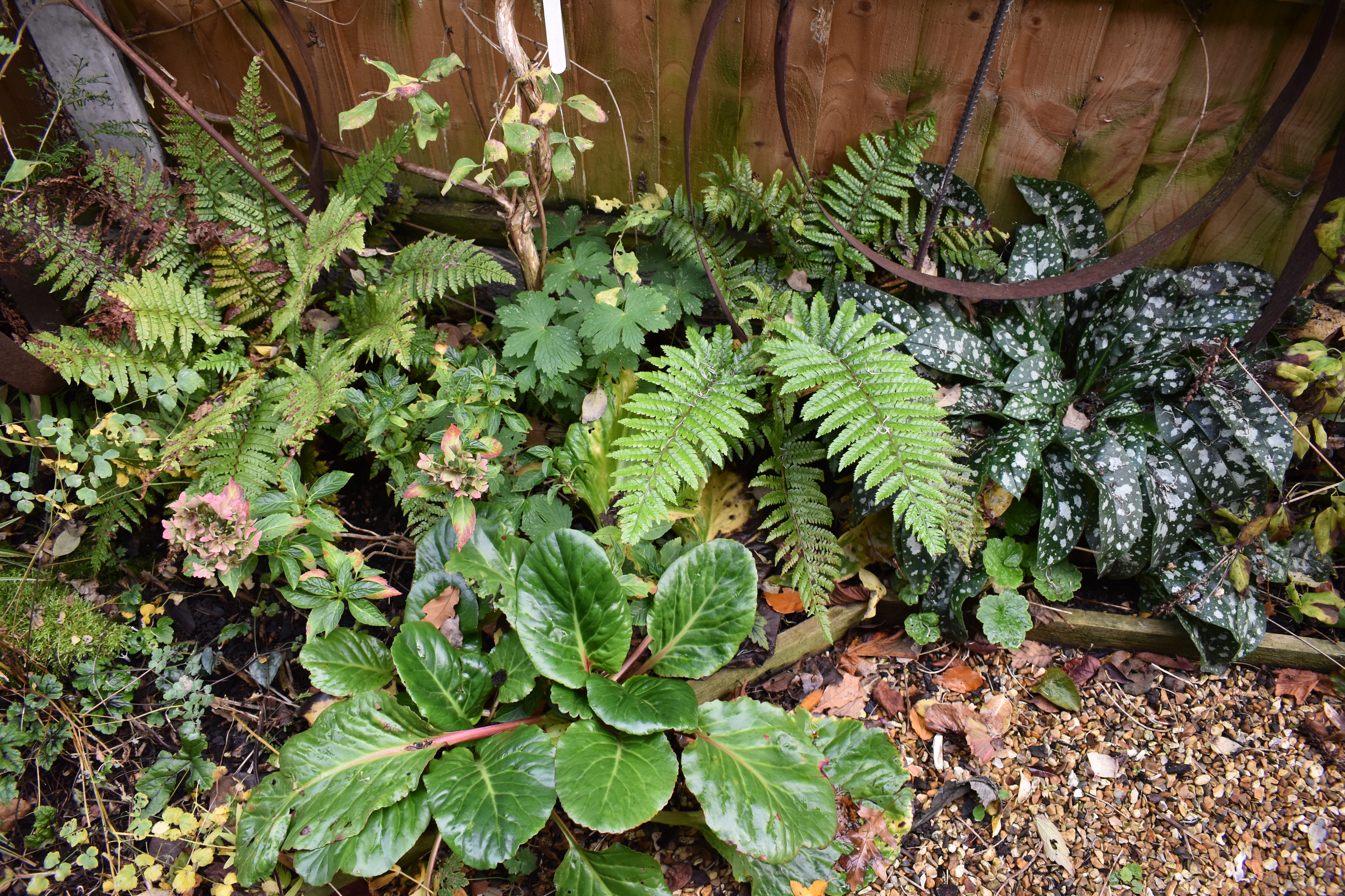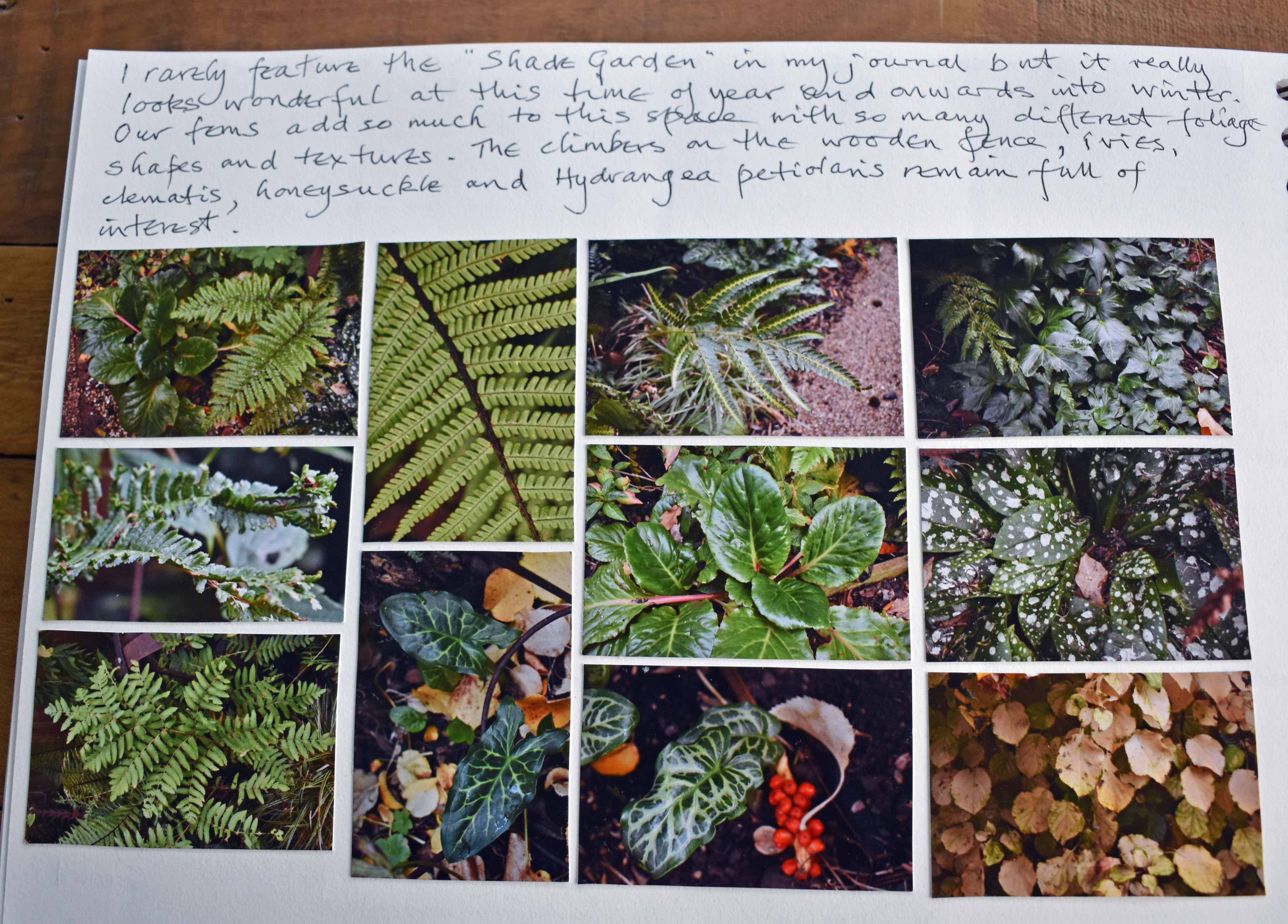 Over onto the next page I looked at the ‘Shade Garden’ and noted that, “I rarely feature the ‘Shade Garden’ in my journal but it really looks wonderful at this time of year and onwards into winter. Our ferns add so much to this space with so many different foliage shapes and textures. The climbers on the wooden fence, ivies, clematis, honeysuckle and Hydrangea petiolaris remain full of interest.’
