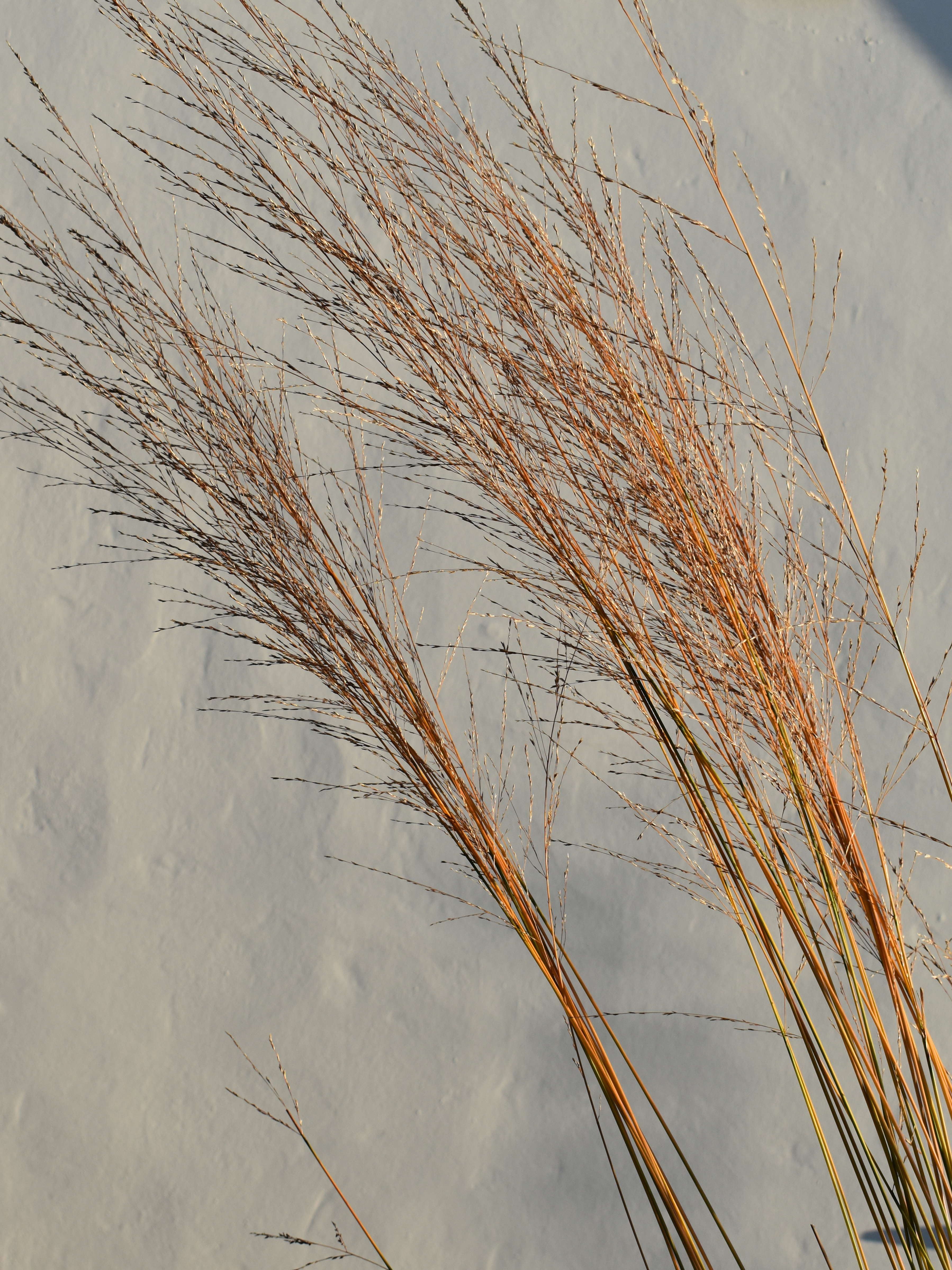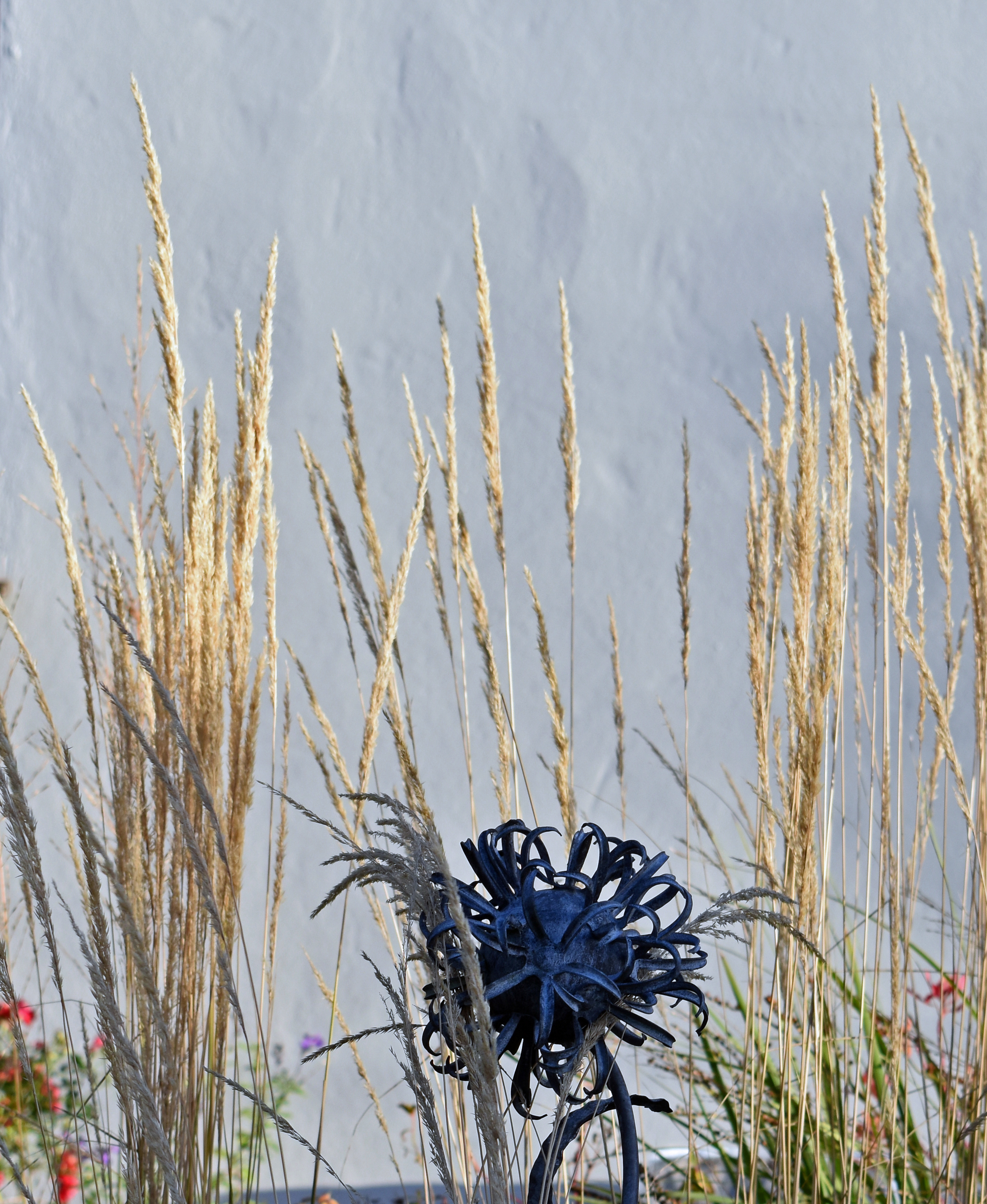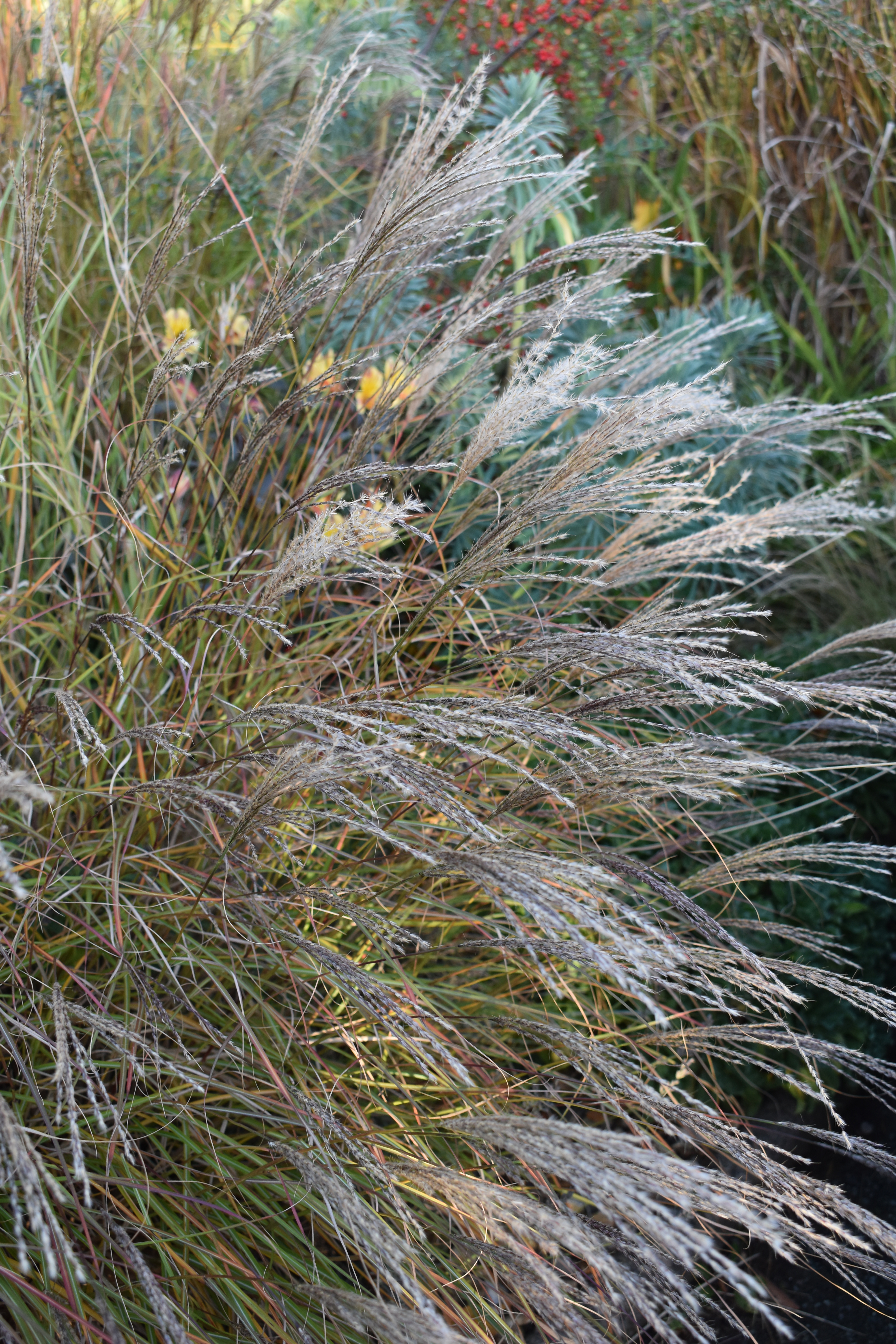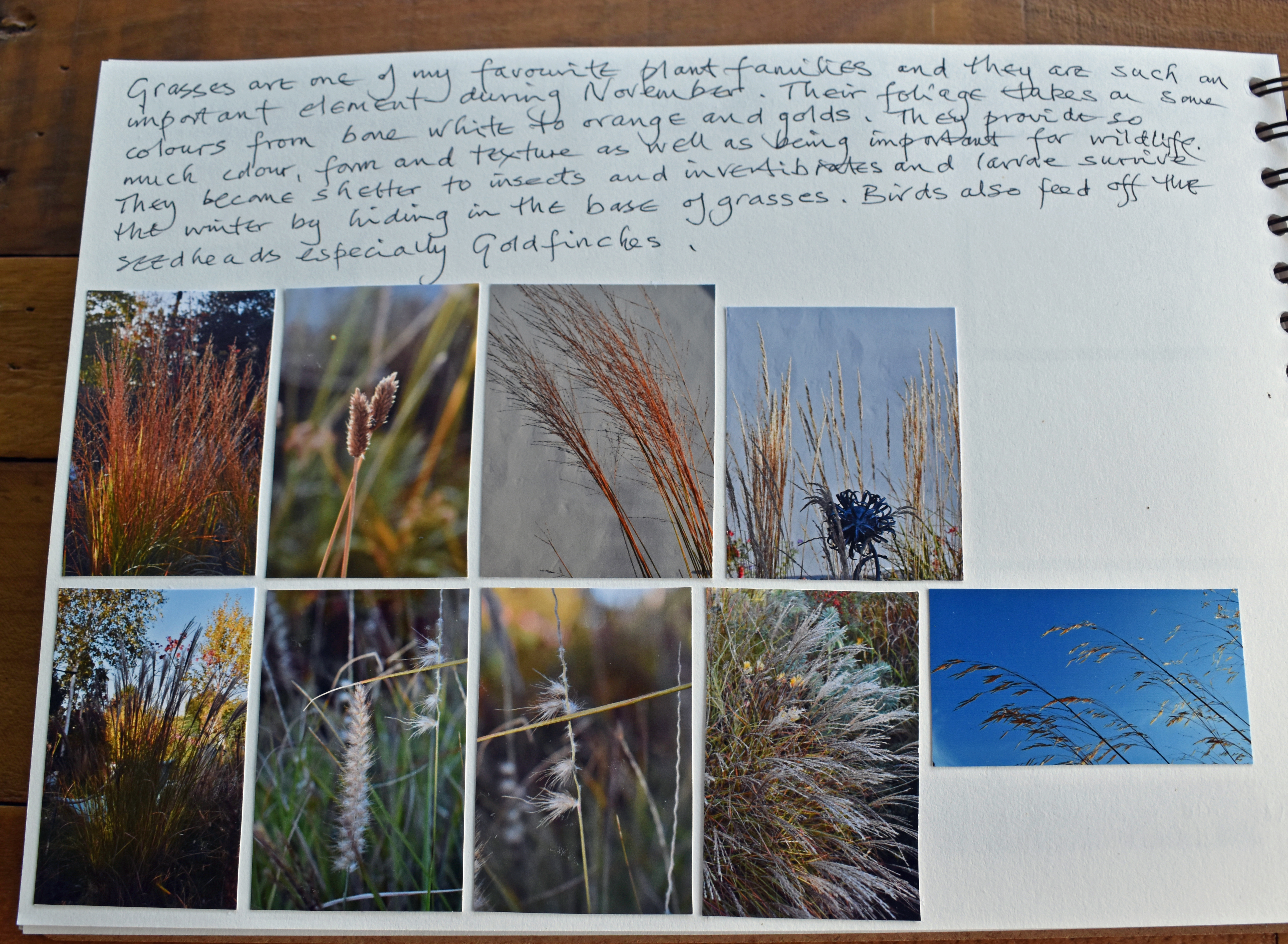 We move on now to look at grasses that we grow. “Grasses are one of my favourite plant families and they are such an important element in our November garden. Their foliage take on gentle colours from bone white to oranges and golds. They provide so much colour, form and texture as well as being important to wildlife. They become shelter for insects and invertebrates. Larvae survive the winter by hiding in the base of grasses. Birds also feed off the seed heads in particular goldfinches.”