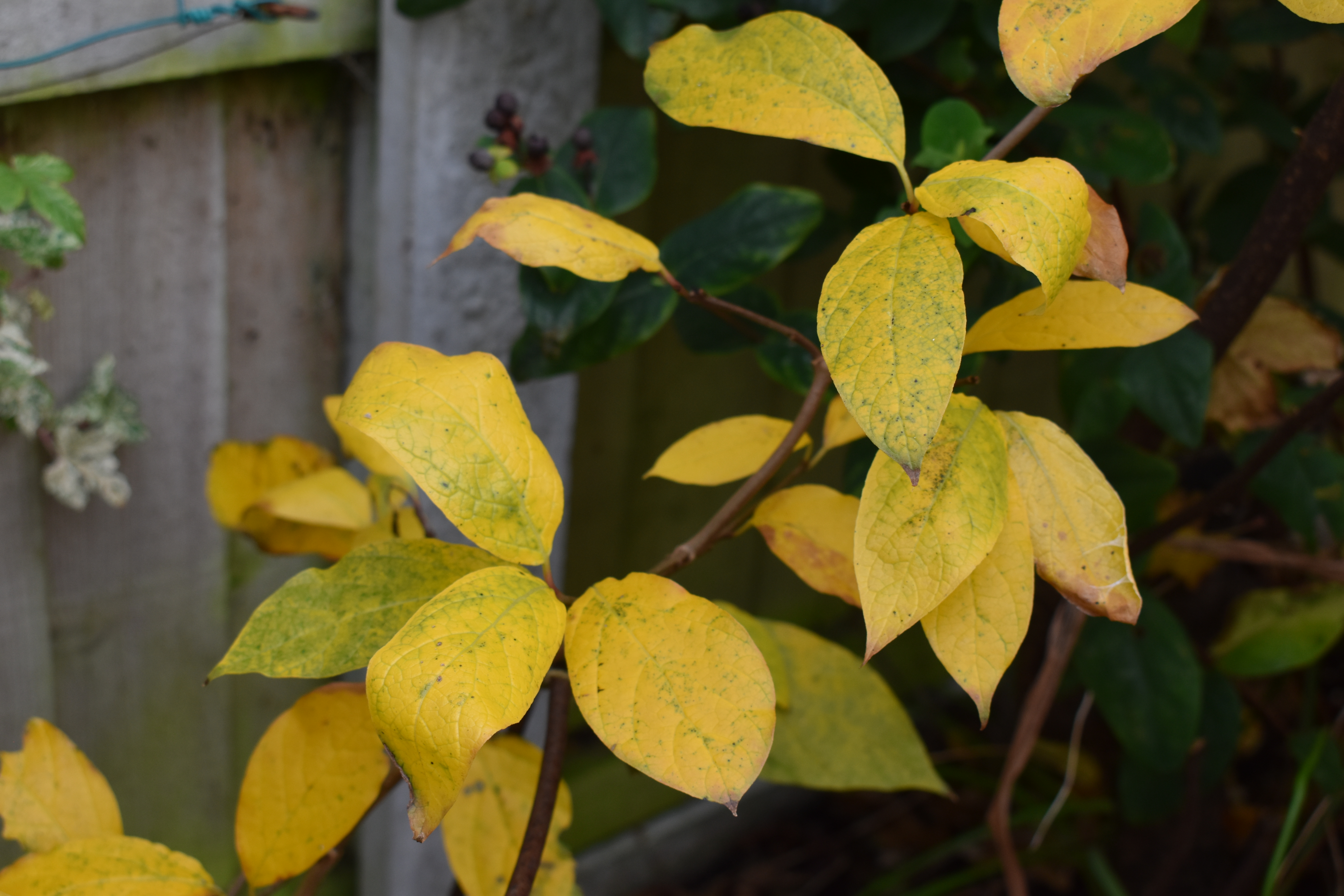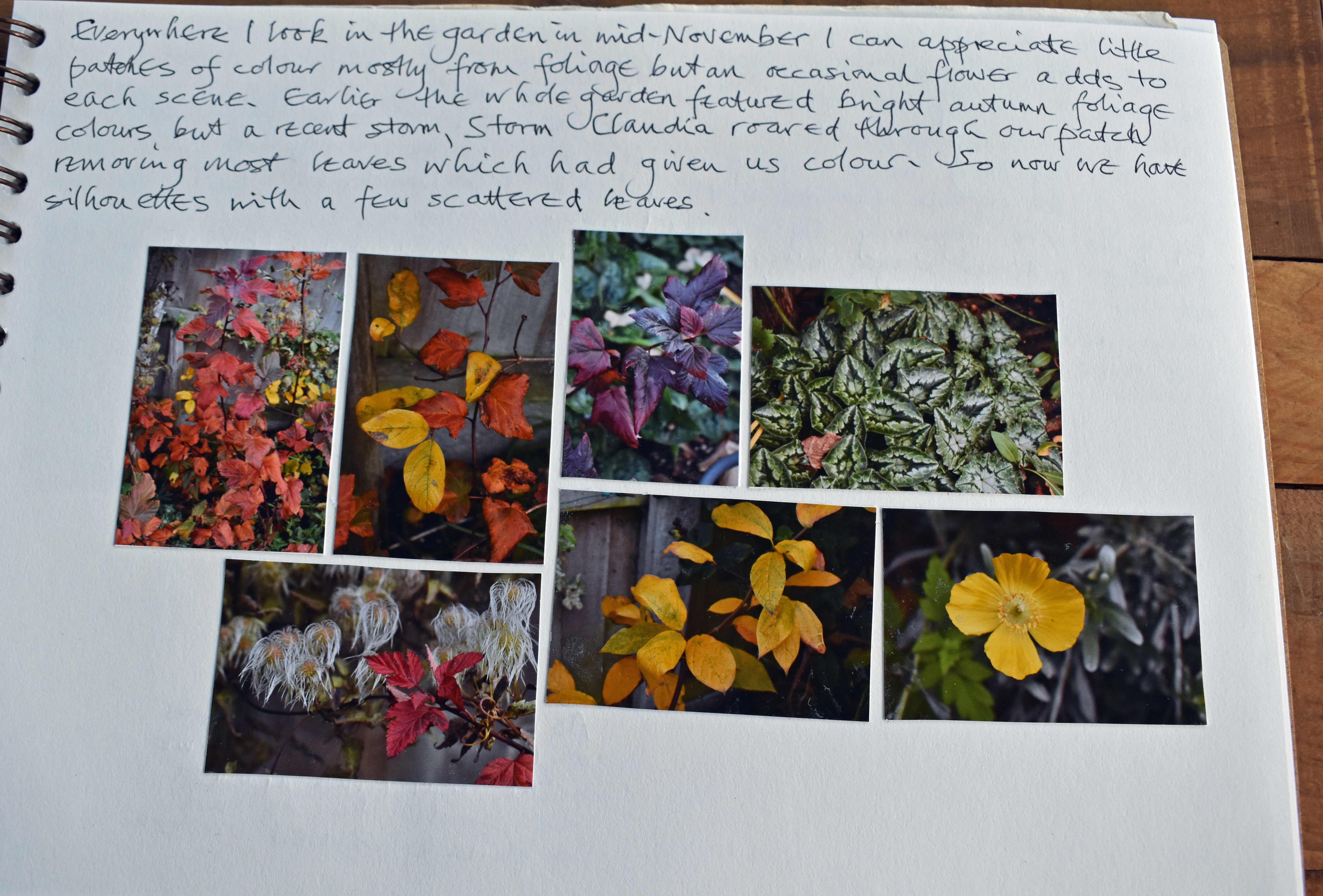 In the autumn every patch of colour becomes important, so on the next page I wrote, “Everywhere I look in the garden in mid-November I can appreciate little patches of colour mostly from foliage but an occasional flower adds to each scene. Earlier the whole garden featured bright autumn foliage colours, but a recent storm, Storm Claudia roared through our patch removing most leaves which had given us colour. So now we have tree silhouettes with a few scattered leaves.”
