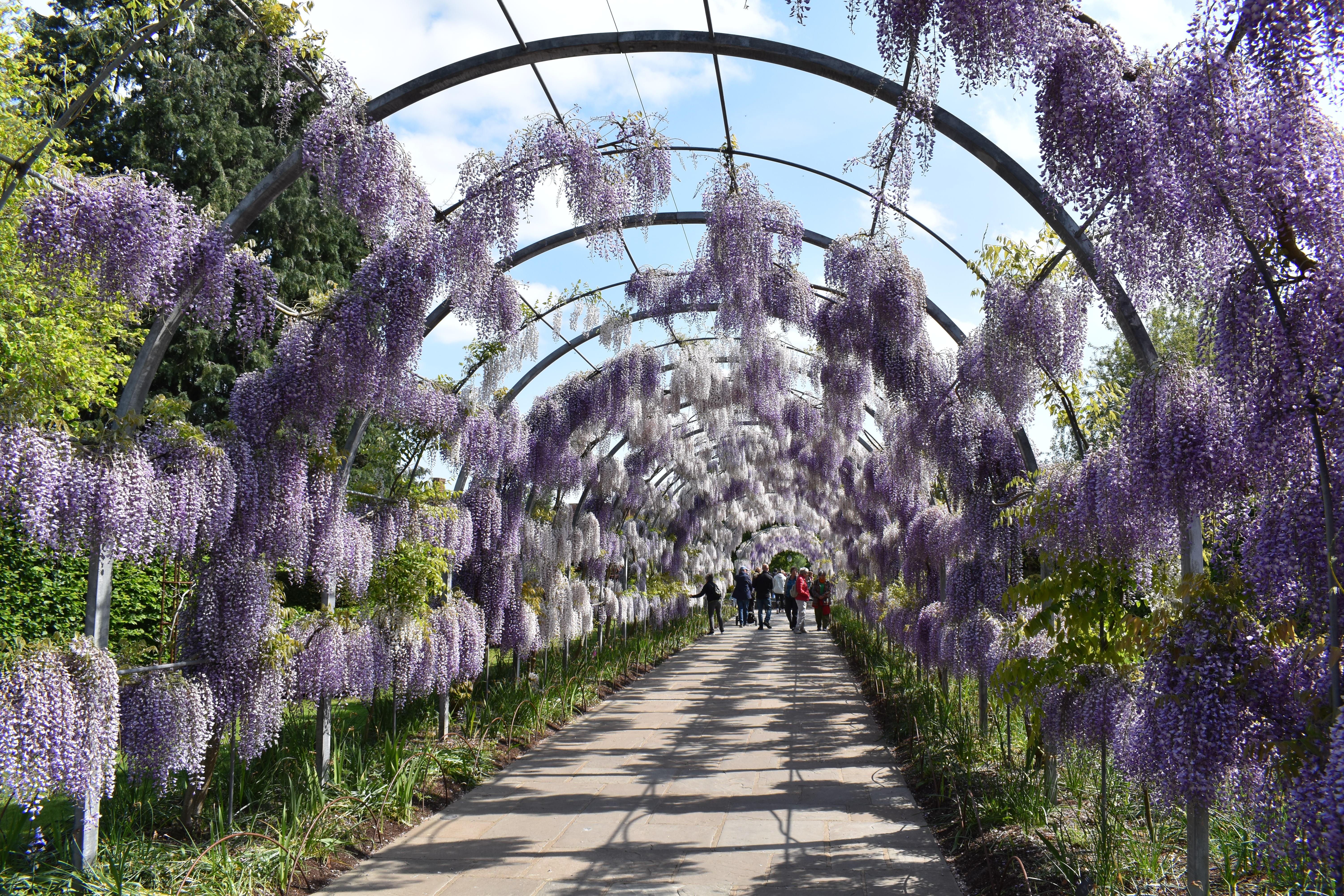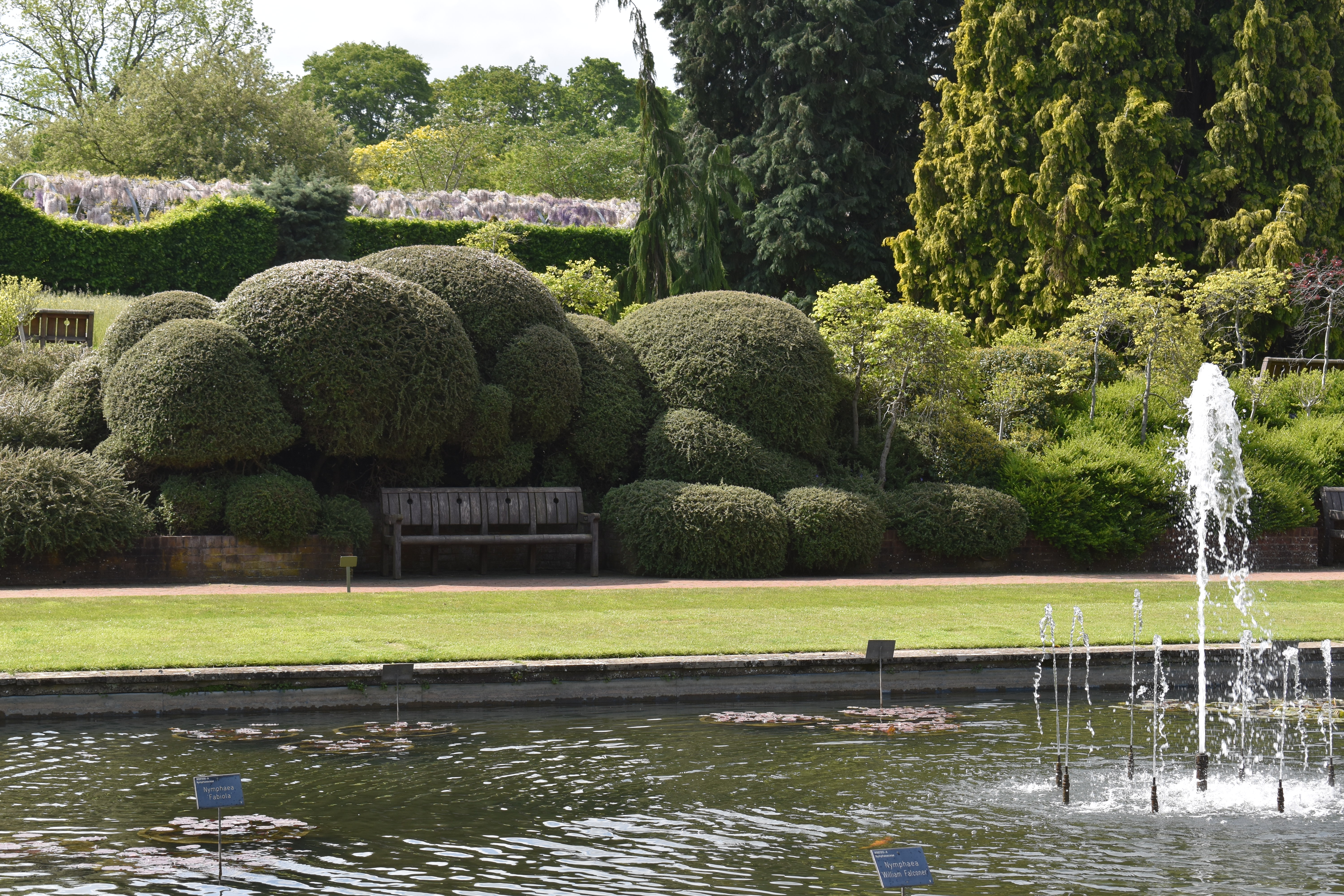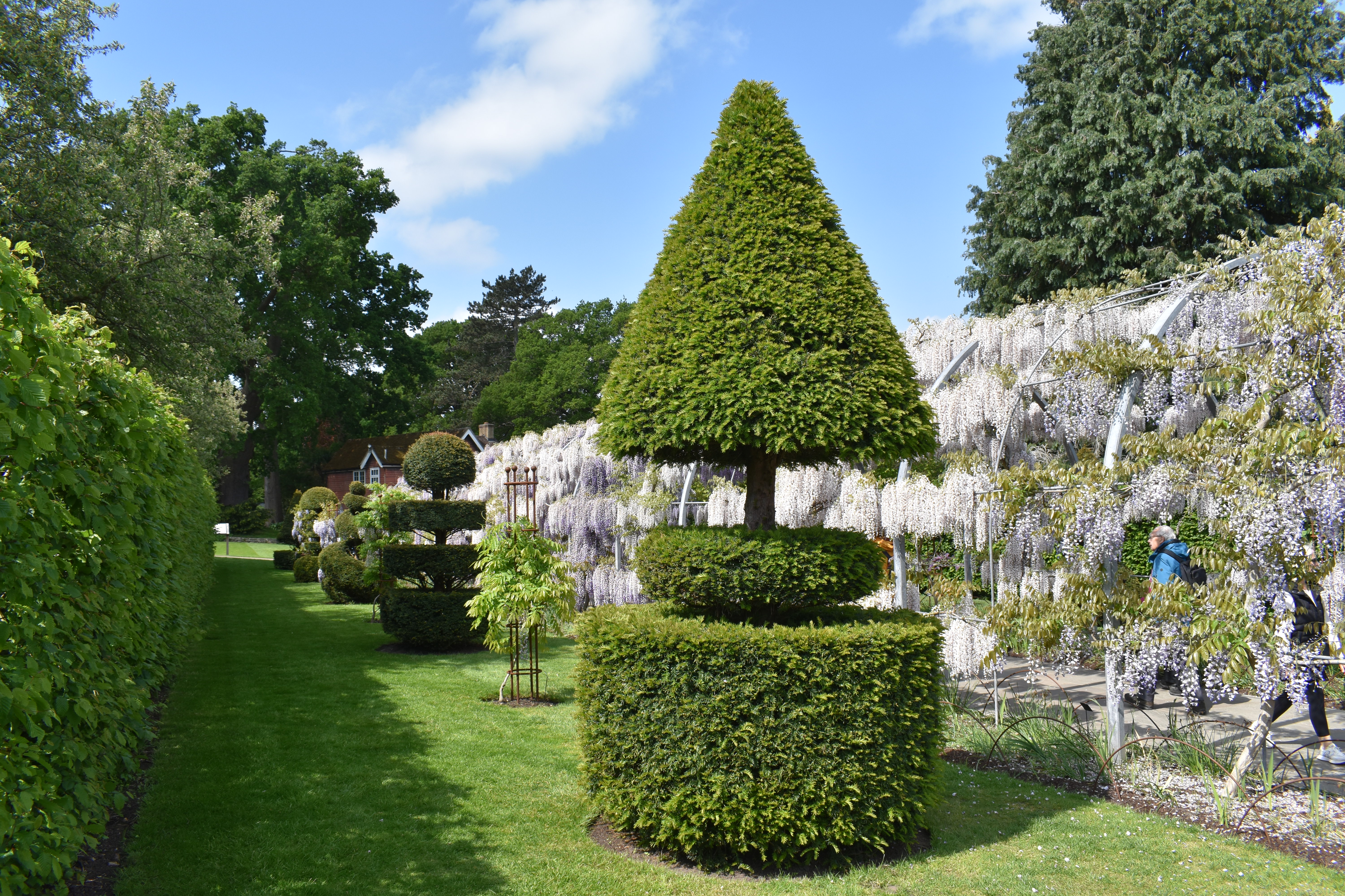 Neither of us are great fans of wisteria but the way Wisley had grown a selection up and over this long pergola was so impressive, in fact impressing almost every visitor passing by. Topiary pieces looked good alongside the arch too. But before arriving at the wisteria feature we encountered an impressive collection of low growing foliage plants including an especially impressive selction of ferns.
