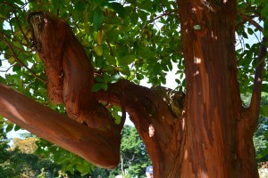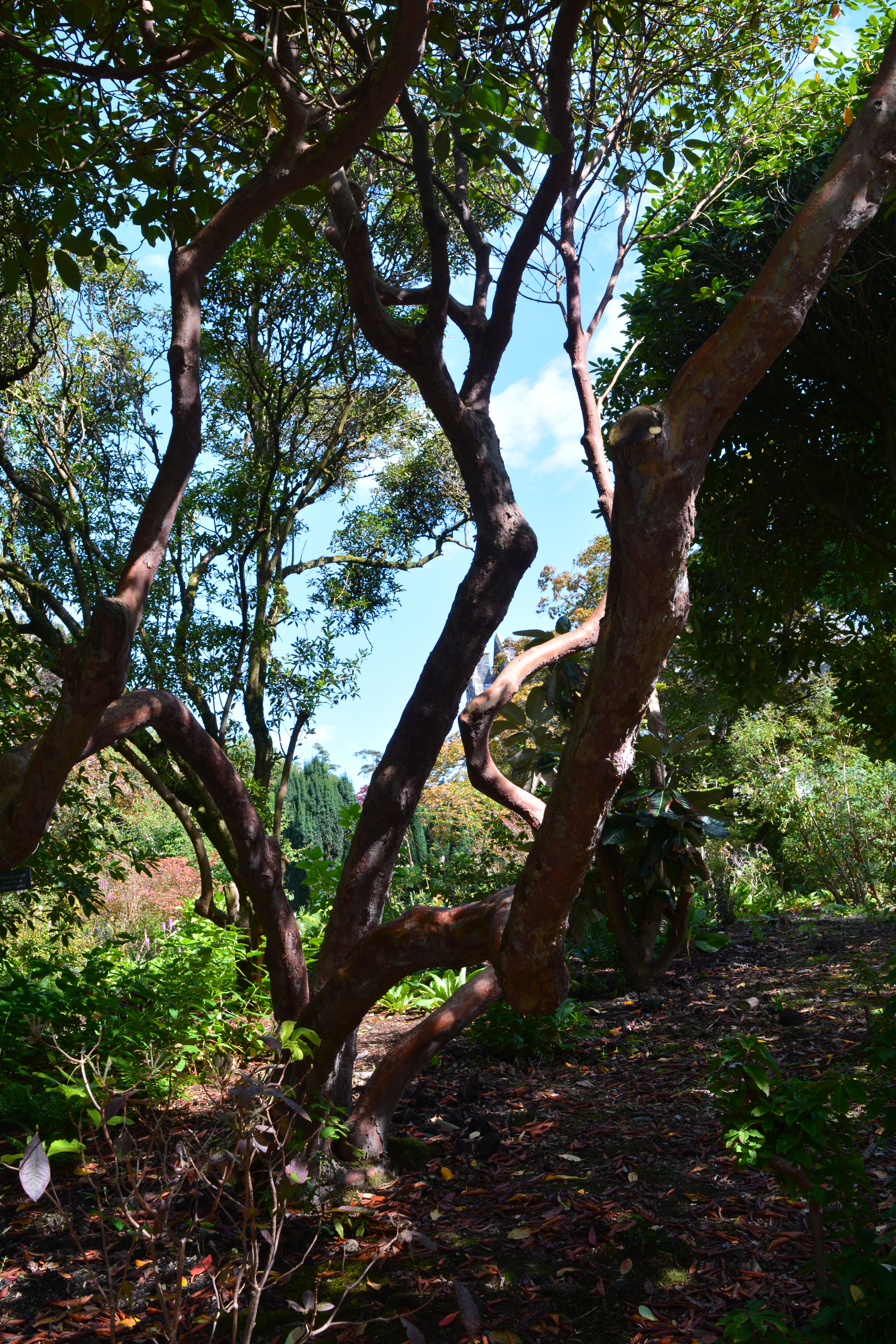 “Clerodendron trichitoma fargesii, grown for its eccentric flowers and berries. Luma apiculata grown for variegated foliage, coloured stems and white scented flowers.”