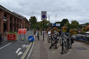 We entered the riverside Victoria Quay passing a plethora of ugly signs and followed the quay with its rather gaudy hanging baskets and planters on the riverside fence. It is from the quay that The Sabrina, a pleasure boat, gives trips down the river for tourists and locals alike. On the left are fashionably popular eateries, including one of our favourites, The Armoury. A very popular riverside public house, The Boathouse sits on the opposite bank just before the first bridge that we pass.
