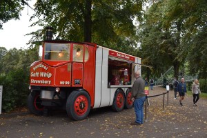 We were surprised to see that the children’s playpark had been updated along a Charles Darwin theme, as Shrewsbury is the town of his birth. Along side the park was a new outdoor cafe with seats overlooking the Severn, so obviously we were tempted by takeaway coffees and cookies. Shrewsbury is famous as the home not just of Darwin but also Sentinel steam lorries and here we found one serving snacks and drinks to walkers passing by. We walked further along the bank-side path enjoying views through the bankside trees and hedges. Some of the willows have been sculpted by pollarding by previous generations who trained them in this way to get long straight whips of willow for basketry, a very important craft at the time.