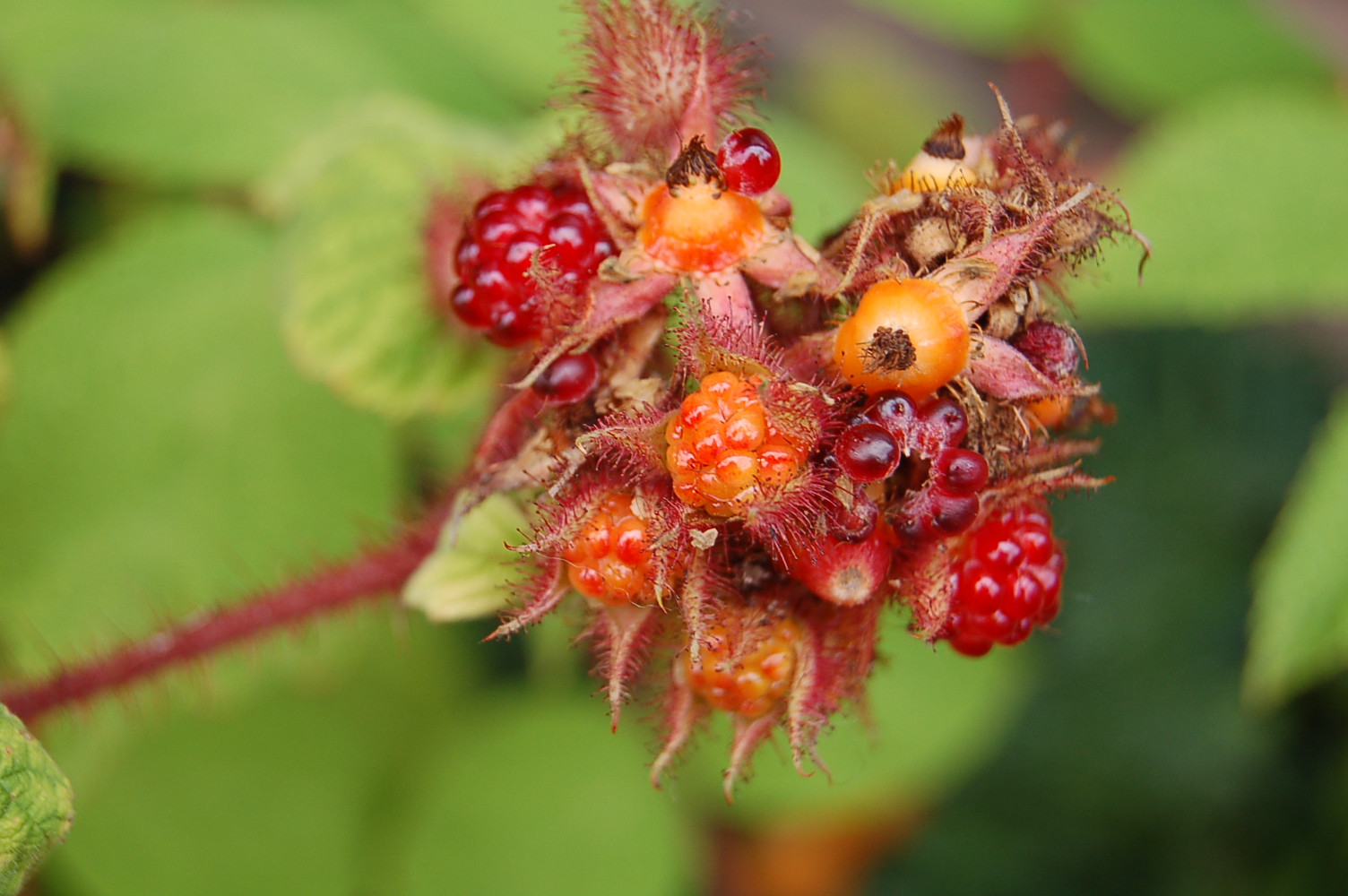 We recently visited the permaculture garden of Wade Muggleton and his family in South Shropshire and what a wonderful garden it is, full of interest, attractive and so productive. Every inch of space is used and productive on several layers – tree, shrub and ground. The front garden is home to fruit from strawberries at ground level, through gooseberries, including a deep red fruited bush with intense sweet taste, and on up through cordon apples and finally up to apples grown on trees. The star of the front garden though was the Japanese Wineberry with its bright orange and red colouring and textured stems – and they had a sweet, rich taste.