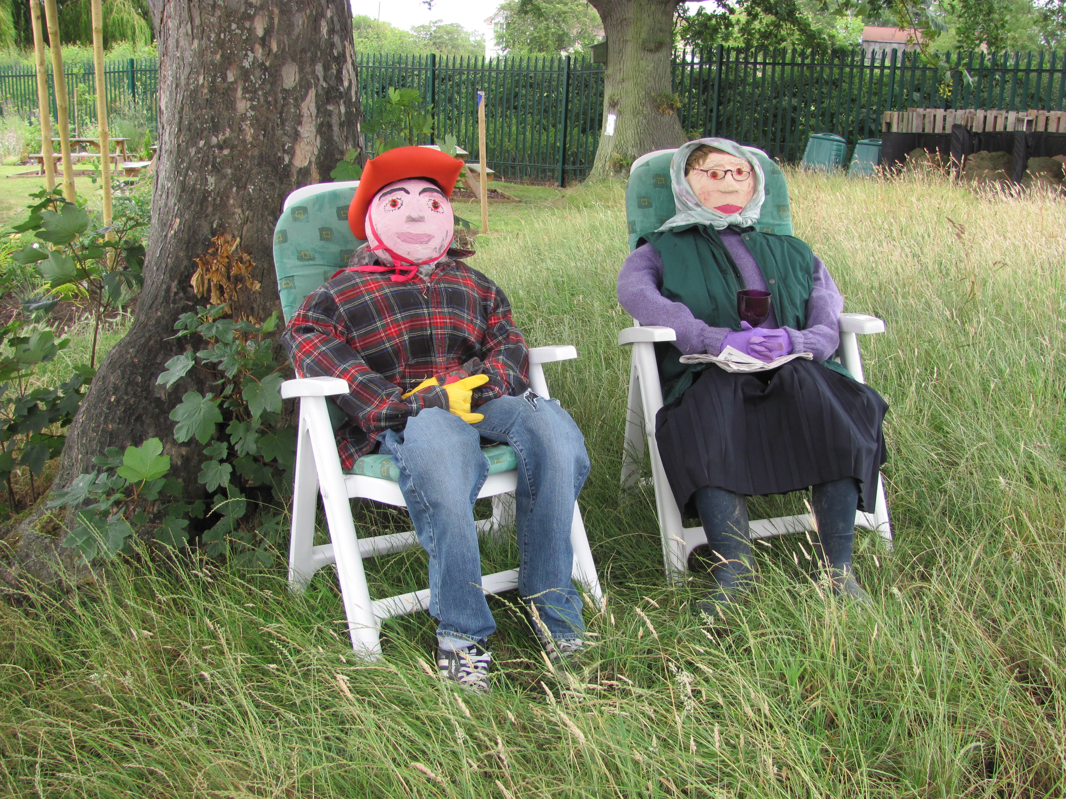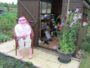 We have a real champion creator of scarecrows at our lottie site, Bowbrook Allotment Community. Every year Mrs Anna as she calls herself, crafts splendid characters for us to enjoy. Last year we had a scarecrow version of Shrek but this year she produced three wonderful characters based on her family apparently. The old couple who doze in the shade under our sycamore tree are based on her parents while the pink beauty is herself 10 years from now. Incredible!