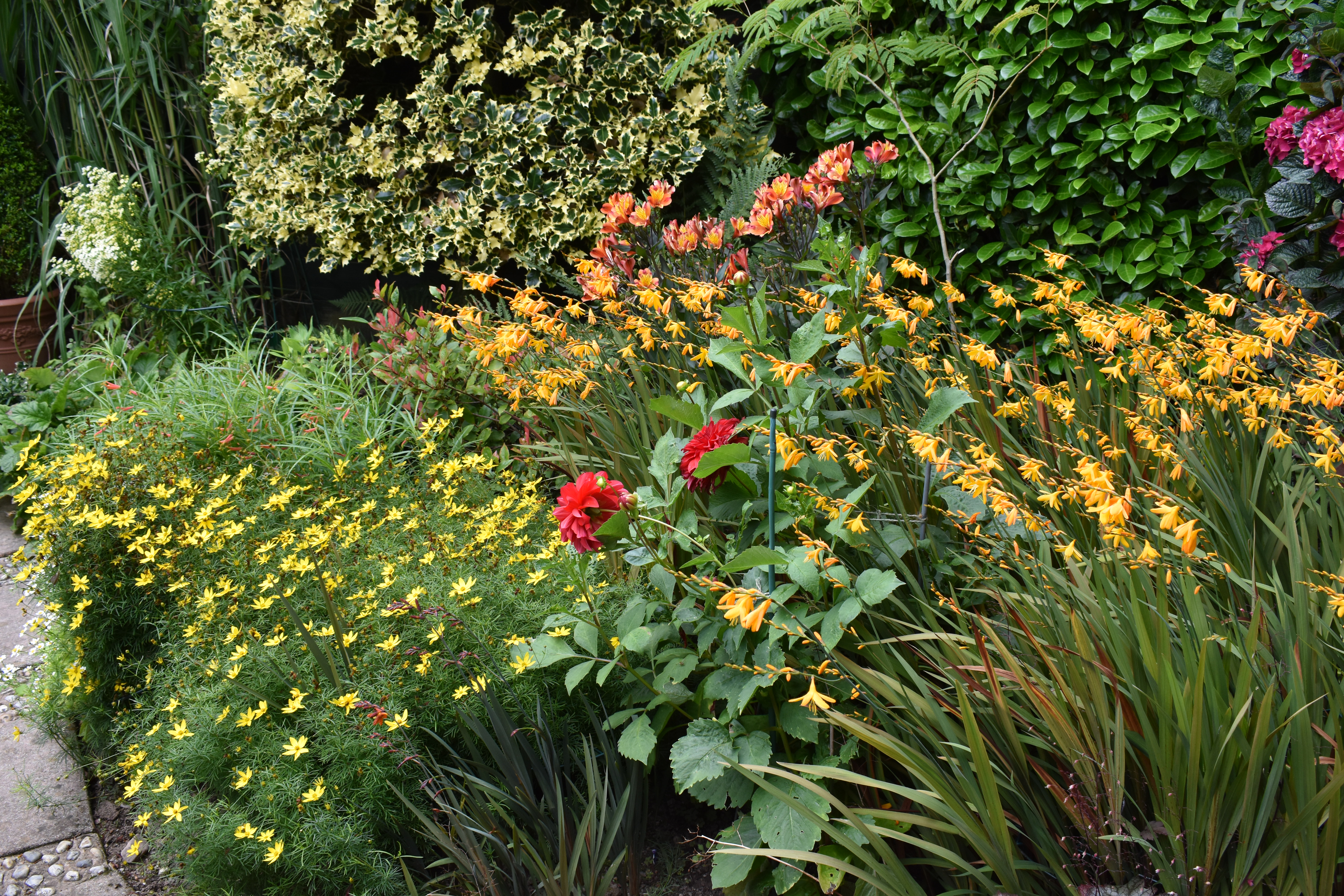 An NGS sign pointed us through a gateway, where a path took us through the side garden where a wooden gate opened up to reveal the back garden, where glimpses of yellow, orange and red invited us to explore further.