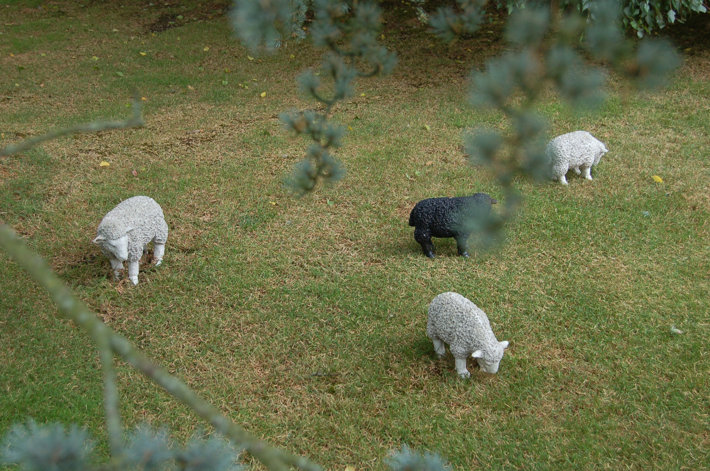 As we wandered down the drive to his bungalow we stopped to admire this imaginatively clipped hedge like billowing clouds. Opposite this was a lawned area with a small collection of interesting trees and some crazy sheep sculptures grazing the grass.