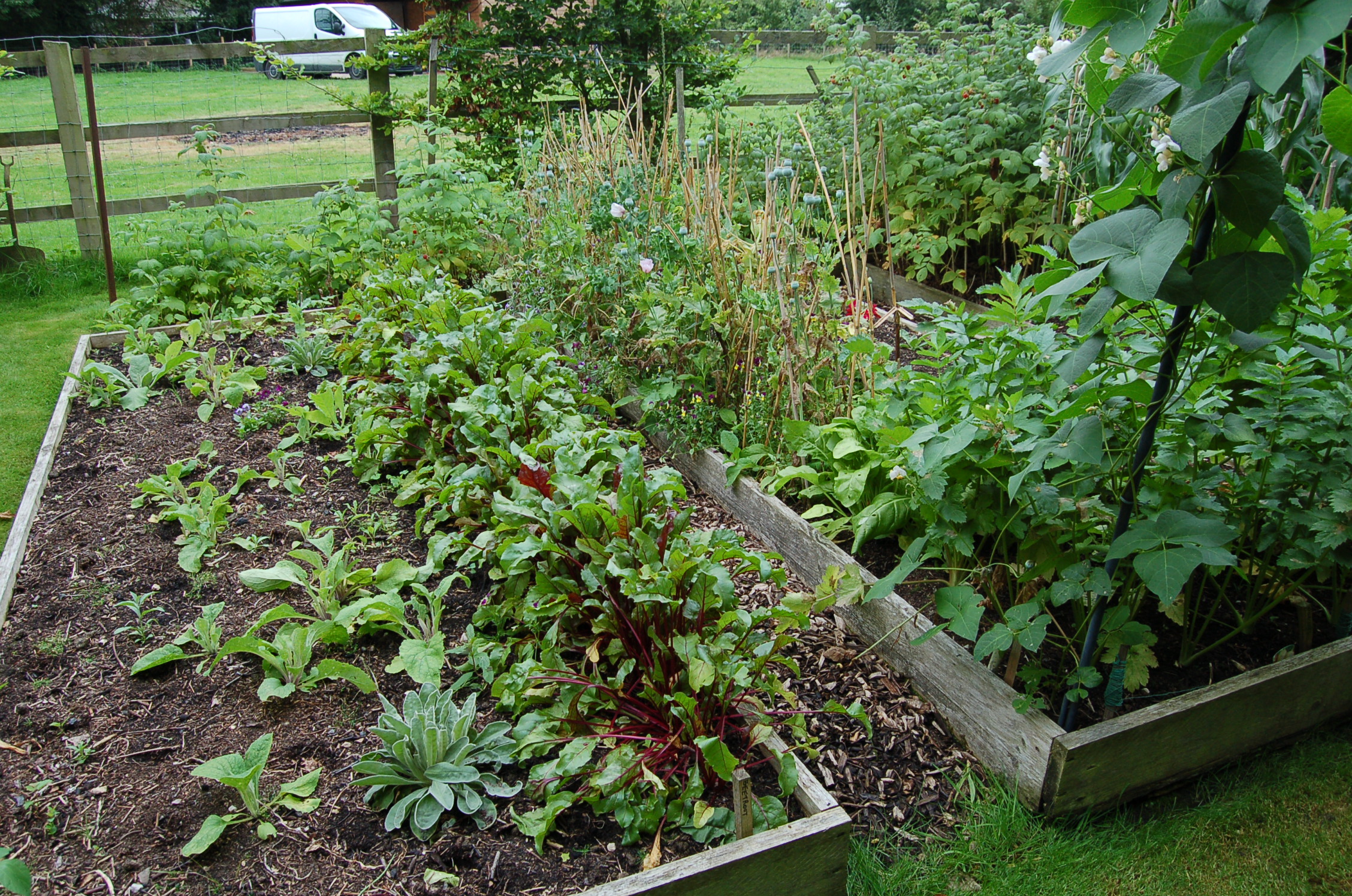 Reaching the bottom of the garden there is a native hedge decorated with soft pink dog roses. Looking back up towards the house we get a different view of the garden and notice a very productive veg patch with neat raised beds.