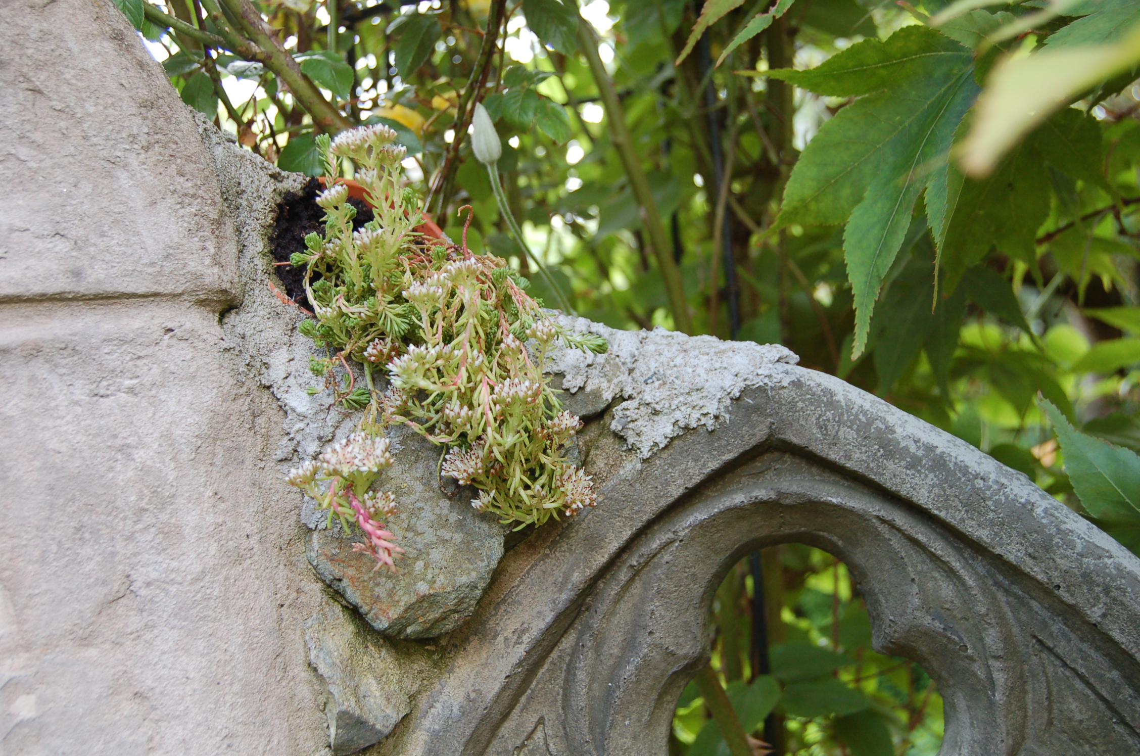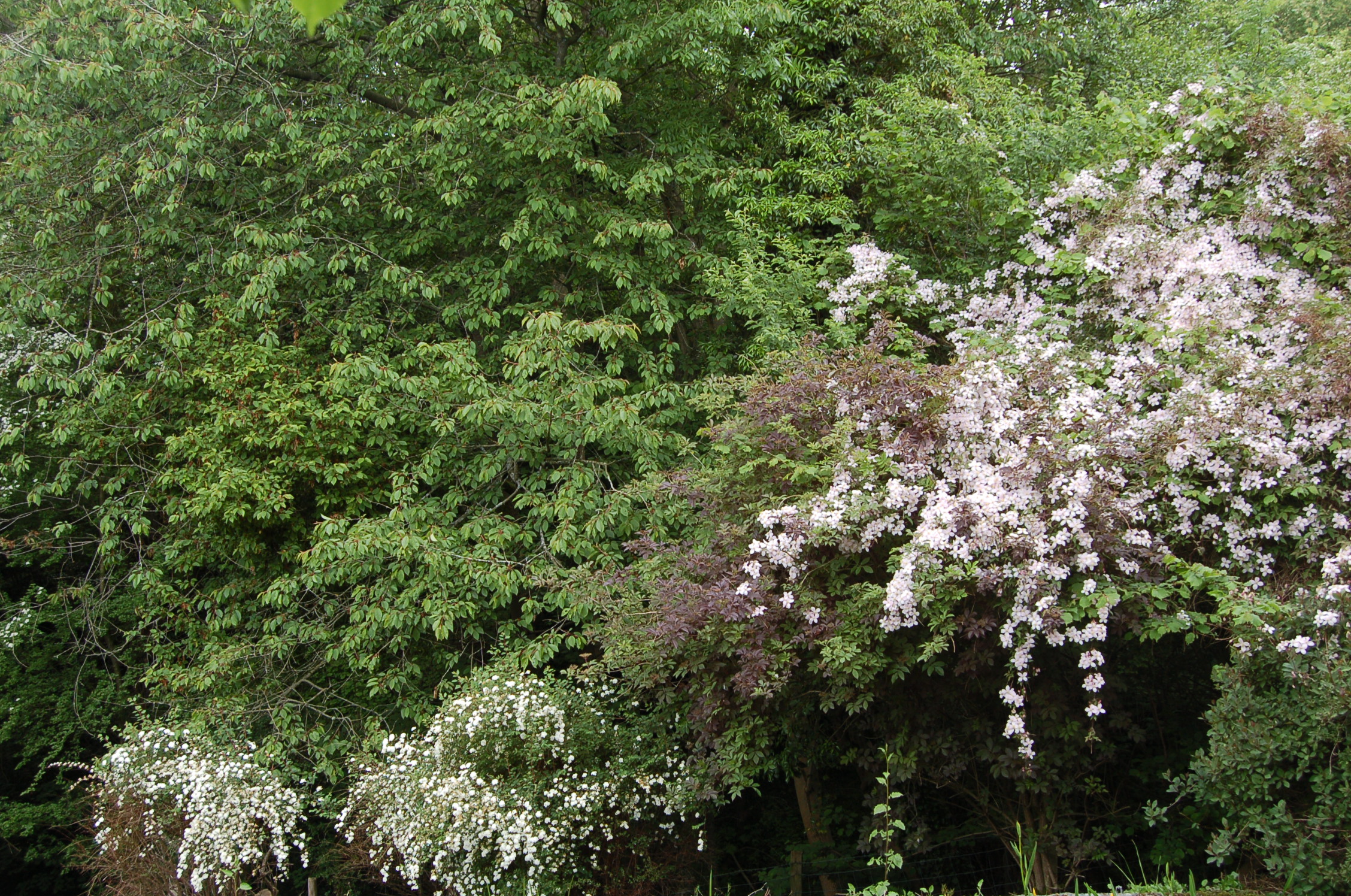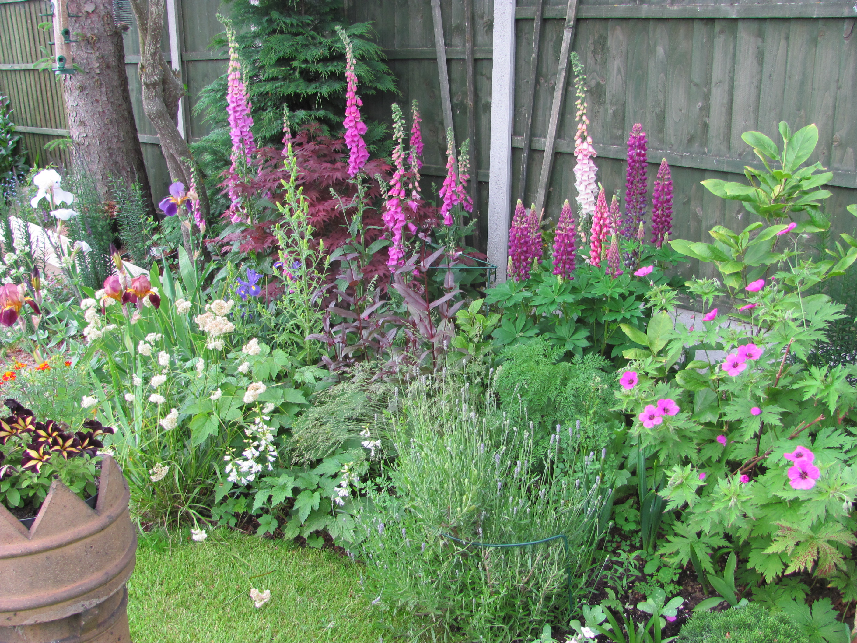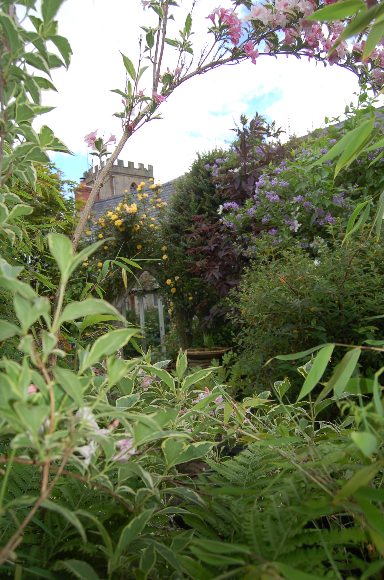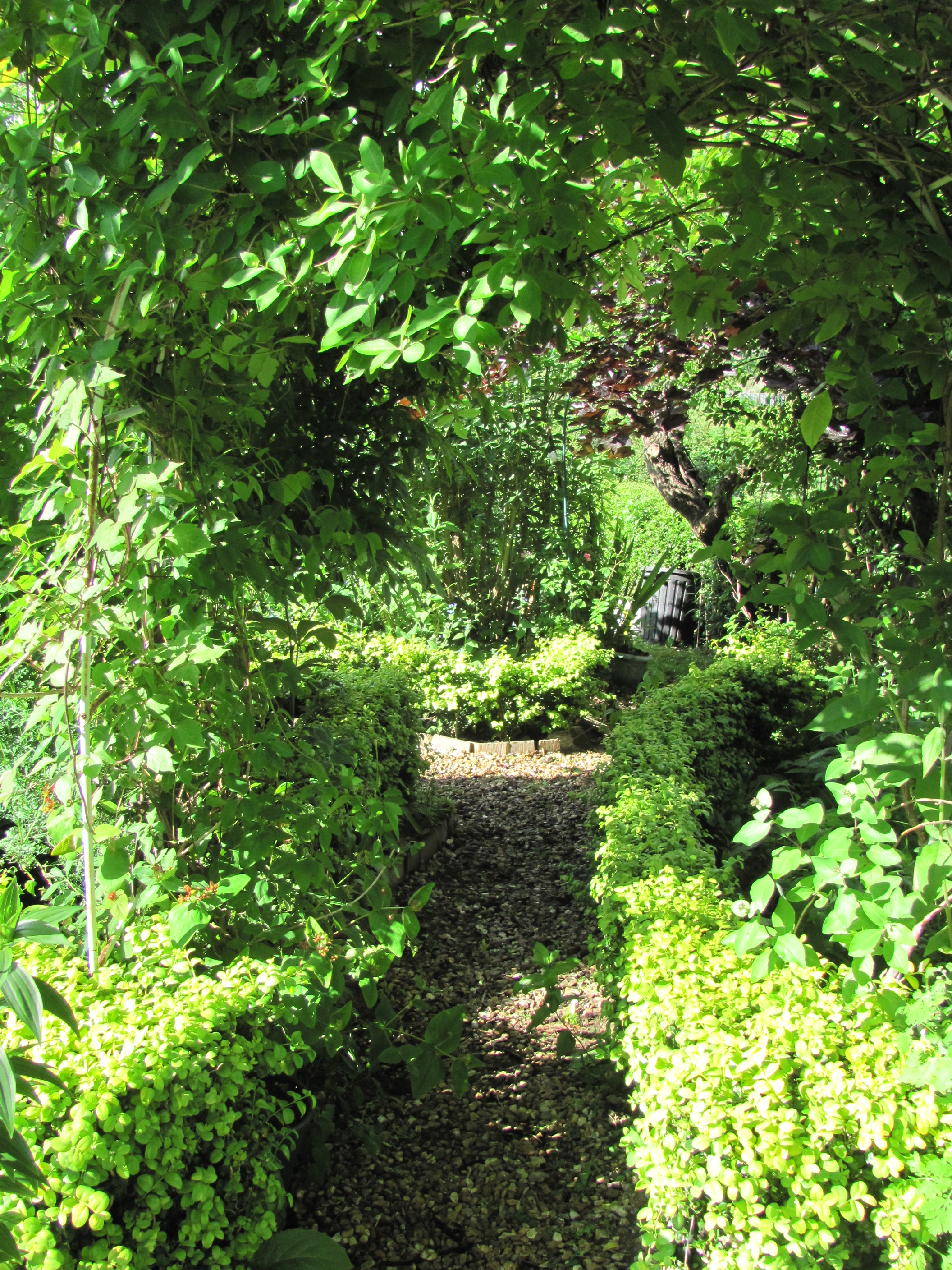 The narrow borders are full to the brim with interesting plants and any vertical surface covered in climbers especially clematis and roses, many of which are richly scented.