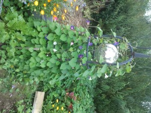 Wendy’s plot is always full of interest and at the moment the star of the show has to be the glitter ball hanging inside an obelisk up which is growing Morning Glory.