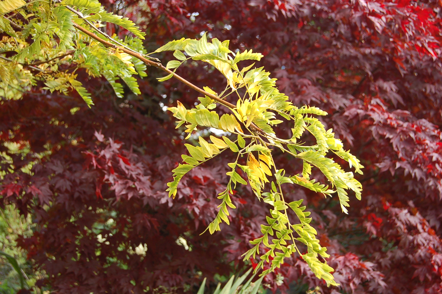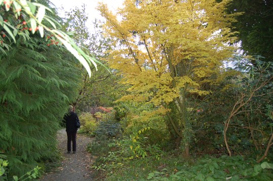 Strong contrasts in foliage colour show up in the brighter weather as we work our way back up the paths to the gate.