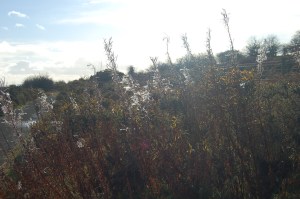 The walk up to the ridge is a steep but wide grass path, shorn short by the resident ponies and cattle. From the gate at the bottom it looks a long way up. It looked even longer when we realised that we had left our flask of coffee at hom!. It was a bright day but there was a cold biting wind so we wrapped up well and set off. It looked much brighter than the day when we recently tackled the walk along the Stapeley Hill ridge.